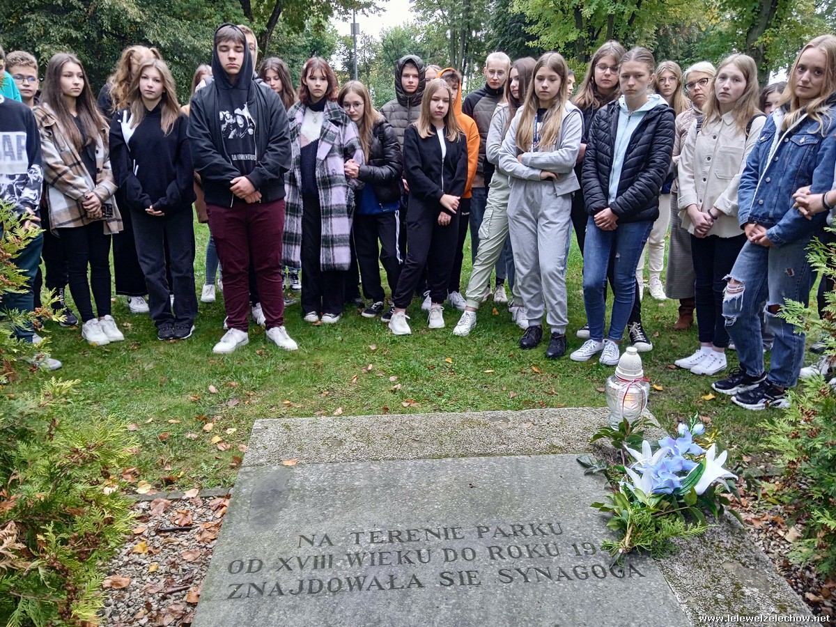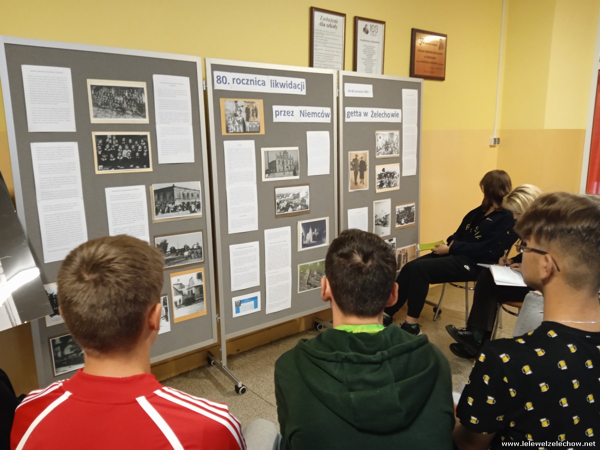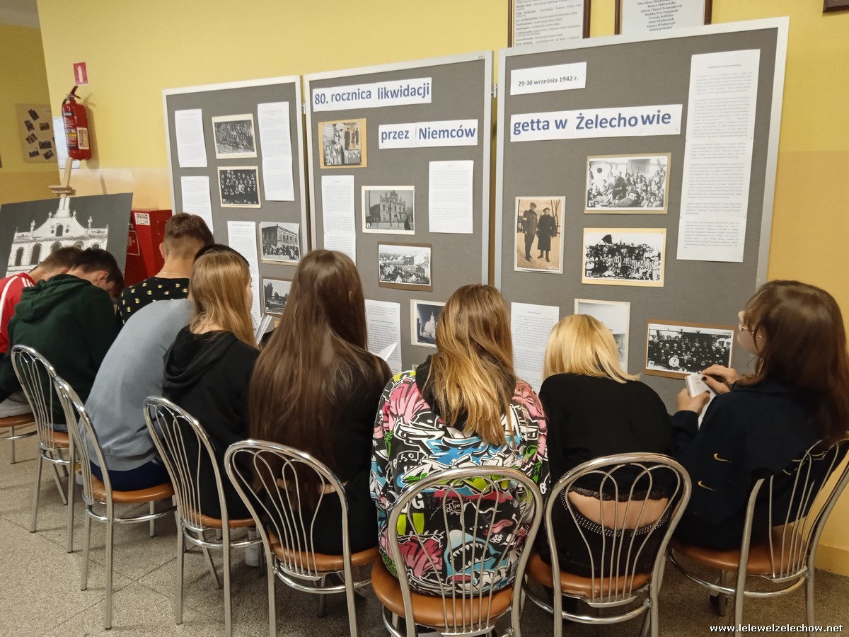 Z okazji 80.rocznicy likwidacji przez Niemców żelechowskiego getta uczniowie liceum w ramach przedmiotów historia i teraźniejszość oraz historia, zostali zapoznani z przeszłością ludności żydowskiej w Żelechowie. Klasy 1a, 1b i 2b miały okazję zapoznać się z materiałami poświęconymi tej społeczności zaprezentowanymi na wystawie usytuowanej w holu szkoły. Uzyskali z nich szereg informacji oraz obejrzeli nieznane sobie fotografie sprzed lat. Klasa 1c oraz grupa 1b udały się natomiast do miejscowego parku, tam gdzie kiedyś stała synagoga i przy tablicy upamiętniającej ten fakt chwilę się zatrzymali oraz złożyli kwiaty i zapalili znicz. Następnie klasa 1c udała się na miejscowy kirkut, gdzie dzięki uprzejmości opiekunki cmentarza mogła wejść na jego teren, obejrzeć zachowane macewy oraz współczesny ohel. W wyznaczonym miejscu uczniowie złożyli kwiaty i zapalili znicz oraz uczcili pamięć pomordowanych przez Niemców współmieszkańców naszego miasta minutą ciszy. Inicjatorką tych działań była nauczycielka historii - pani Urszula Kobielus.