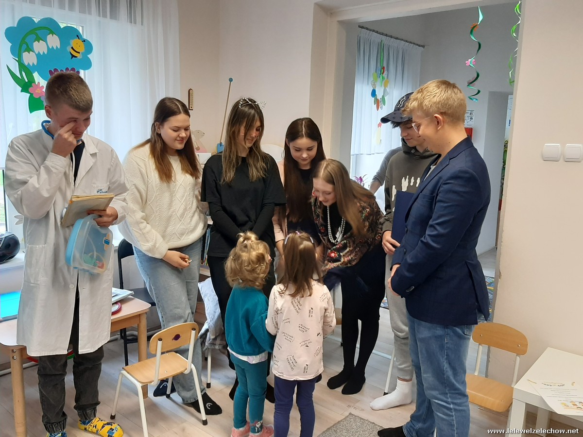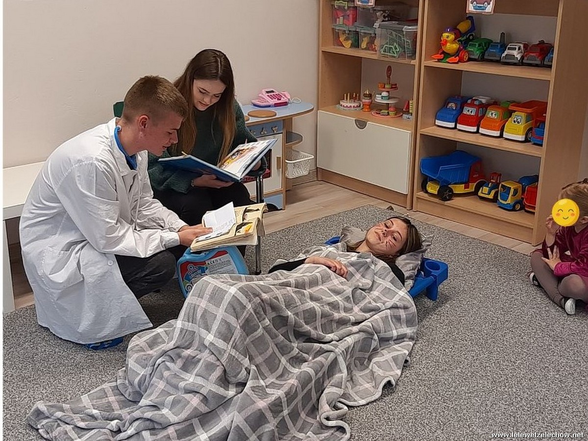 Nieco ucharakteryzowani i zaopatrzeni w odpowiednie gadżety licealiści pod opieką p. Magdaleny Woźniak zaprezentowali maluszkom następujące wiersze polskich poetów: „Chory kotek” Stanisława Jachowicza, „Naprawimy misia” Czesława Janczarskiego oraz „W aeroplanie”, „O Grzesiu kłamczuchu i jego cioci”, „Okulary” „Spóźniony słowik” Juliana Tuwima. Trzylatki słuchały i obserwowały nas z niezwykłą uwagą. Mamy nadzieję, że nasze interpretacje podobały się przedszkolakom. Na zakończenie spotkania wymieniliśmy się drobnymi upominkami. Dziękujemy „Żabkom” i pani Anecie Szczęsnej z Publicznego Przedszkola „Pluszowy Miś” za zaproszenie do wspólnego czytania.