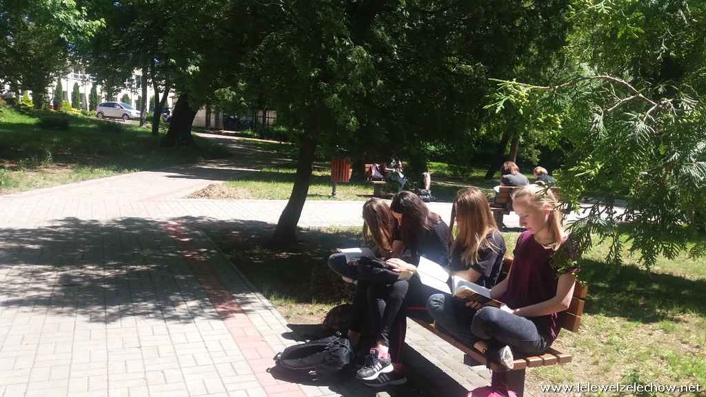 W dniach od 3 do 7 czerwca na długiej przerwie chętni nauczyciele i uczniowie zbierali się w szkolnych alejkach, aby czytać przyniesione dzieła literackie. Pogoda sprzyjała. Przyjemnie było schronić się w cieniu drzew i krzewów, aby na kilkanaście minut oddać się magicznej czynności, jaką jest czytanie. Celem akcji było propagowanie czytania, zwrócenie uwagi na to, że w naszym społeczeństwie jest wiele osób, które cenią czas spędzony z lekturą. Organizatorką akcji jest p. Magdalena Woźniak.
