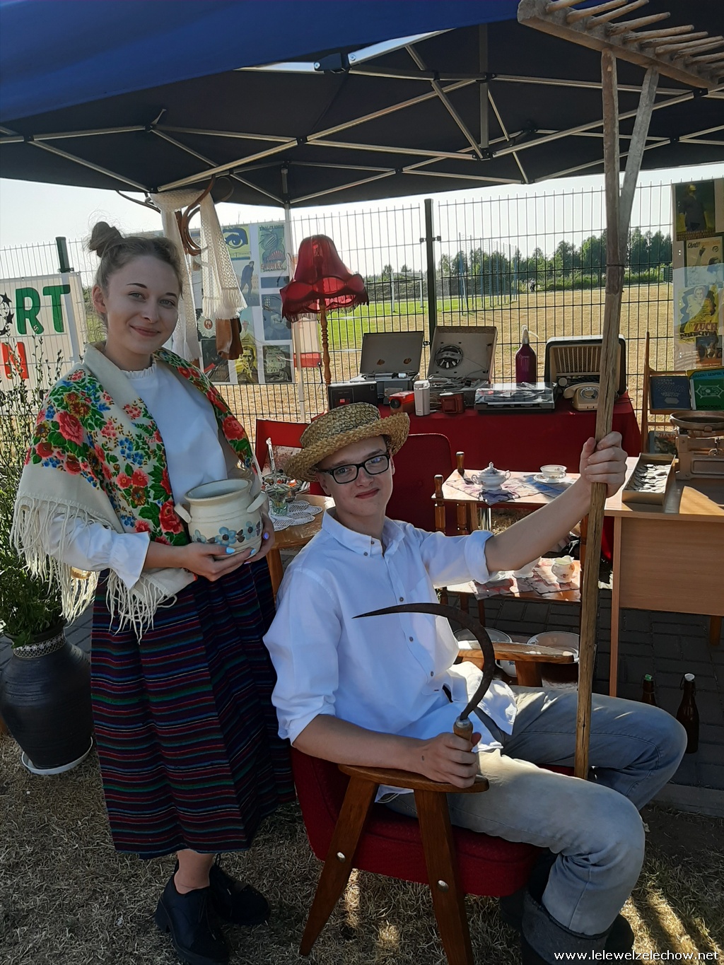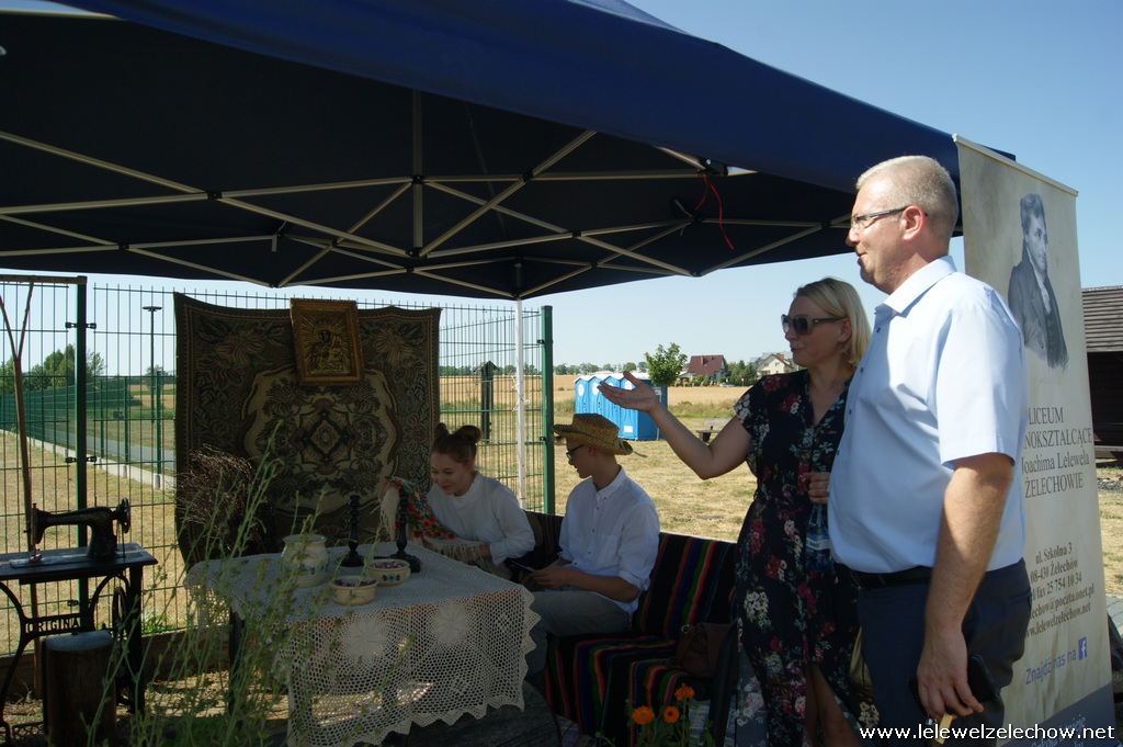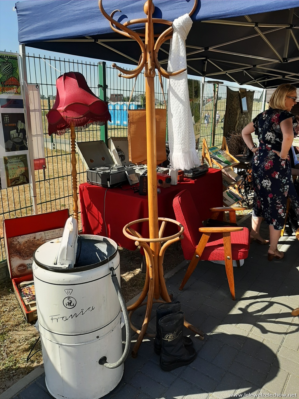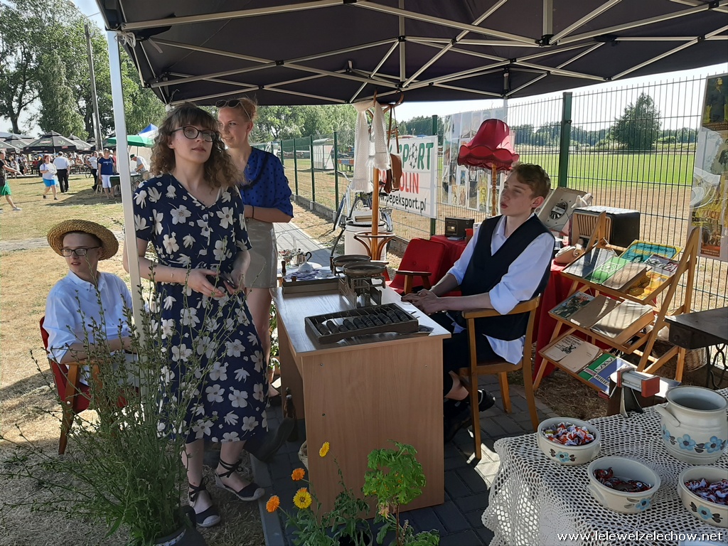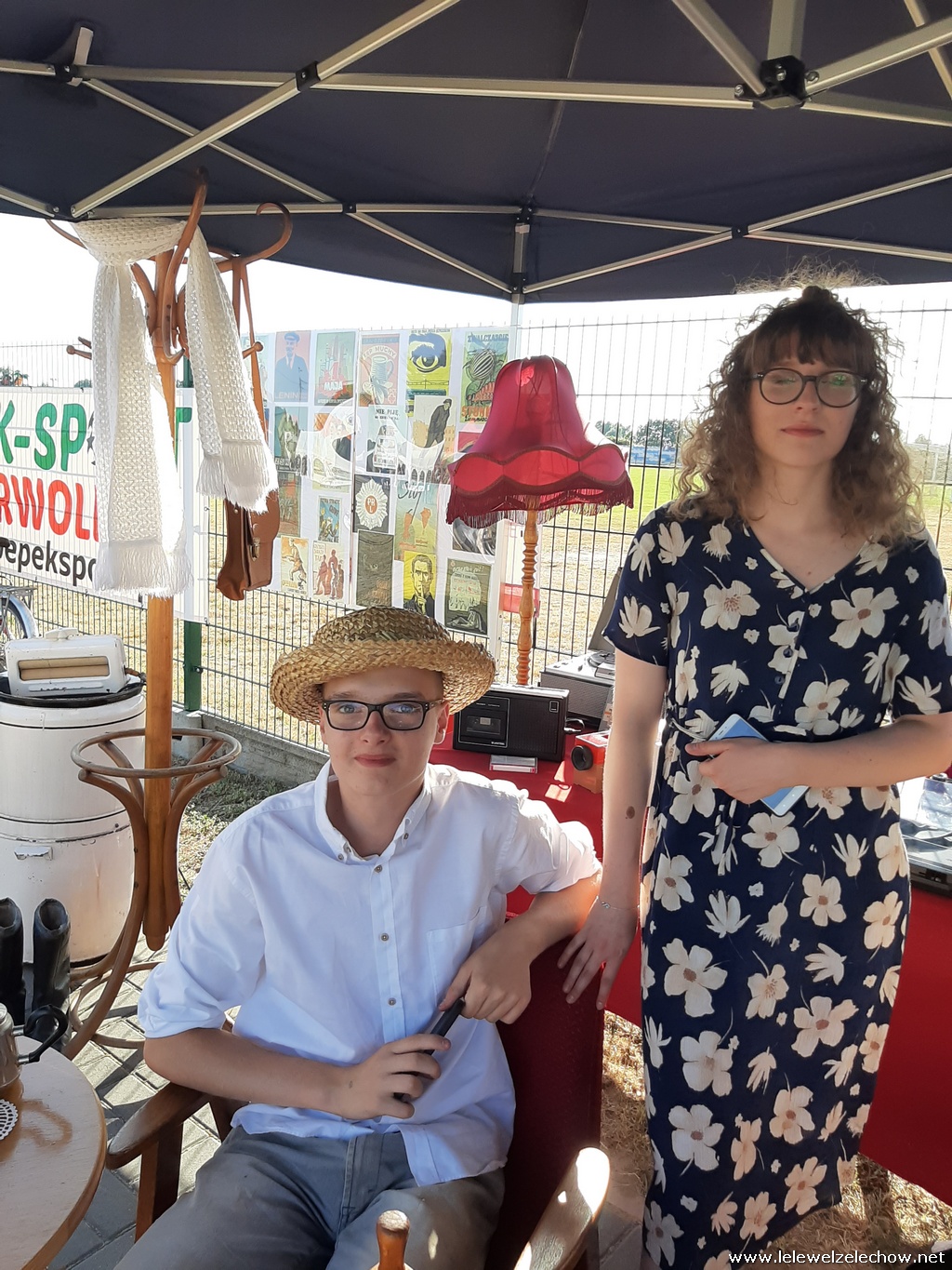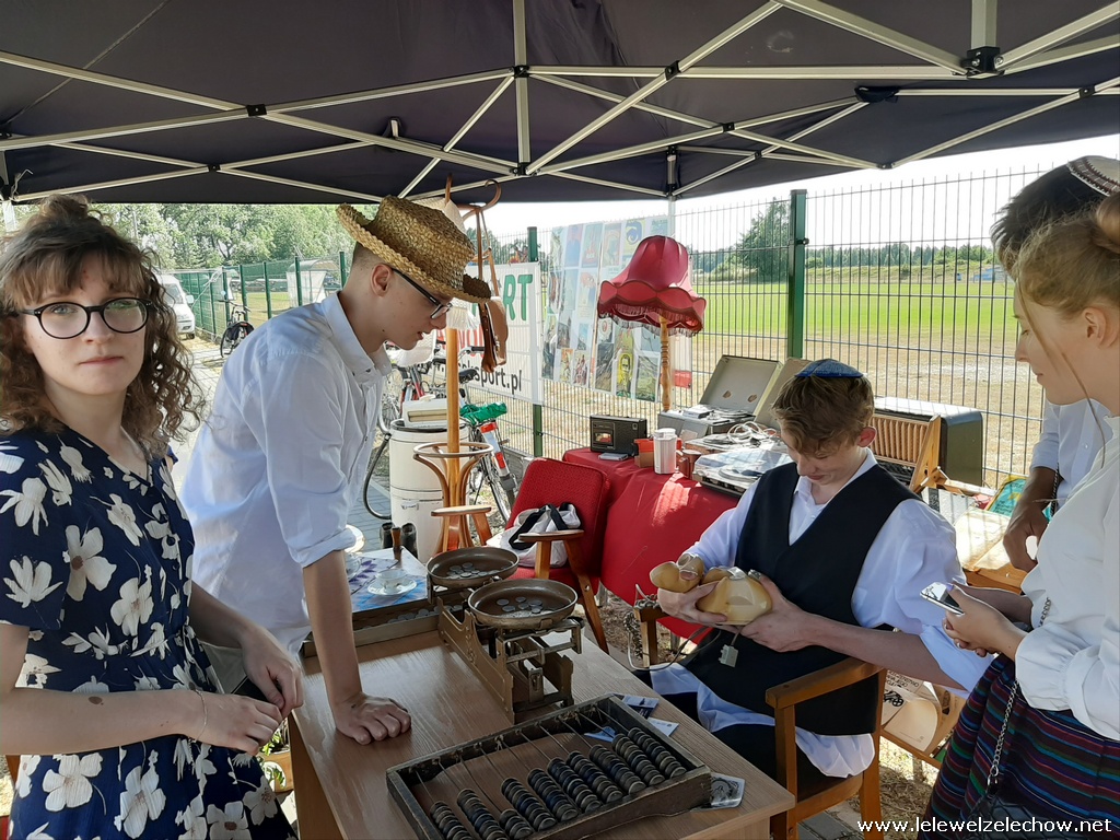 Dni Żelechowa i nasza wystawa przedmiotów codziennego użytku z XX w. Wśród nich znalazła się maszyna do szycia ,,Singer" (?), pralka ,,Frania", płyty analogowe, kasety magnetofonowe, stare monety, telefon, liczydła i wiele, wiele innych. Wystawę podzieliliśmy na część wiejską, część miejską i część handlową. Każdy z uczniów dopasował się strojem do danej strefy. Mimo upału dzielnie stali na swoich stanowiskach sami również się bawiąc. Wystawa cieszyła się zainteresowanie dorosłych i dzieci. Wśród odwiedzających znalazł się także Burmistrz Żelechowa Łukasz Bogusz oraz ...pani Halina Frąckowiak, która została obdarowana przez nas jednym z eksponatów, który sobie wypatrzyła.