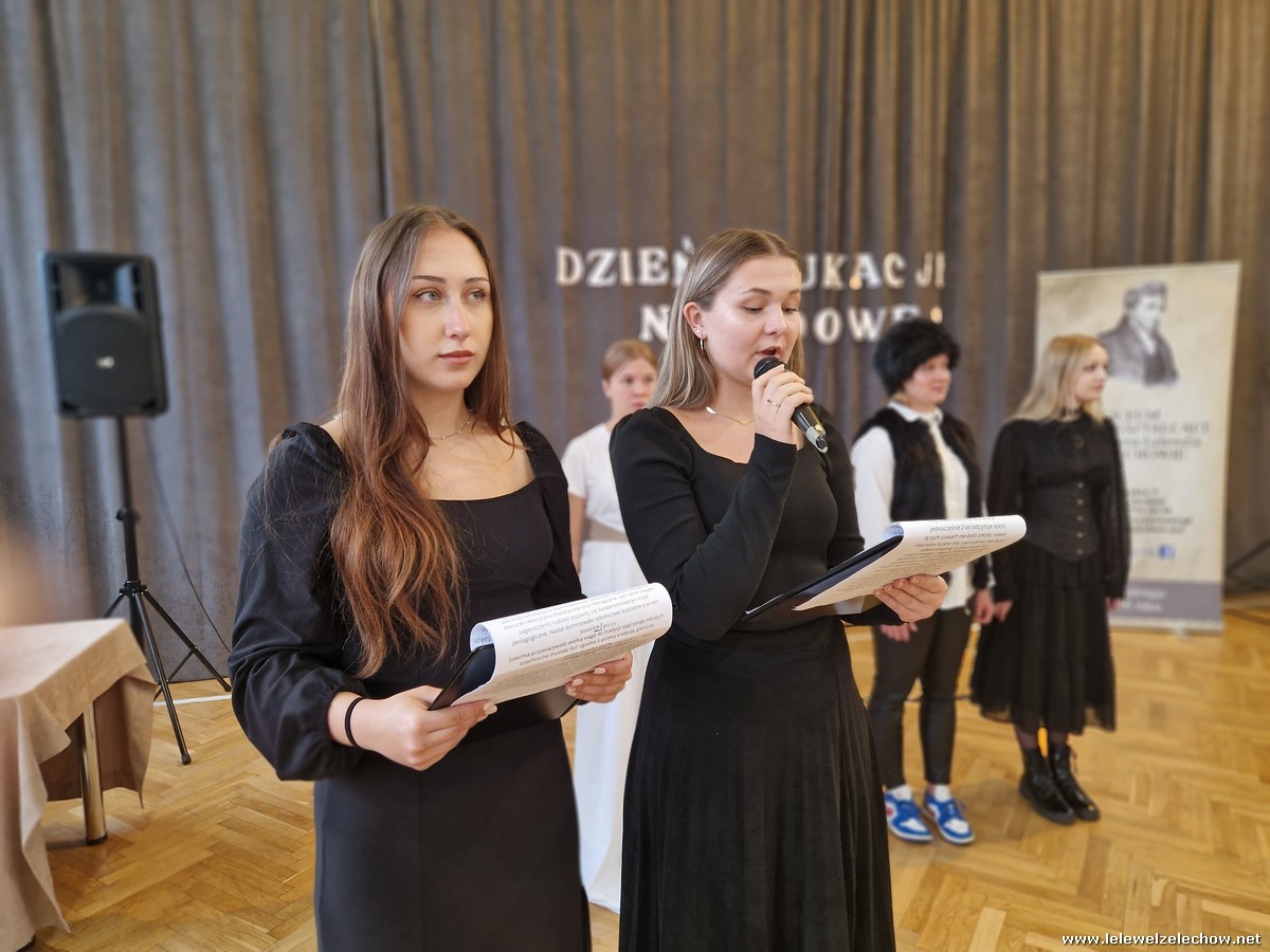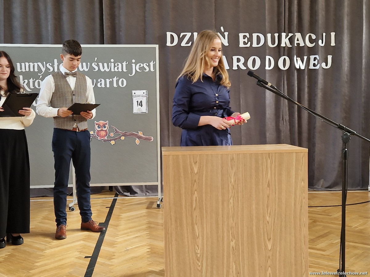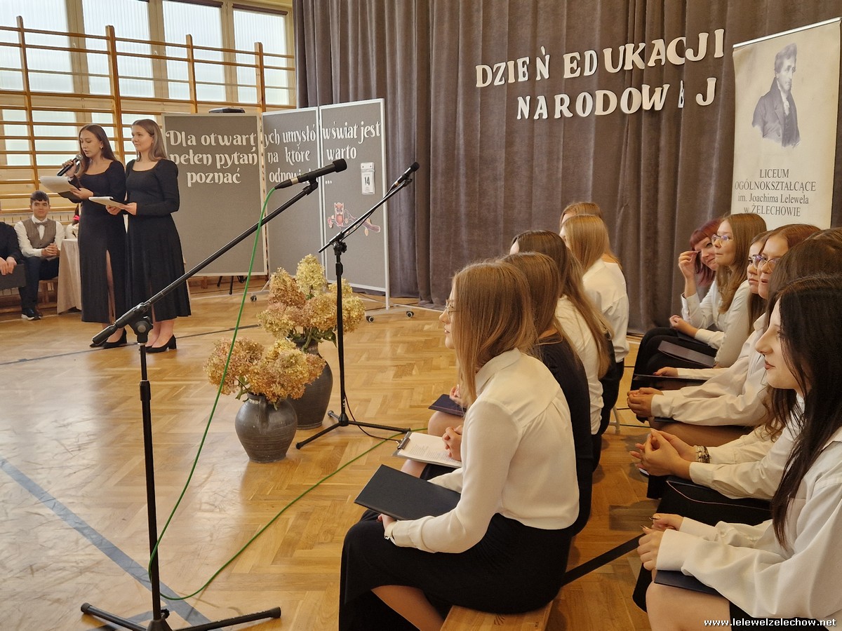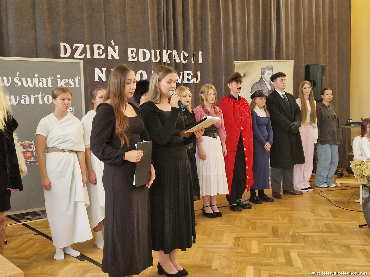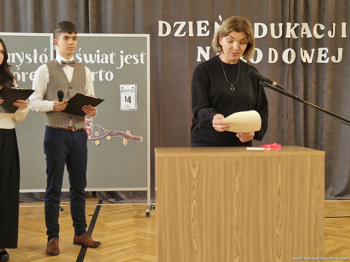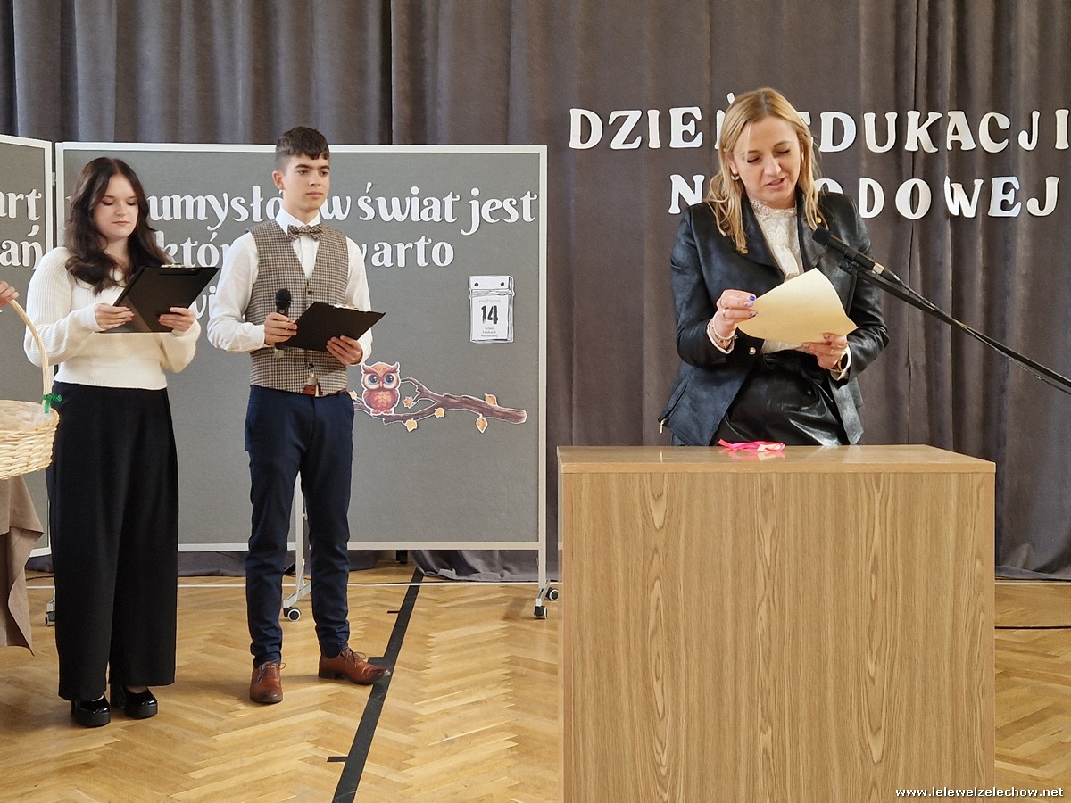 Uczniowie w zabawny sposób zaprezentowali dzieje szkolnictwa oraz wręczyli nauczycielom wyróżnienia w różnych dziedzinach życia szkolnego. Program ubogaciły piosenki. Na zakończenie uroczystości przedstawiciele Samorządu Uczniowskiego złożyli życzenia, wręczyli kwiaty oraz spersonalizowane, okolicznościowe kartki.