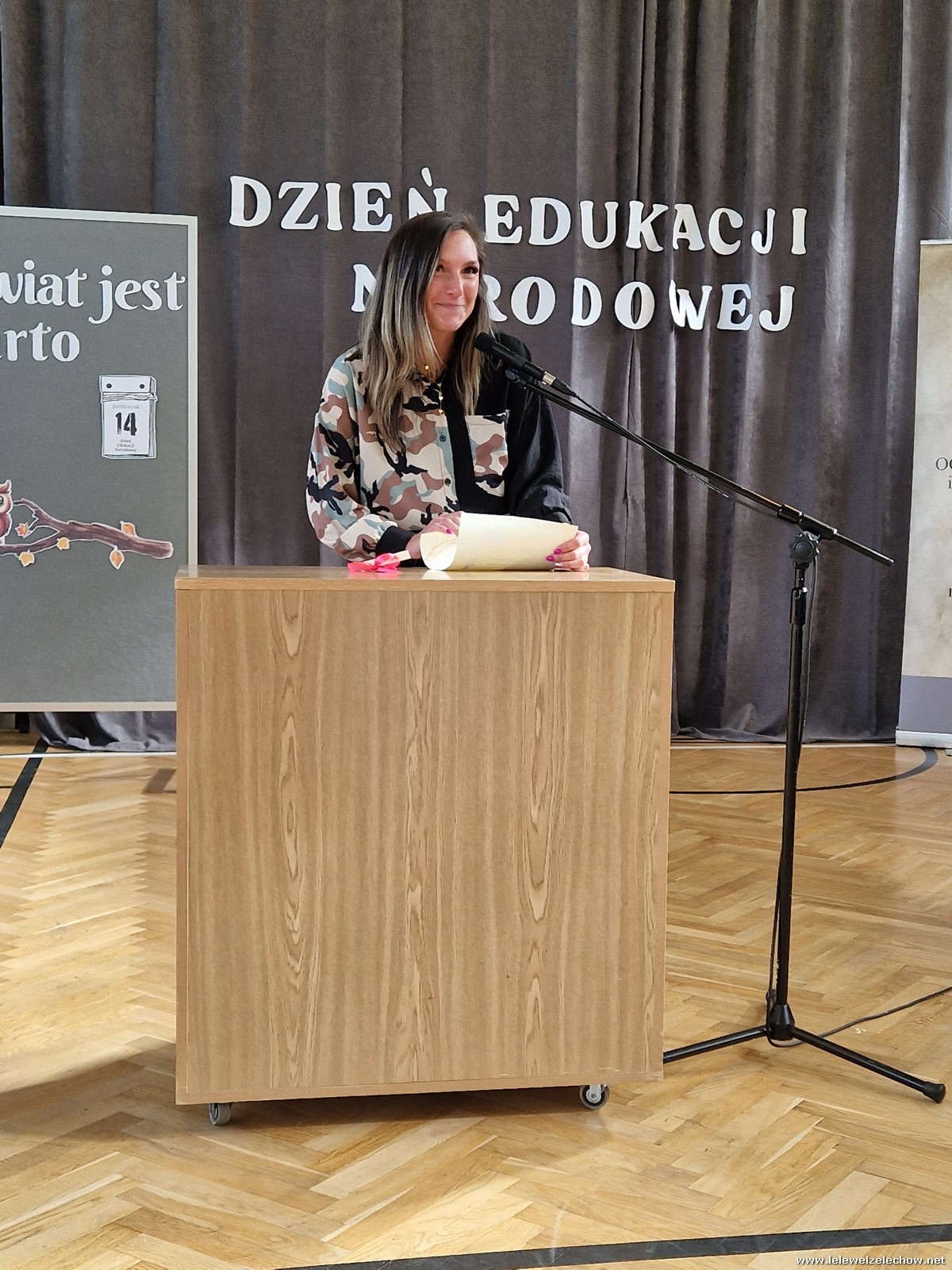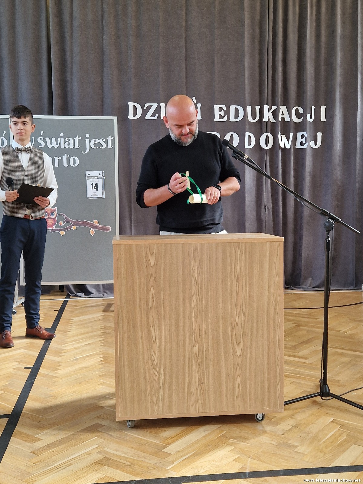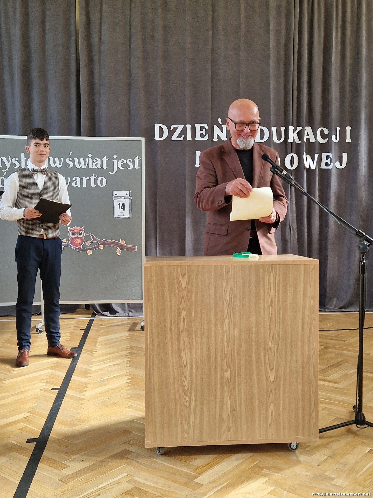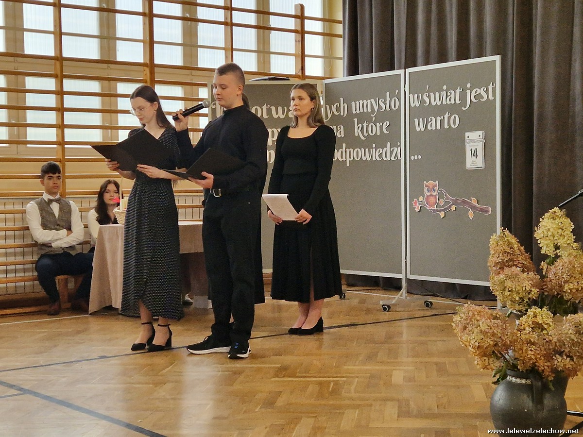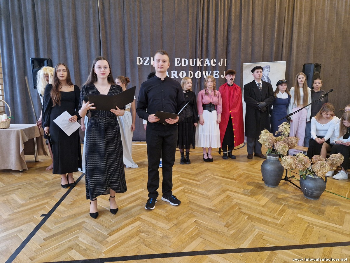 Uczniowie w zabawny sposób zaprezentowali dzieje szkolnictwa oraz wręczyli nauczycielom wyróżnienia w różnych dziedzinach życia szkolnego. Program ubogaciły piosenki. Na zakończenie uroczystości przedstawiciele Samorządu Uczniowskiego złożyli życzenia, wręczyli kwiaty oraz spersonalizowane, okolicznościowe kartki.
