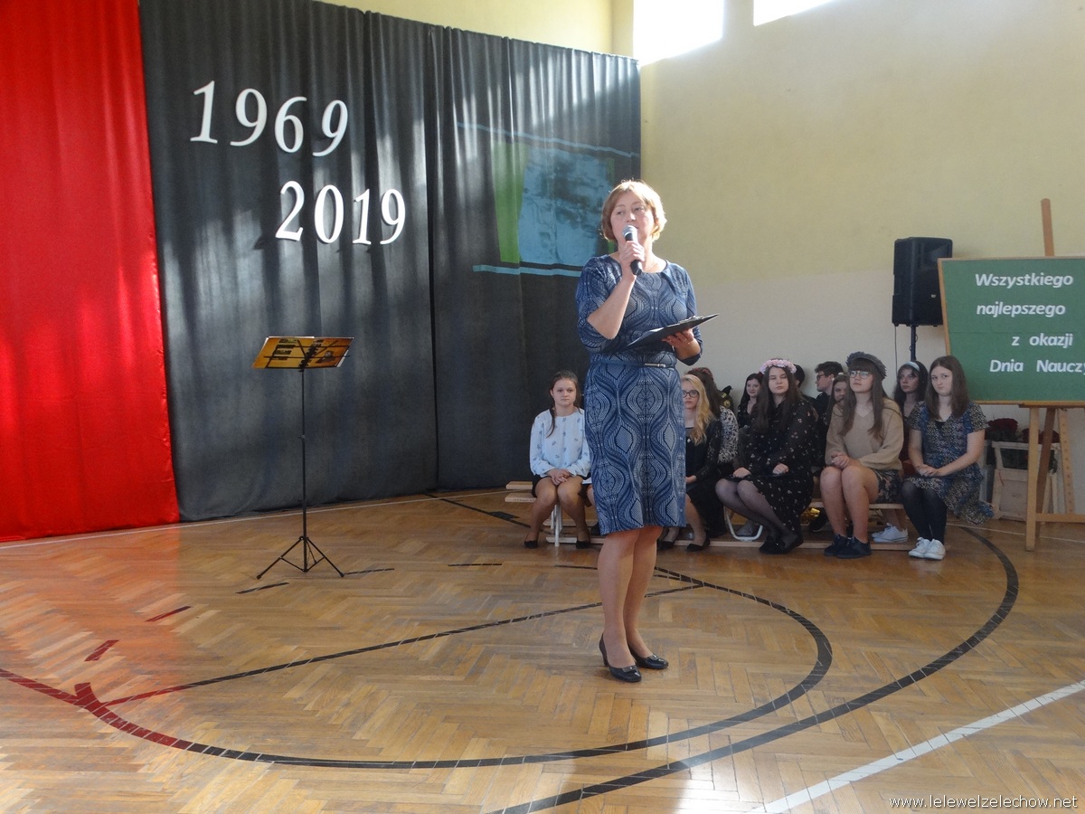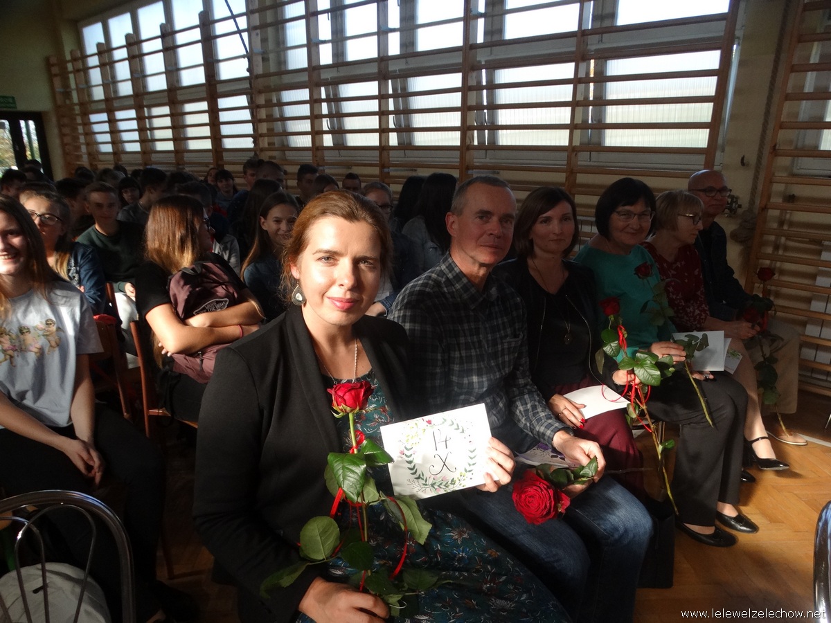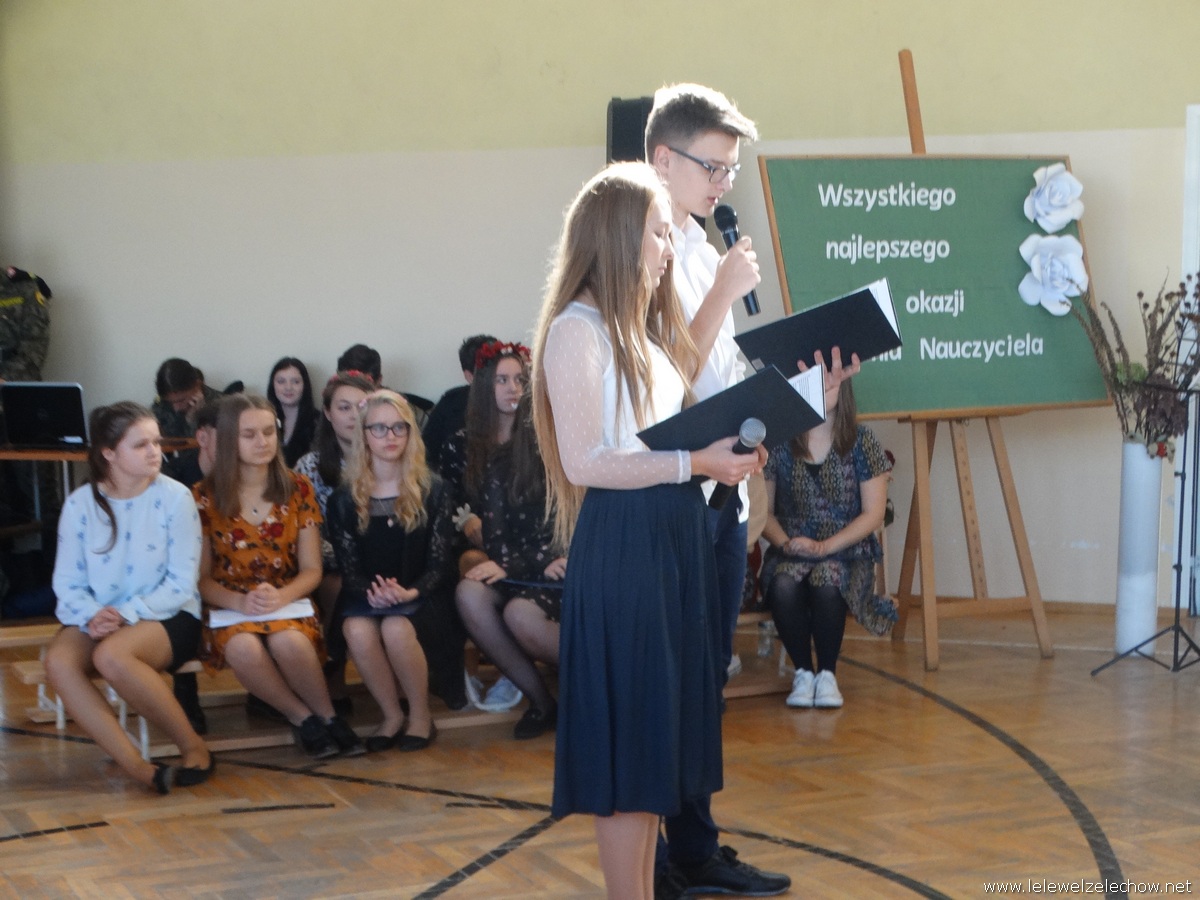 Tegoroczny Dzień Nauczyciela przygotowali uczniowie klas I i II pod kierunkiem pani Katarzyny Muchy. Sympatyczny koncert życzeń stanowiły oryginalne życzenia dla nauczycieli i pracowników szkoły przeplatane piosenkami w wykonaniu naszych nowych i dobrze już znanych talentów. Uzupełnieniem życzeń były pamiątkowe kartki przygotowane przez uczennice klas III – Agatę i Weronikę.