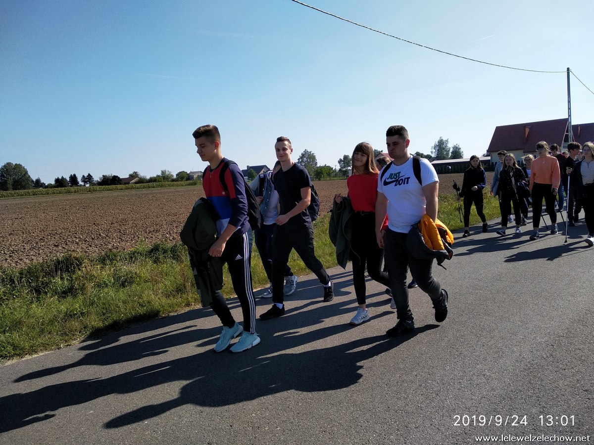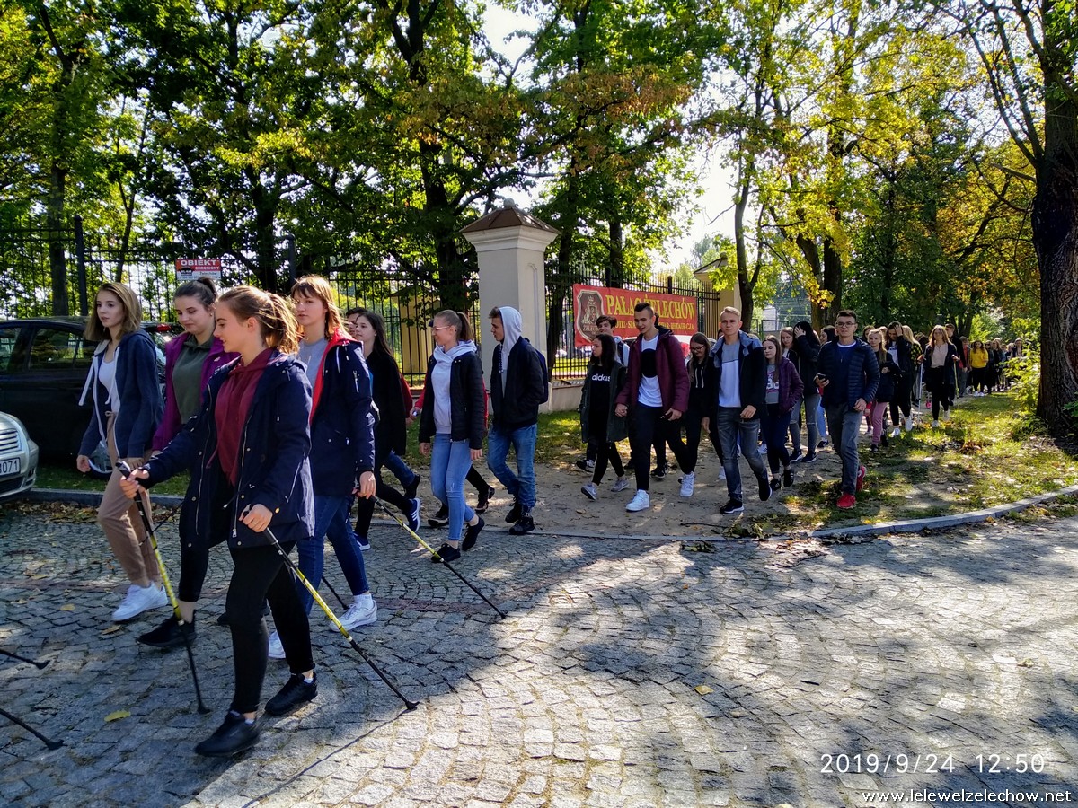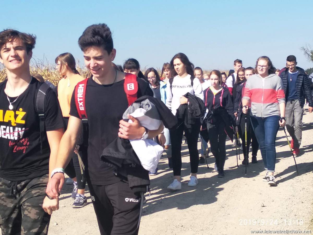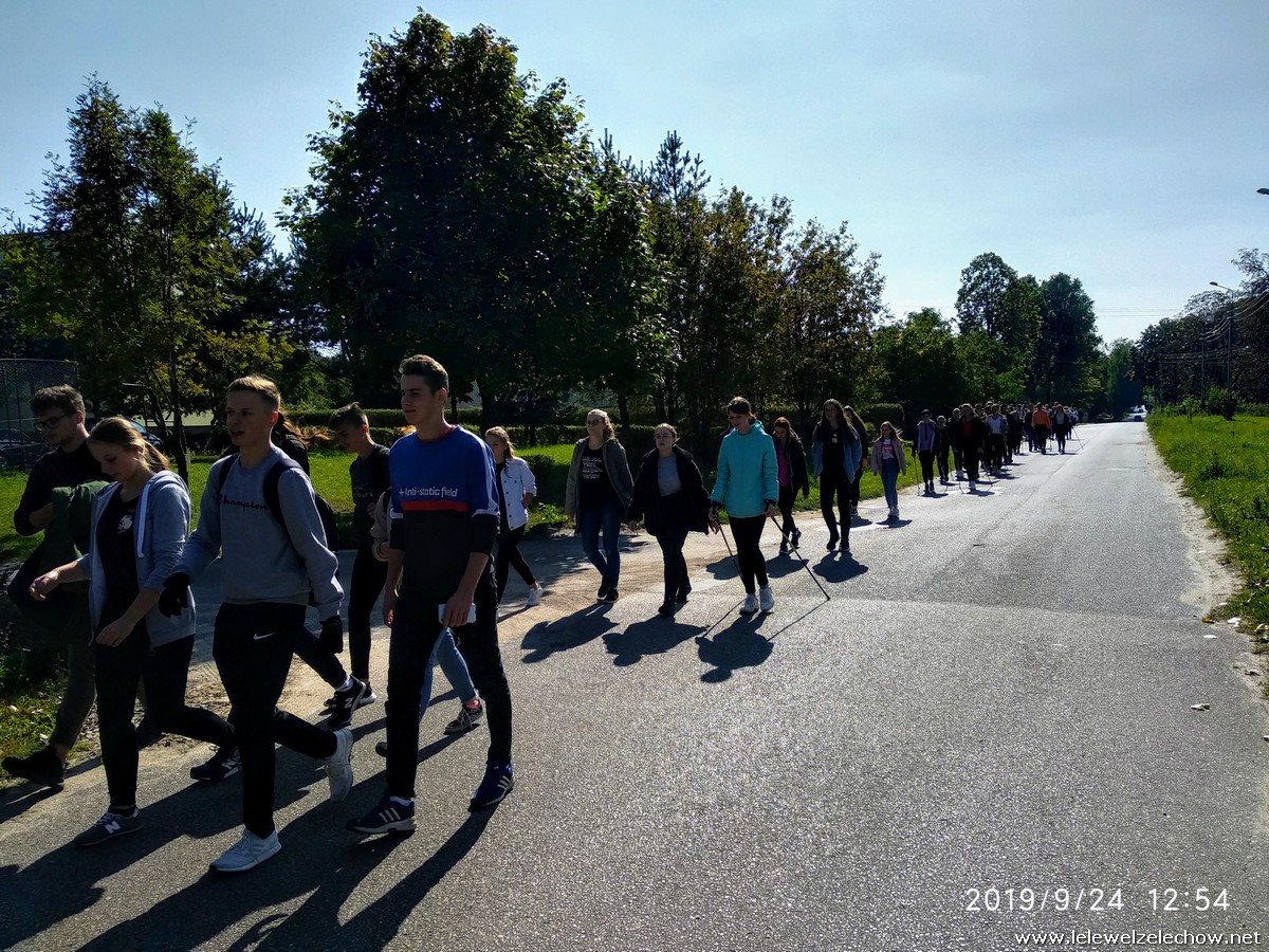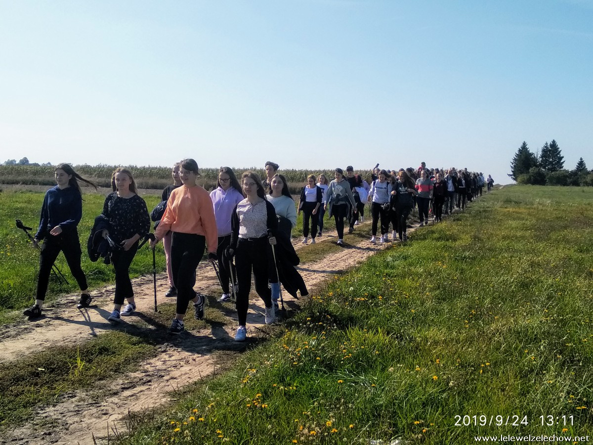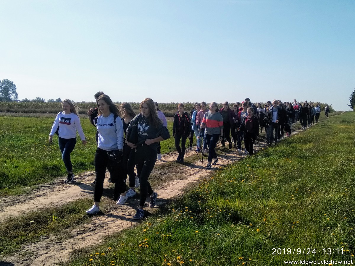 Marsz nordic walking, w trasę którego wyrusza ponad połowa szkoły. Ok. 100 uczniów pod opieką nauczycieli: Joanny Włodarczyk, Anetty Dziak, Joanny Baranieckiej, Andrzeja Głodka i ks. Leszka Mućki przemierza dystans 5 km. Kto nie miał kijów do nordic walkingu oczywiście mógł iść bez nich.