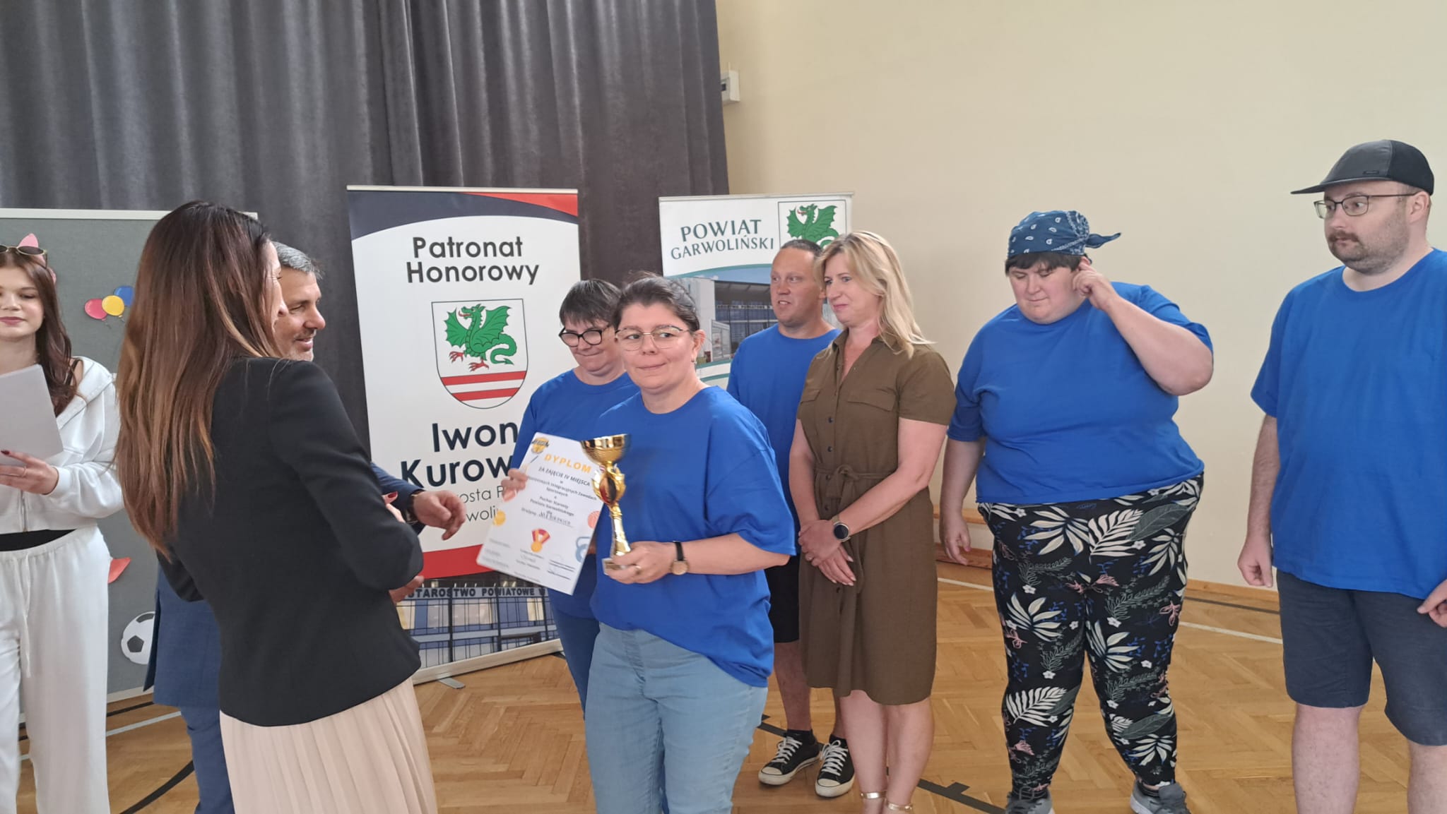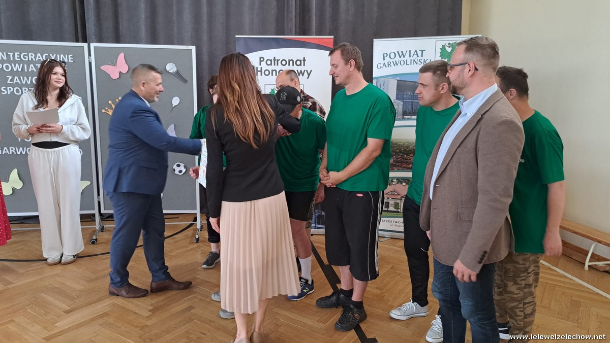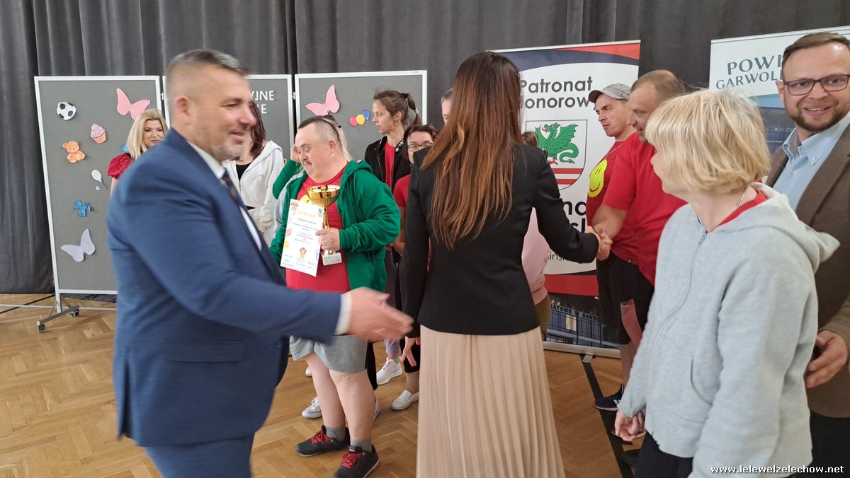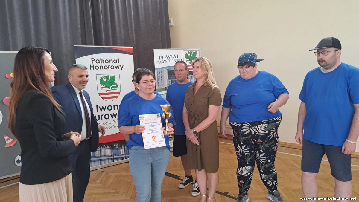 Po zawodach Pani Iwona Kurowska Starosta Powiatu Garwolińskiego i Pan Mirosław Walicki Wicestarosta Powiatu Garwolińskiego wręczyli dyplomy i nagrody rzeczowe. Pani Starosta pogratulowała udziału w zawodach sportowych i złożyła najgłębsze wyrazy uznania za postawę, determinację i ducha walki wszystkim zaangażowanym. Podkreśliła, że udział uczestników WTZ w zawodach to coś więcej niż rywalizacja — to piękne świadectwo siły charakteru, odwagi i nieustępliwości, pokazanie, jak można między sobą rywalizować, wspierać się oraz dopingować zawodników przeciwnych drużyn.