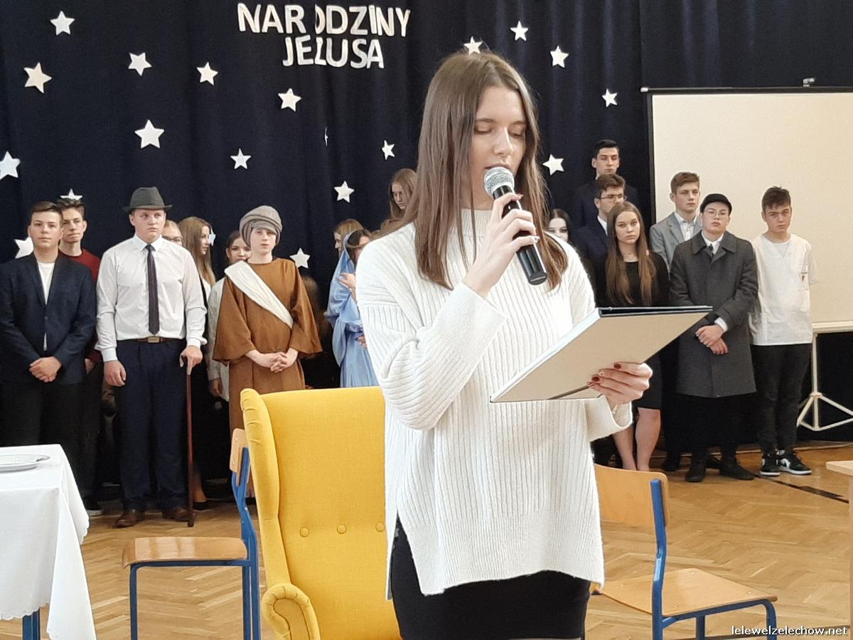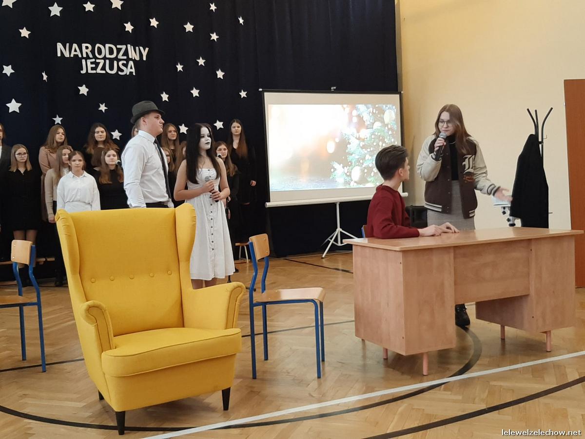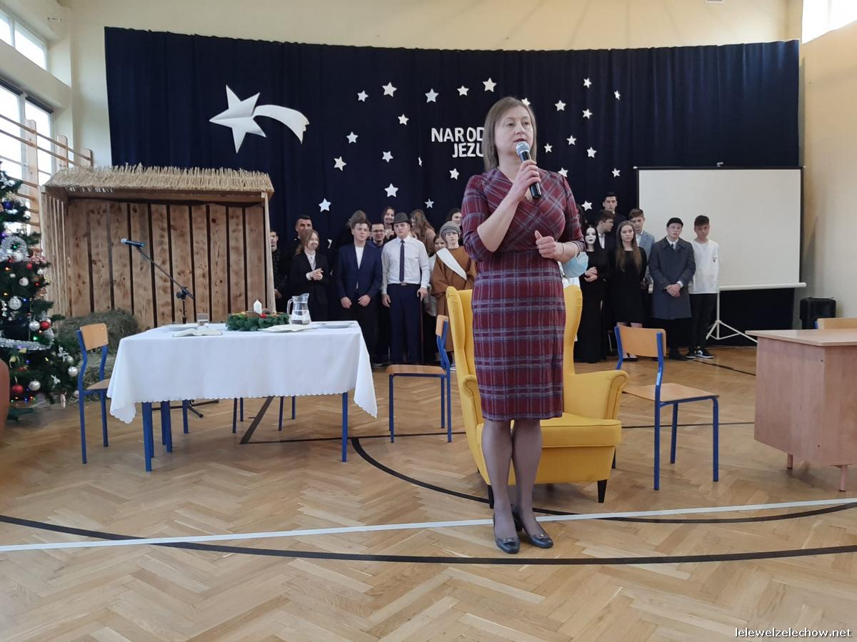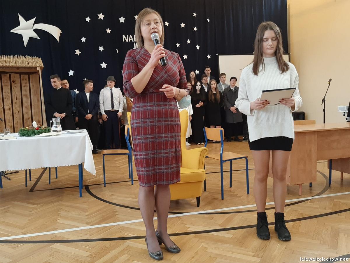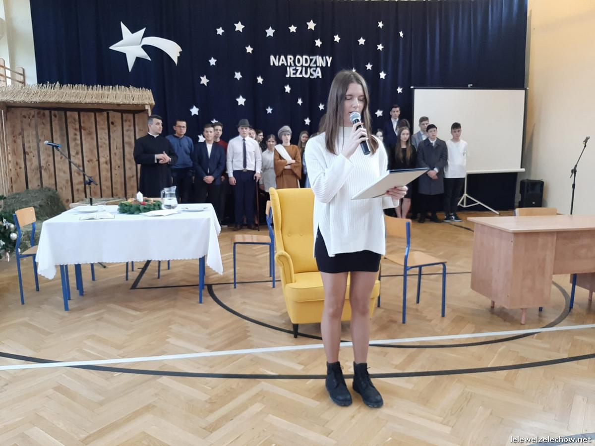 Przedstawienie dopełniały kolędy w niezwykłym wykonaniu Chóru Szkolnego oraz solistki Natalii Krawczyk. Zarówno pełne zaangażowania dialogi jak i przygotowana scenografia "wskazywały nam na to, co rzeczywiście jest najważniejsze w okresie świątecznym" jak powiedziała p. Dyrektor po przedstawieniu. Były również głębokie w swej treści życzenia dla uczniów, ich rodzin oraz pracowników szkoły od pani Dyrektor Sylwii Tomaszek oraz przewodniczącej Samorządu Uczniowskiego Patrycji Babiniec