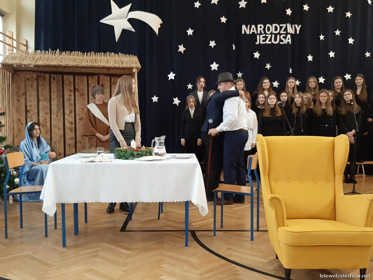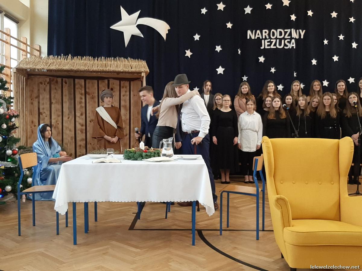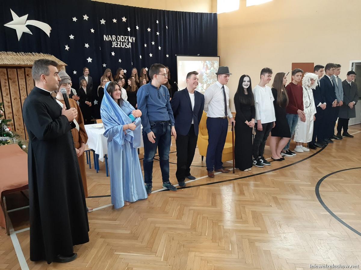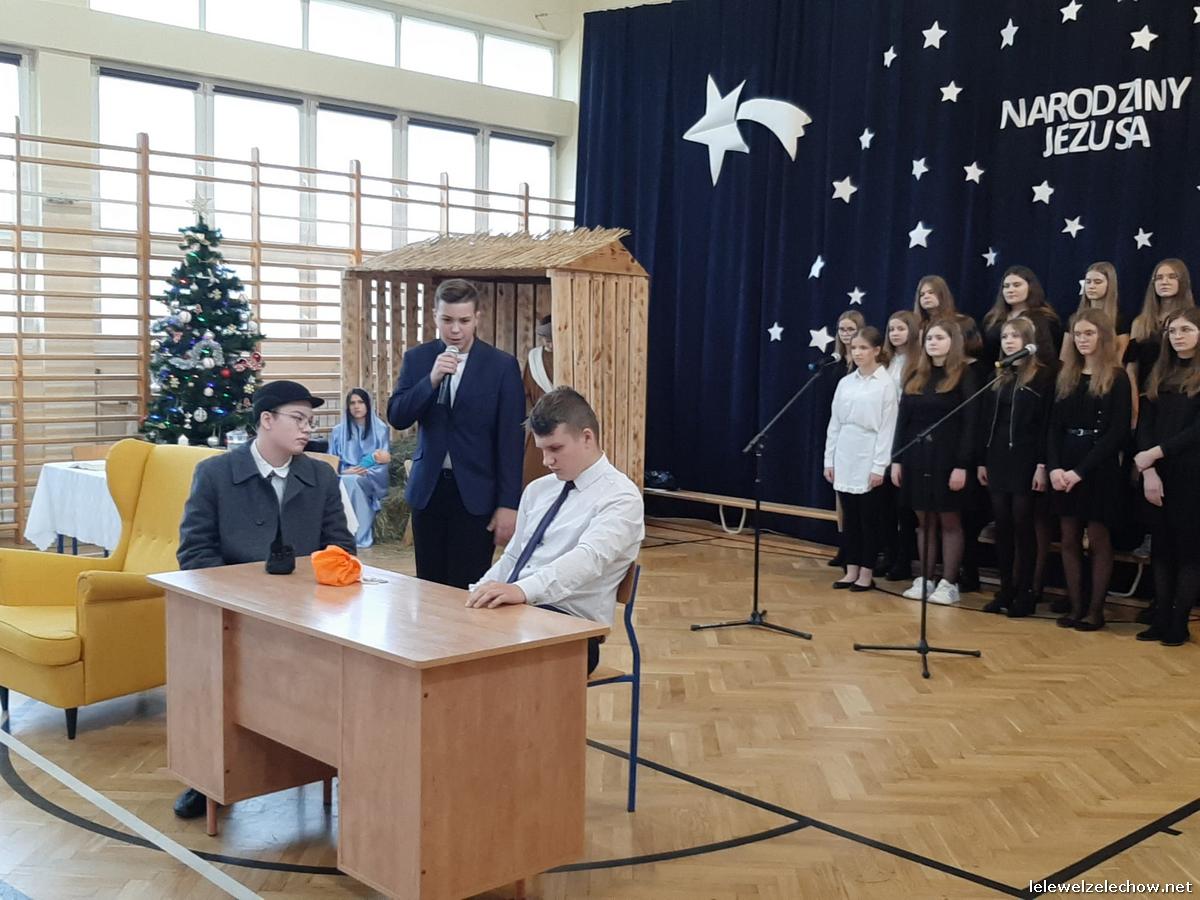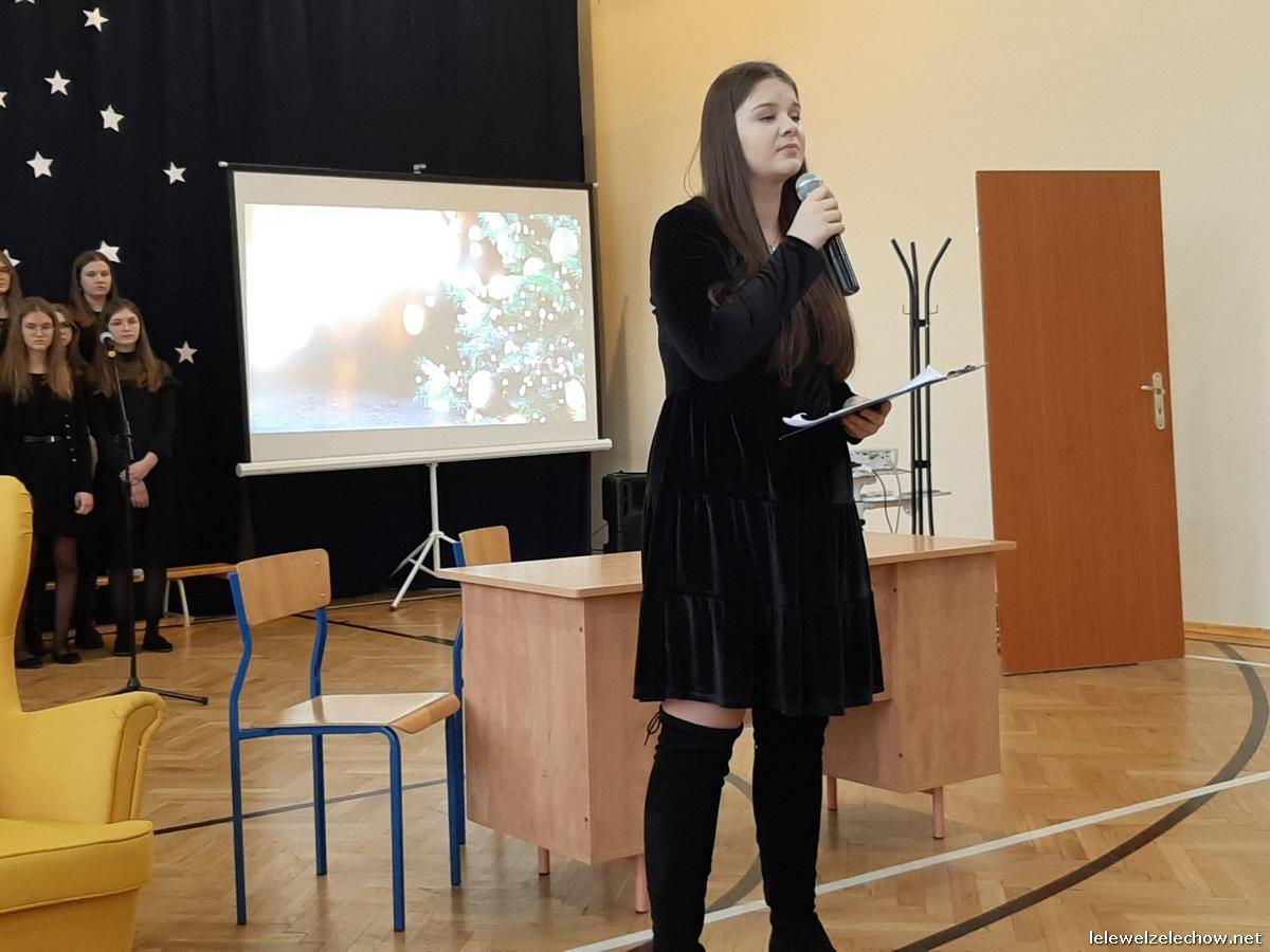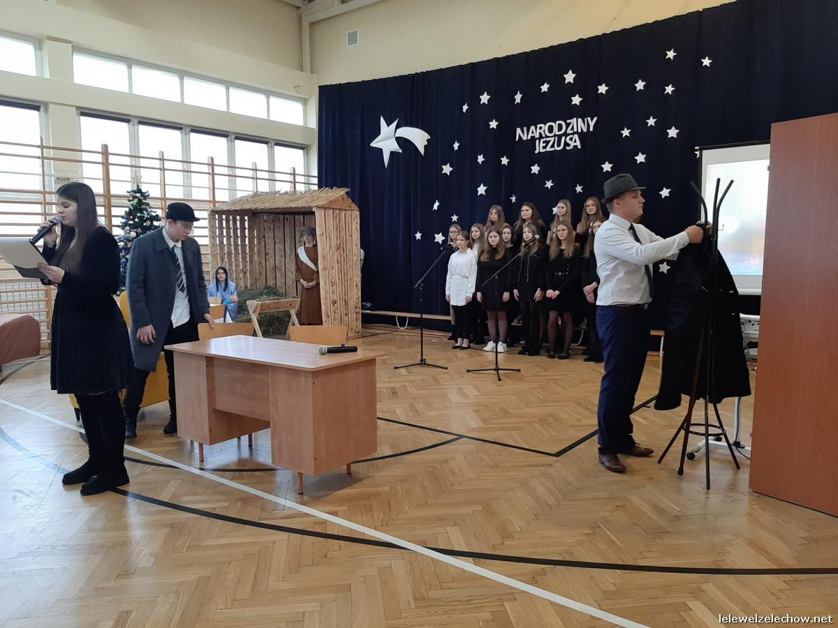Przedstawienie dopełniały kolędy w niezwykłym wykonaniu Chóru Szkolnego oraz solistki Natalii Krawczyk. Zarówno pełne zaangażowania dialogi jak i przygotowana scenografia "wskazywały nam na to, co rzeczywiście jest najważniejsze w okresie świątecznym" jak powiedziała p. Dyrektor po przedstawieniu. Były również głębokie w swej treści życzenia dla uczniów, ich rodzin oraz pracowników szkoły od pani Dyrektor Sylwii Tomaszek oraz przewodniczącej Samorządu Uczniowskiego Patrycji Babiniec