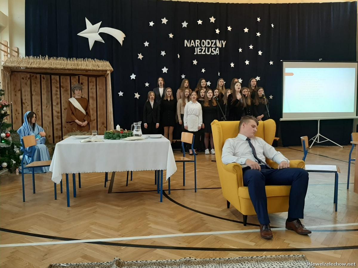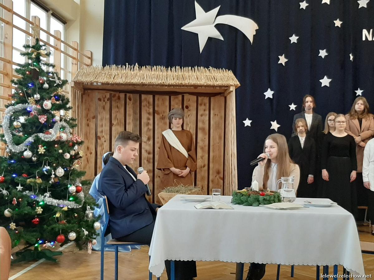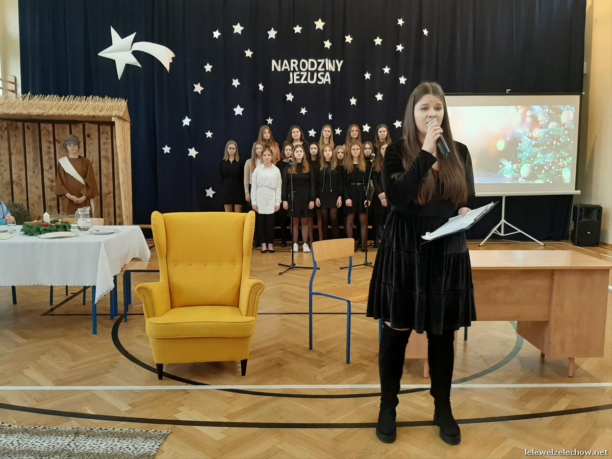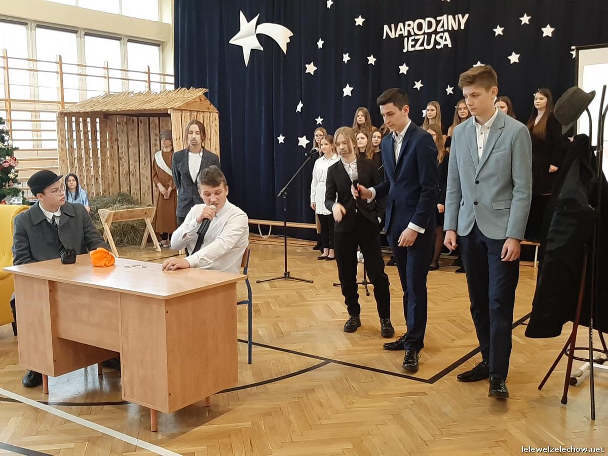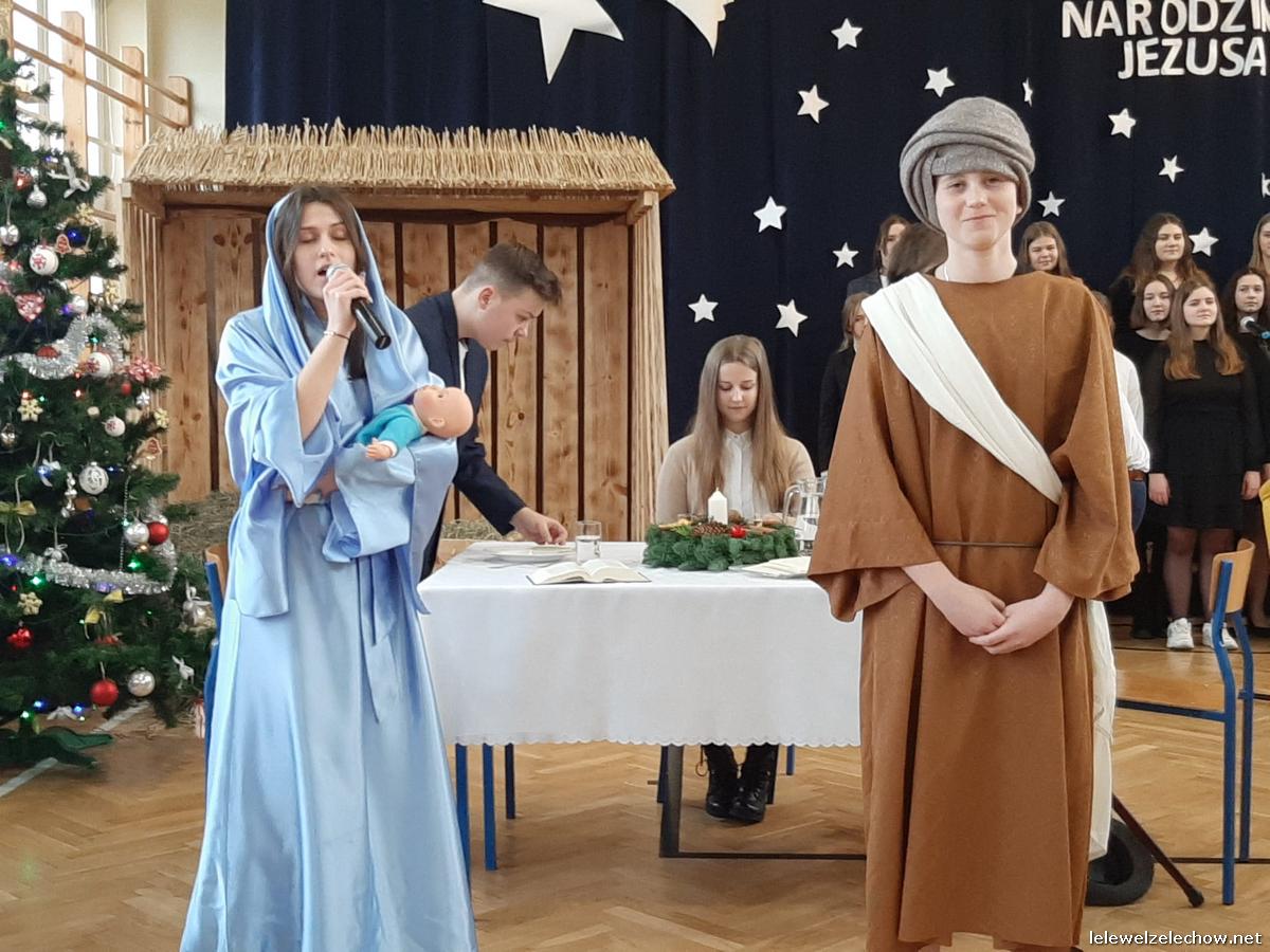 Przedstawienie dopełniały kolędy w niezwykłym wykonaniu Chóru Szkolnego oraz solistki Natalii Krawczyk. Zarówno pełne zaangażowania dialogi jak i przygotowana scenografia "wskazywały nam na to, co rzeczywiście jest najważniejsze w okresie świątecznym" jak powiedziała p. Dyrektor po przedstawieniu. Były również głębokie w swej treści życzenia dla uczniów, ich rodzin oraz pracowników szkoły od pani Dyrektor Sylwii Tomaszek oraz przewodniczącej Samorządu Uczniowskiego Patrycji Babiniec