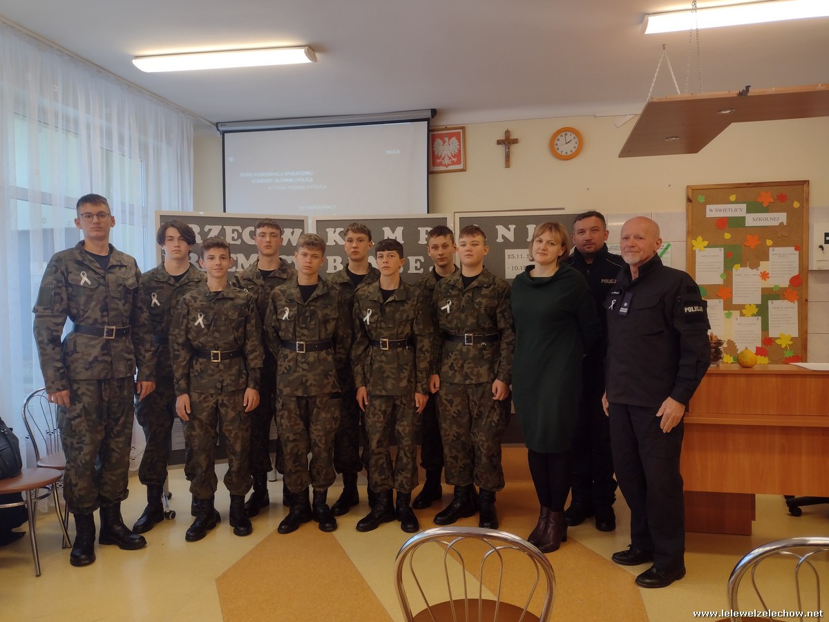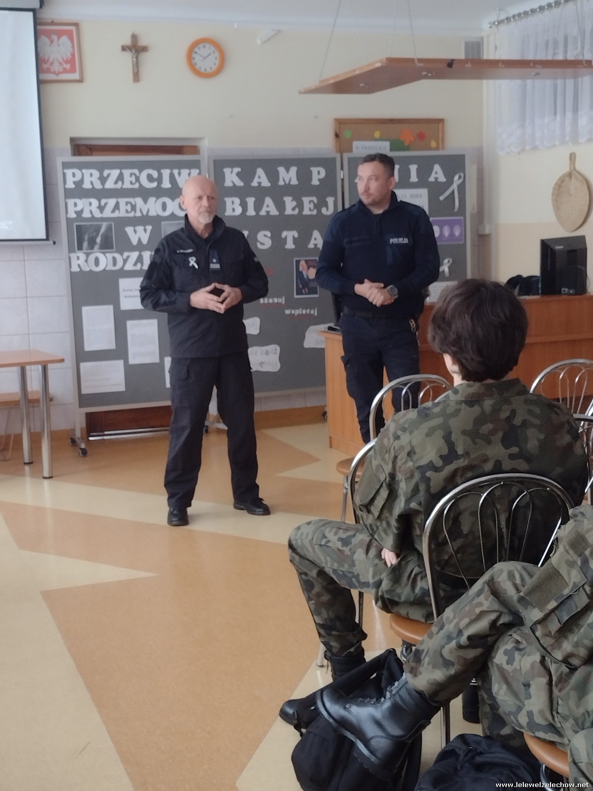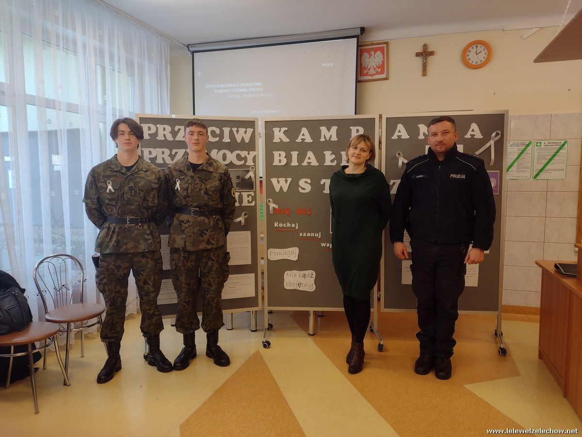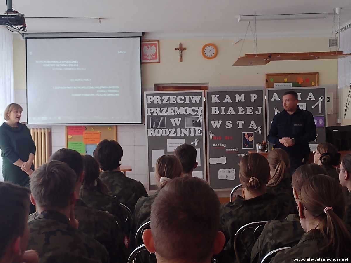 1 grudnia zaproszenie na spotkanie przyjęli kierownik Miejsko-Gminnego Ośrodka Pomocy Społecznej w Żelechowie pani Edyta Zając oraz dzielnicowy z Posterunku Policji w Żelechowie mł.asp. Przemysław Redzik. Przybyli goście omówili zagadnienia związane z przemocą domową oraz ogólnie występującymi formami przemocy. Zaprezentowali role i zadania zespołu interdyscyplinarnego działającego w Żelechowie, a także procedurę stosowania „Niebieskiej Karty”. Młodzież została poinformowana o sposobach zachowania się w przypadkach zaistnienia przemocy oraz podano adresy podmiotów na terenie powiatu garwolińskiego i w Polsce, które zajmują się problematyką przemocy. Spotkanie zorganizowali: pan Stanisław Madejski i pani Anna Majewska.