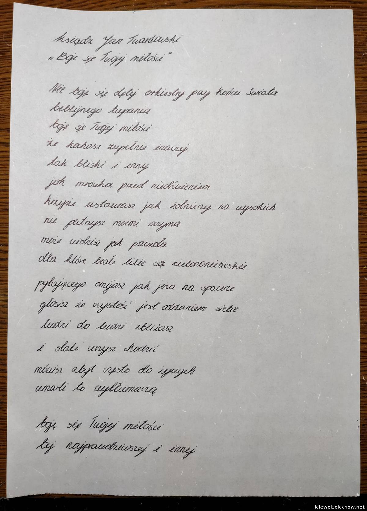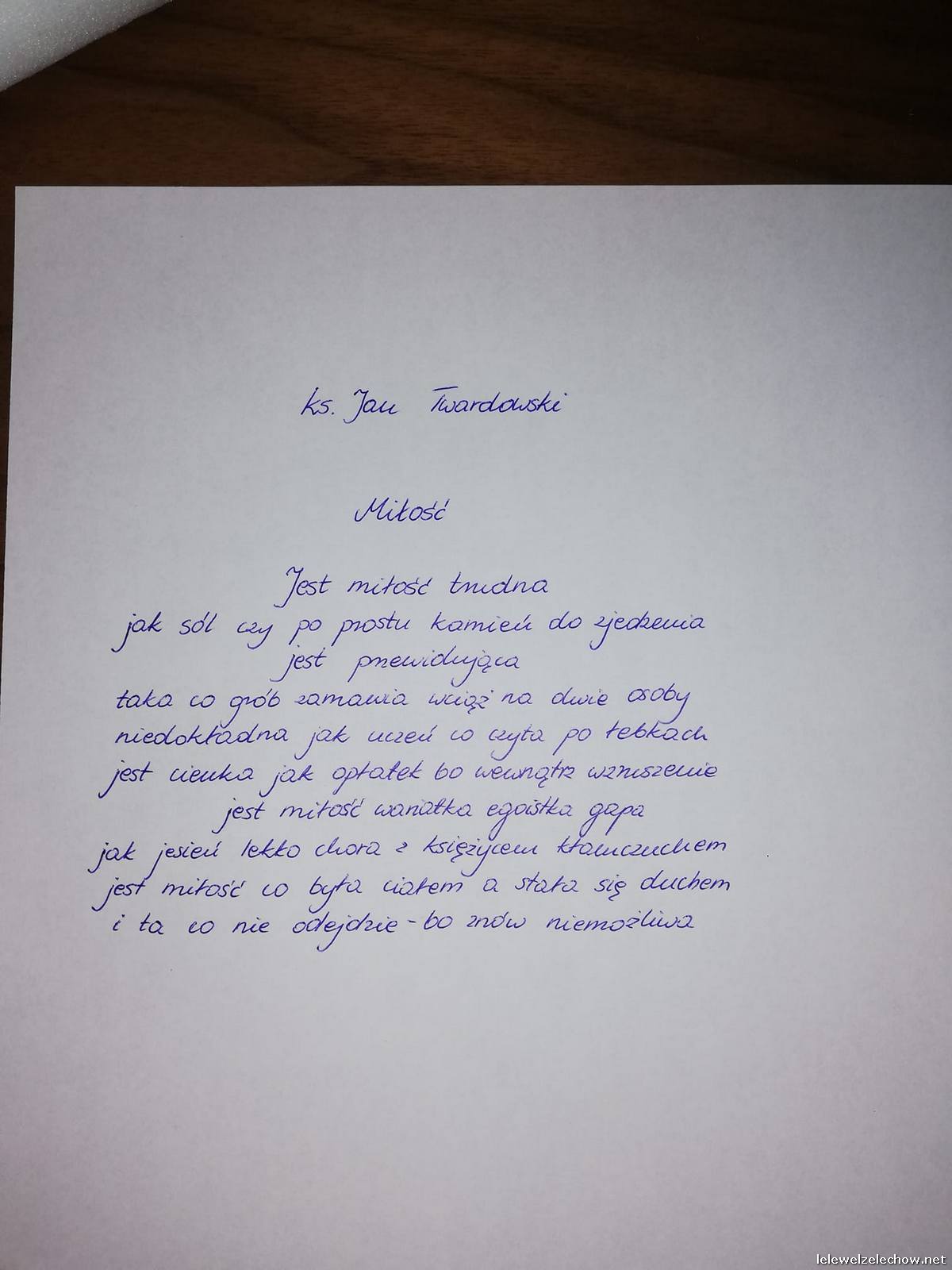 23. stycznia przypadał Dzień Pisma Ręcznego. Z tej okazji Samorząd Uczniowski z Opiekunem (p. Agnieszka Osial) zorganizował na szkolnym profilu facebooka Konkurs Pisma Ręcznego. Każdy uczeń o ładnym charakterze pisma mógł wziąć w nim udział. Zadanie konkursowe polegało na przepisaniu ręcznie dowolnego wiersza z twórczości ks. Jana Twardowskiego, którego 15. rocznicę śmierci obchodziliśmy 18. stycznia. Zwycięzcą miała zostać osoba, która otrzyma najwięcej polubień swojej pracy od użytkowników fb. Nagroda trafiła do Oli Barwickiej z kl. IIa. Przedstawiamy kilka wybranych prac konkursowych