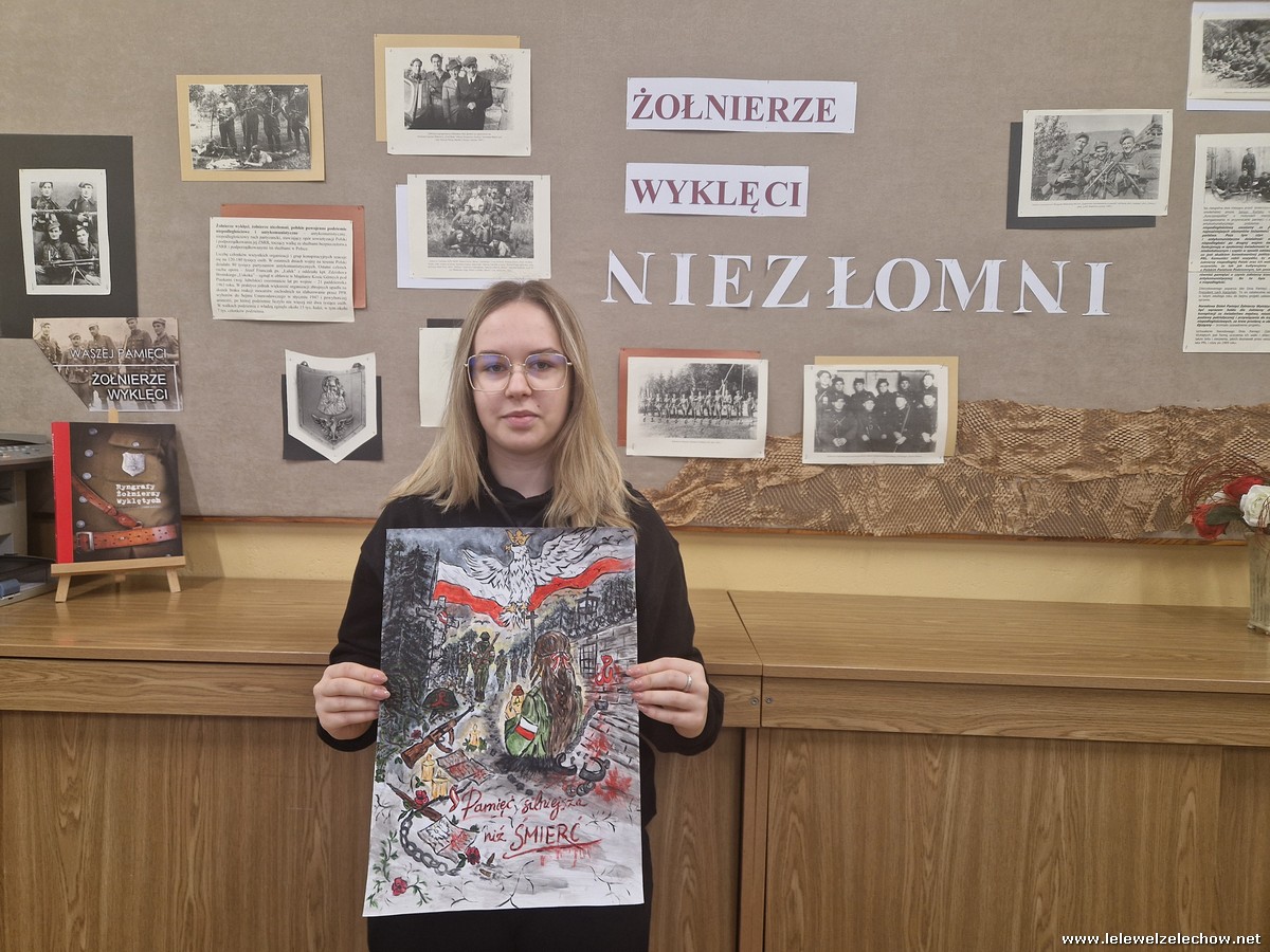 Organizator konkursu - pani Urszula Kobielus - nauczyciel historii, gratuluje zwycięzcom i dziękuje wszystkim uczestnikom za udział w konkursach. Pamiątkowe dyplomy oraz nagrody zostały wręczone 6 marca podczas uroczystego apelu upamiętniającego Żołnierzy Wyklętych.