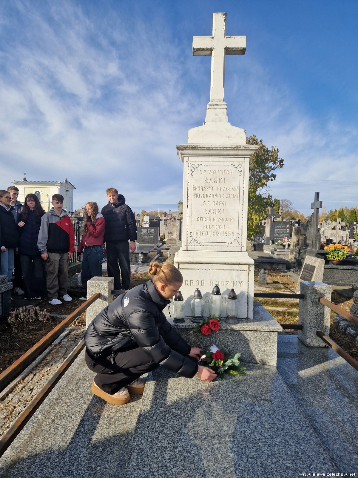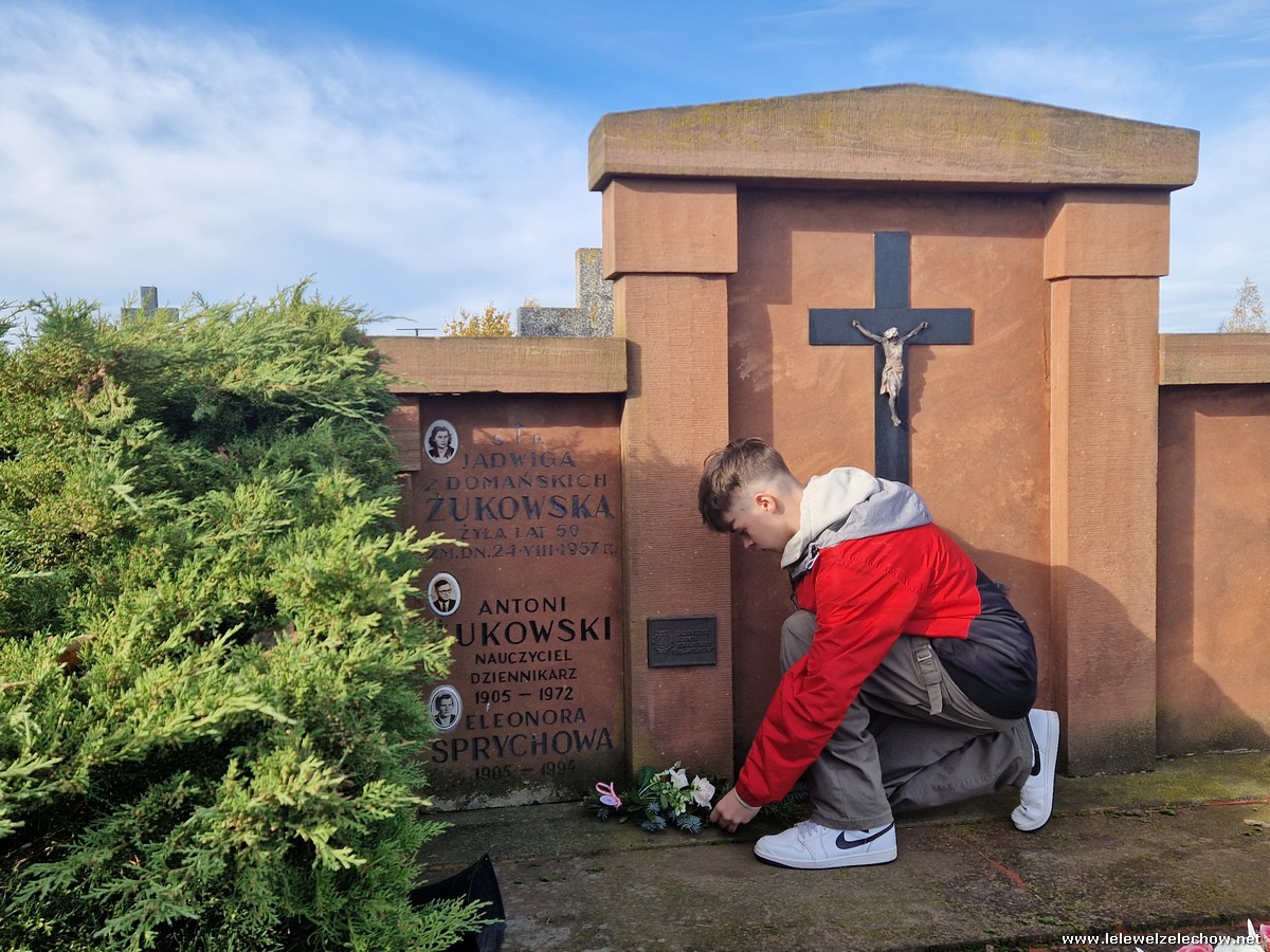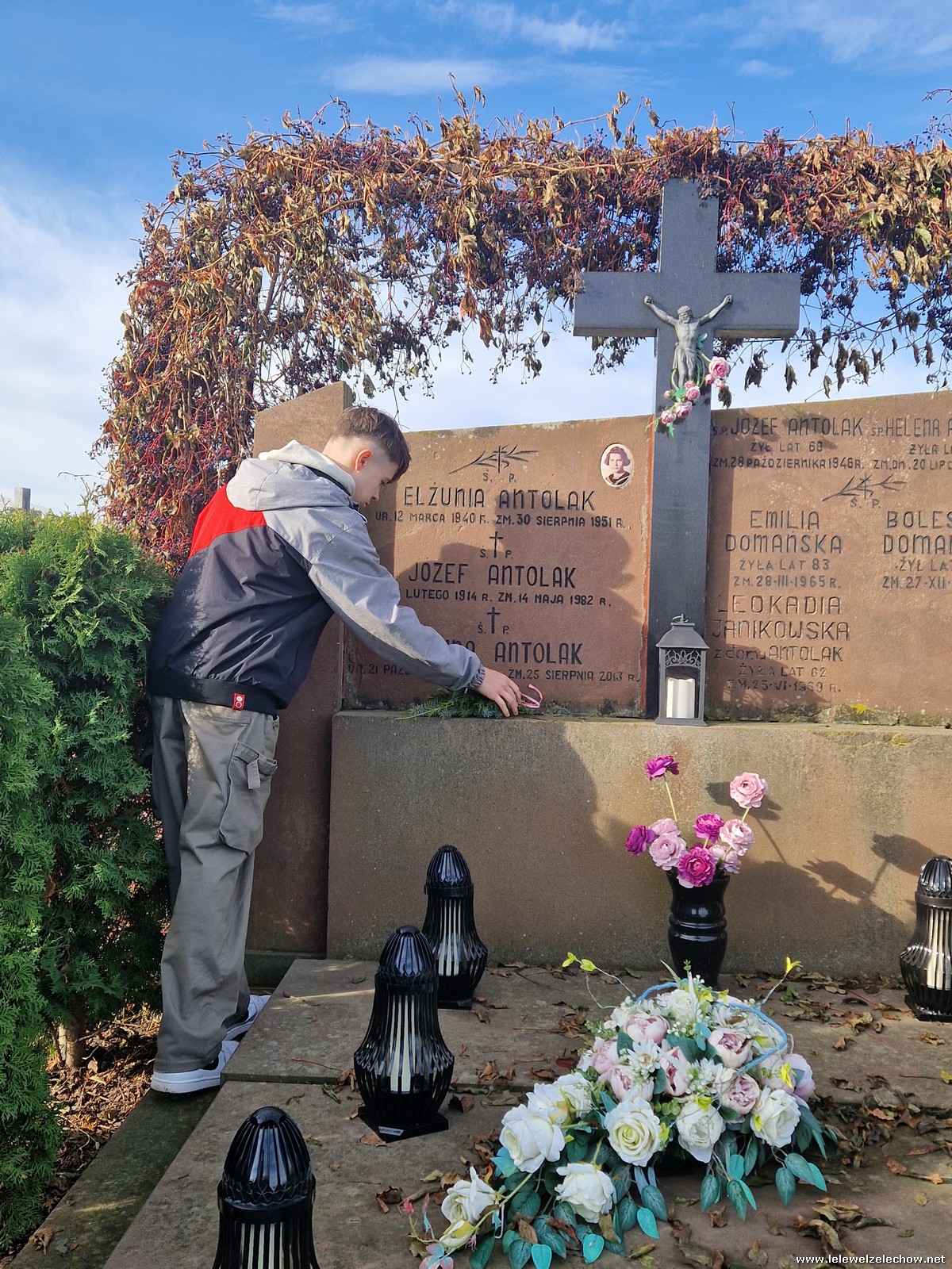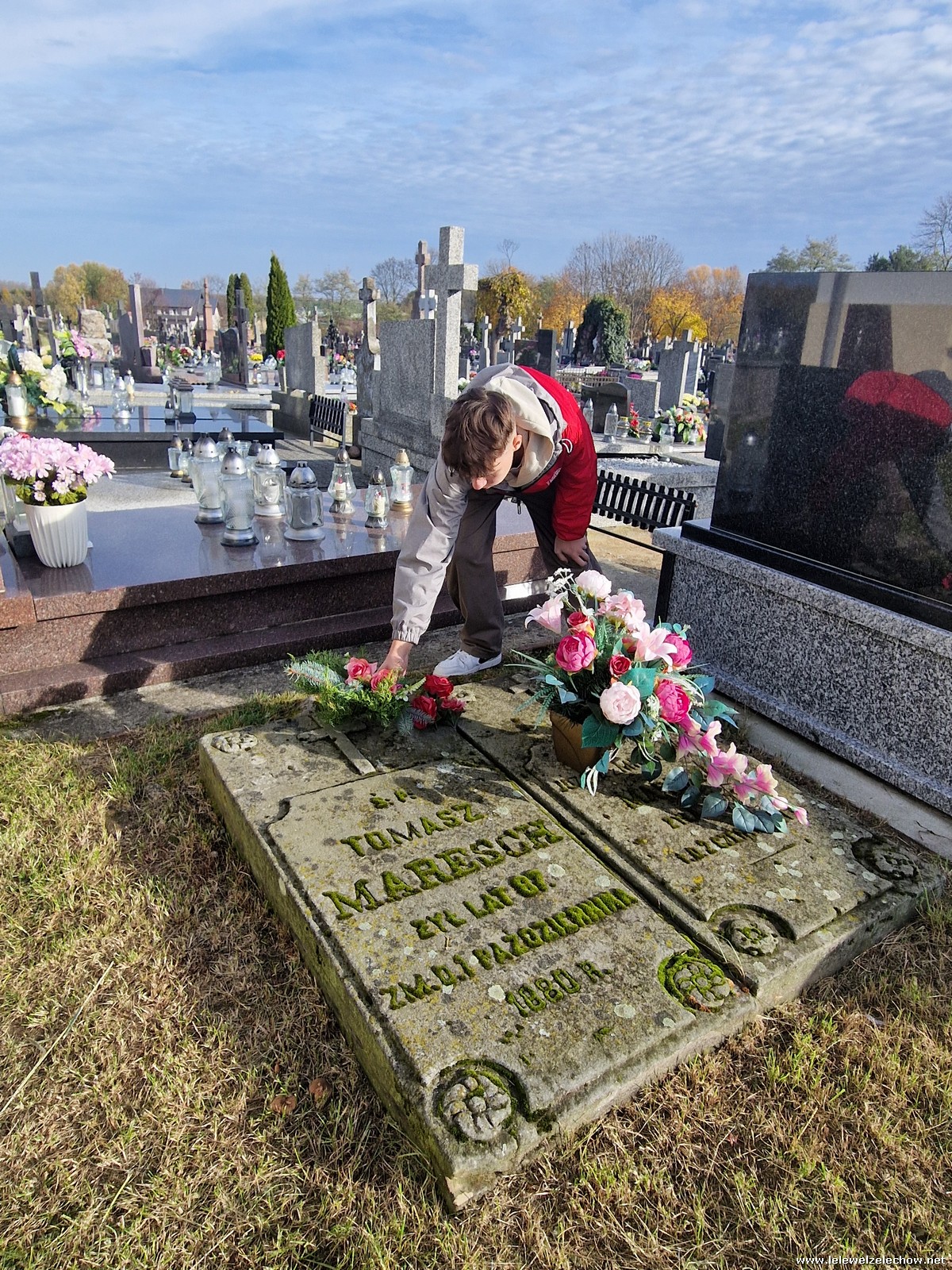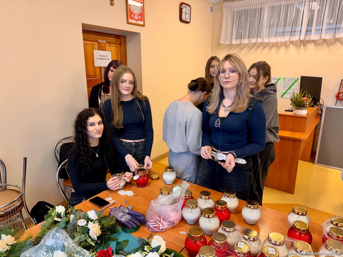 Uczniowie klasy 3c przeprowadzili zbiórkę pieniężną na zakup kwiatów i zniczy a następnie wykonali wiązanki i przygotowali znicze do postawienia na grobach osób zasłużonych dla naszej lokalnej społeczności oraz zabytkowych nagrobkach. 30 października uczniowie klasy 2b wraz z ks. Mariuszem Rompą udali się na cmentarz aby złożyć wiązanki. Znicze zapalą kadeci 1 listopada. Szkolną akcję koordynowała pani Urszula Kobielus.