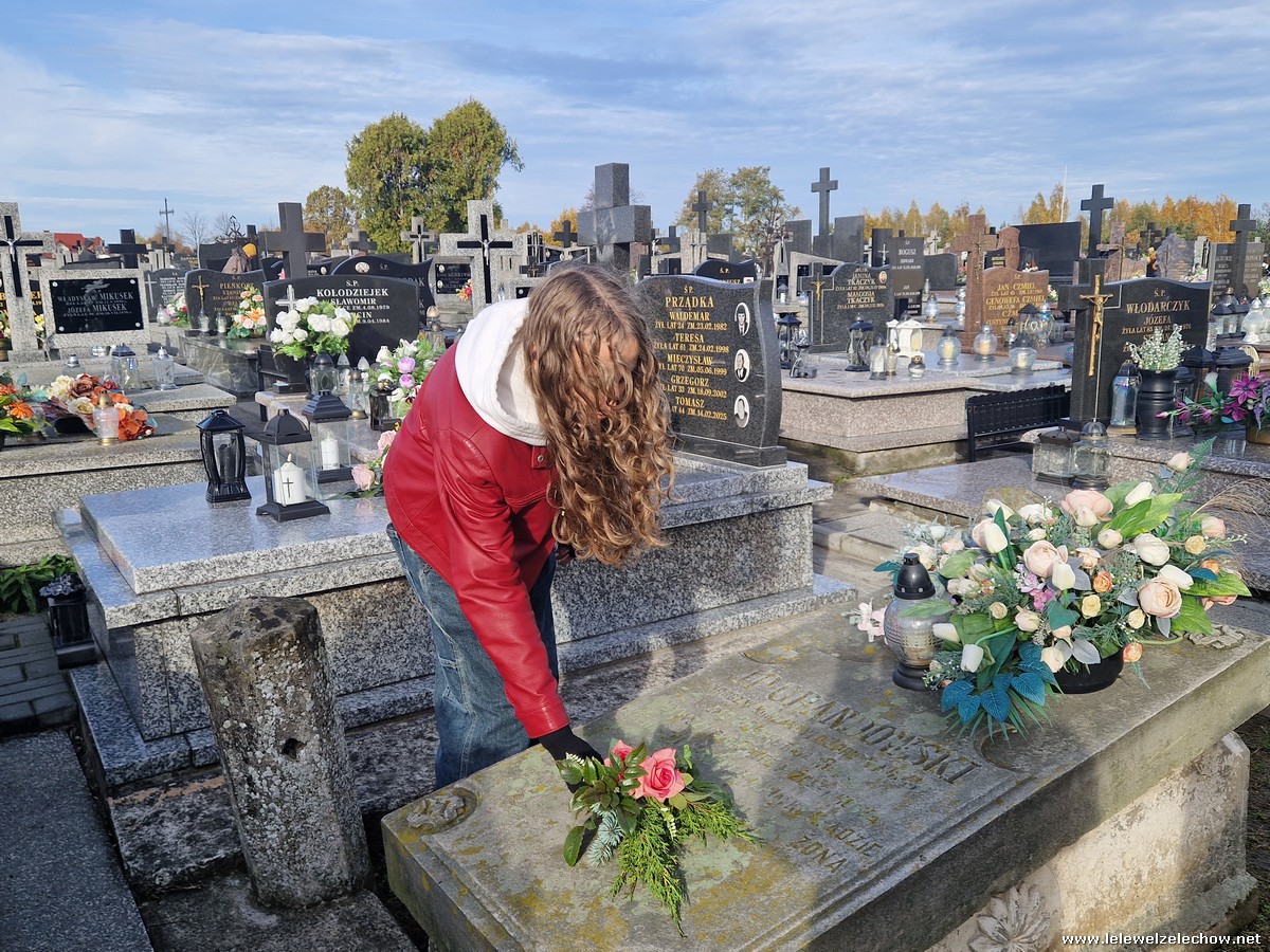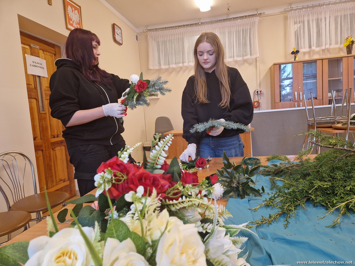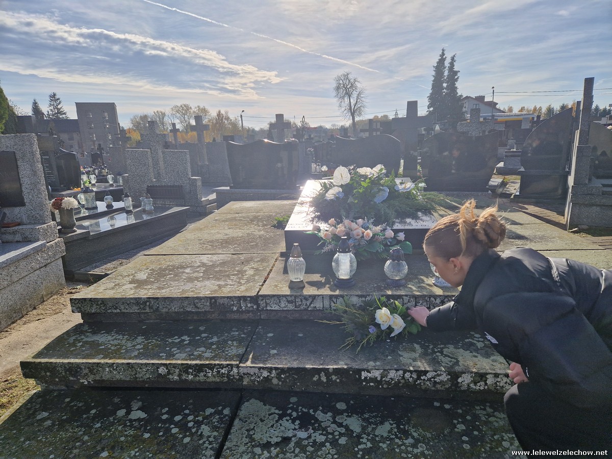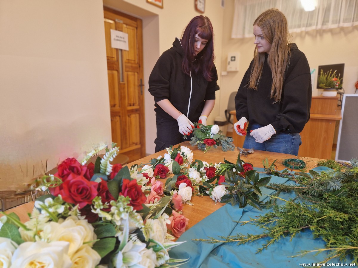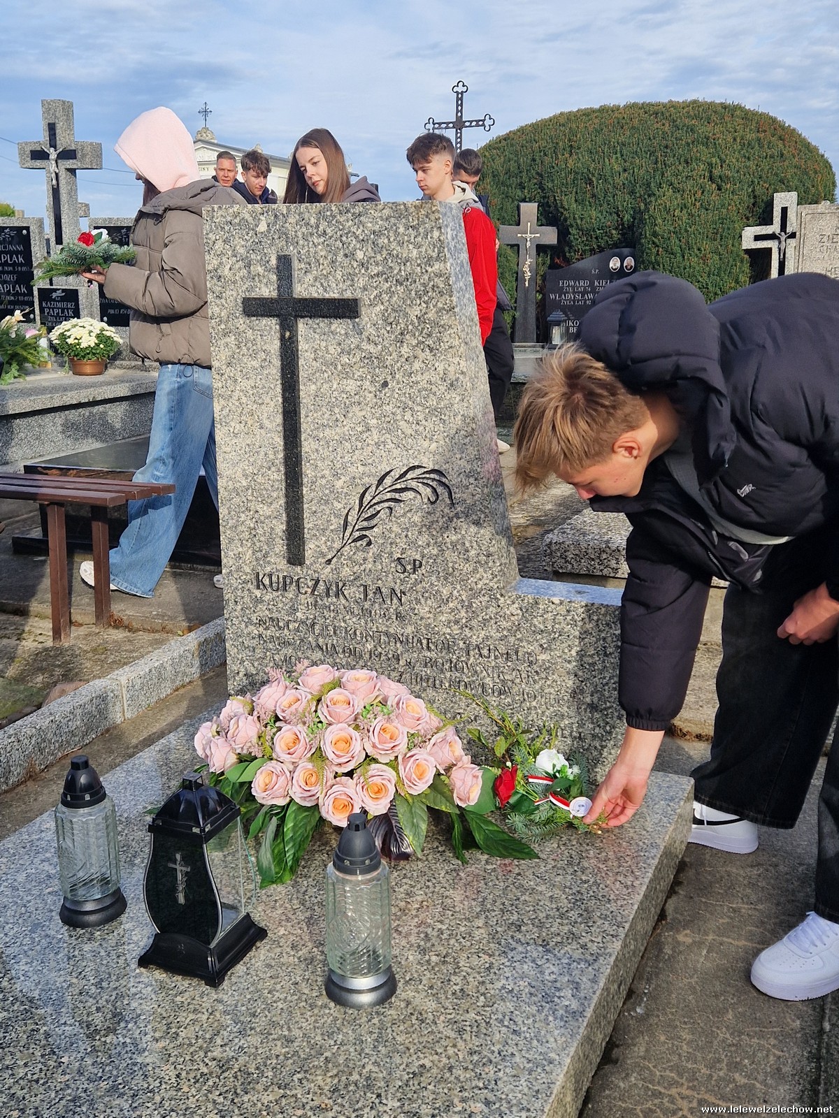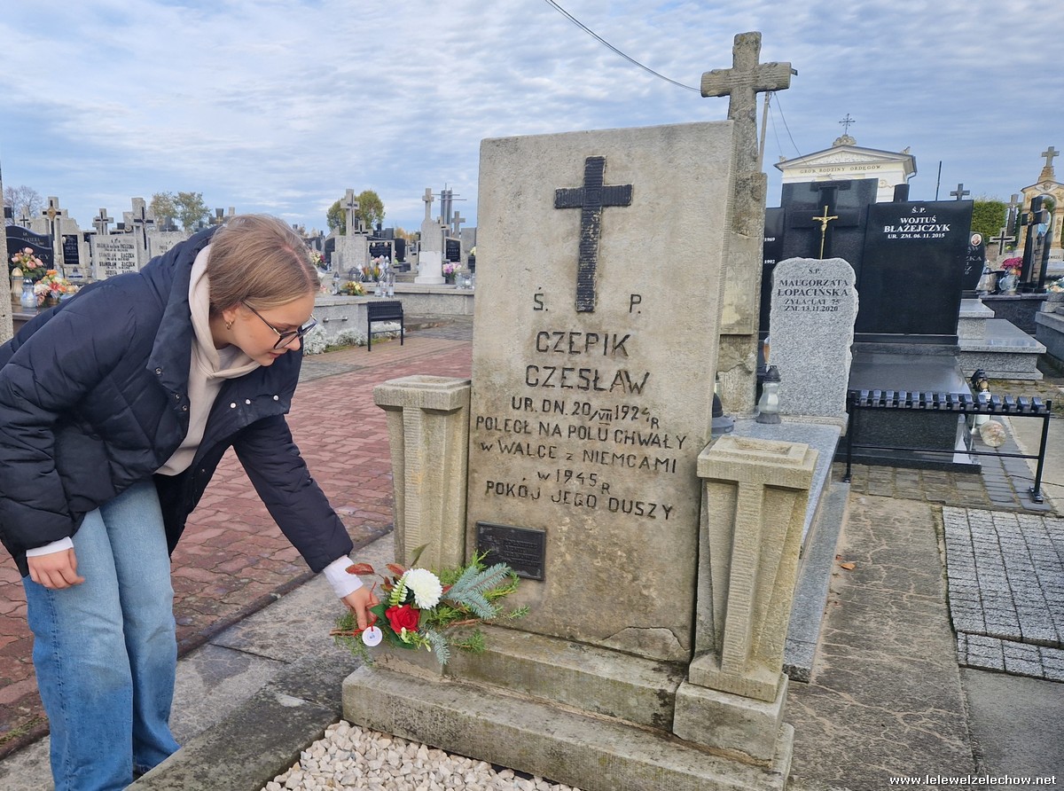 Uczniowie klasy 3c przeprowadzili zbiórkę pieniężną na zakup kwiatów i zniczy a następnie wykonali wiązanki i przygotowali znicze do postawienia na grobach osób zasłużonych dla naszej lokalnej społeczności oraz zabytkowych nagrobkach. 30 października uczniowie klasy 2b wraz z ks. Mariuszem Rompą udali się na cmentarz aby złożyć wiązanki. Znicze zapalą kadeci 1 listopada. Szkolną akcję koordynowała pani Urszula Kobielus.