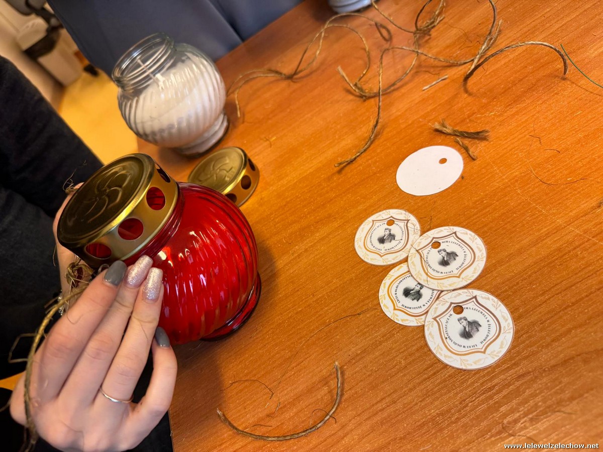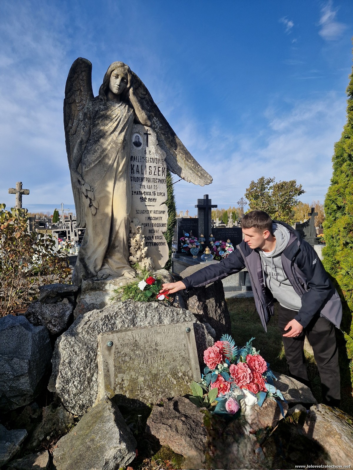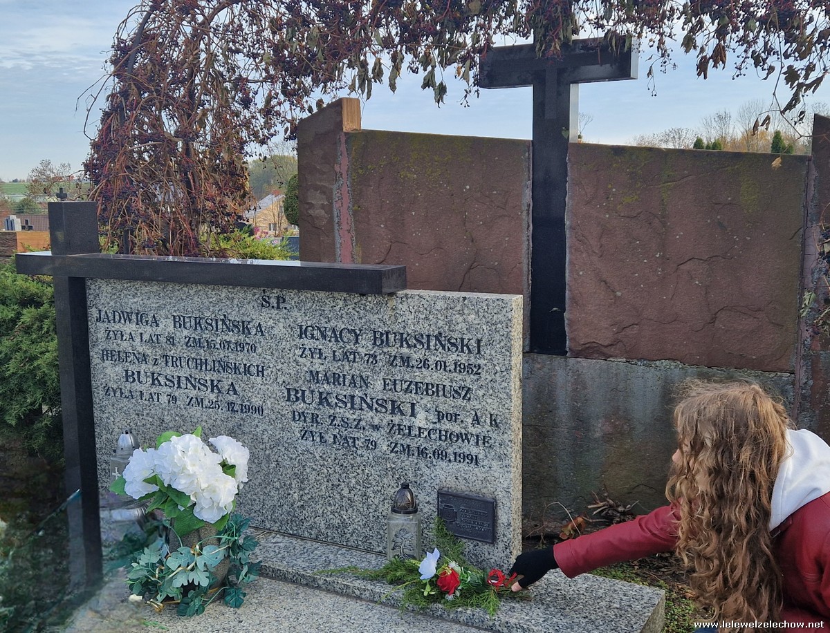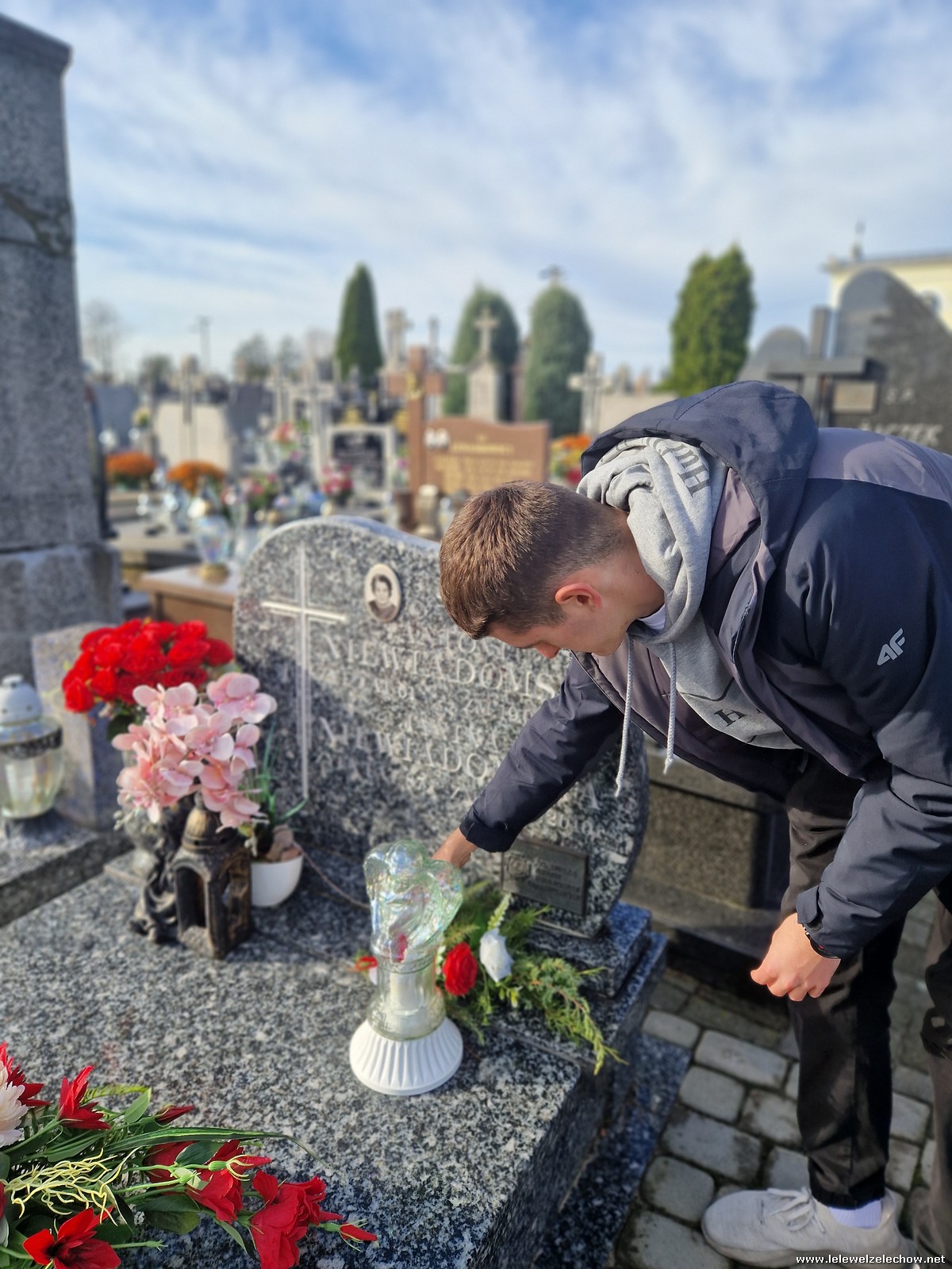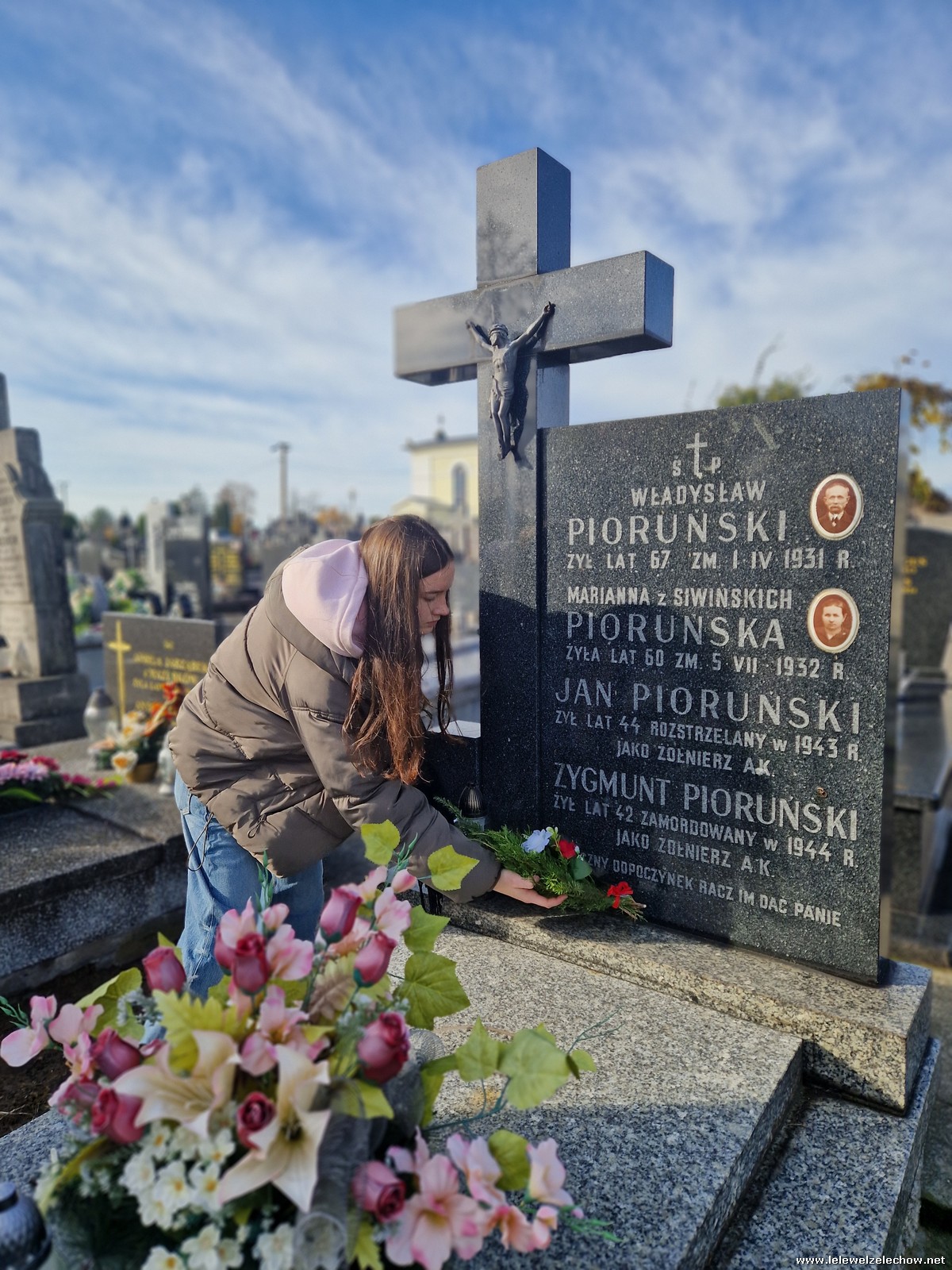 Uczniowie klasy 3c przeprowadzili zbiórkę pieniężną na zakup kwiatów i zniczy a następnie wykonali wiązanki i przygotowali znicze do postawienia na grobach osób zasłużonych dla naszej lokalnej społeczności oraz zabytkowych nagrobkach. 30 października uczniowie klasy 2b wraz z ks. Mariuszem Rompą udali się na cmentarz aby złożyć wiązanki. Znicze zapalą kadeci 1 listopada. Szkolną akcję koordynowała pani Urszula Kobielus.