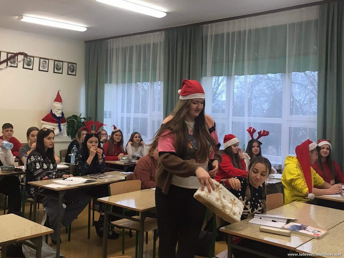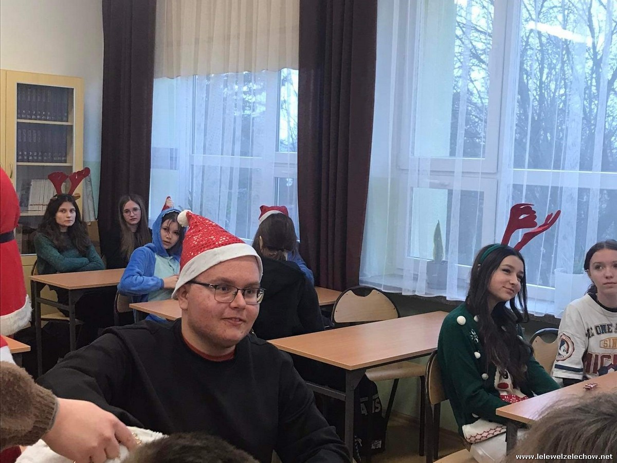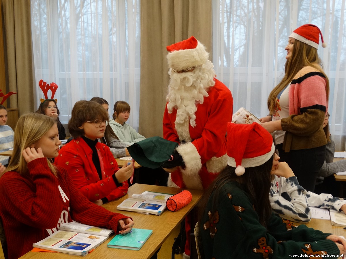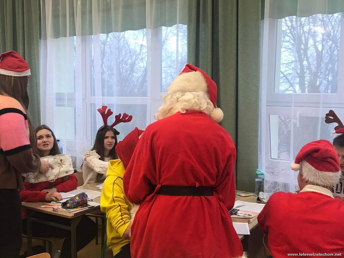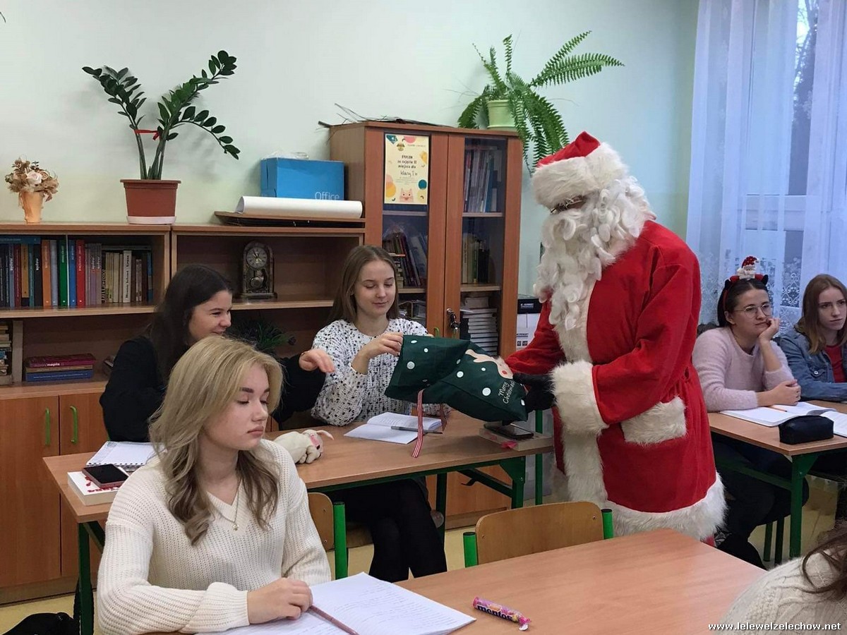 6 grudnia od rana zwyczajne lekcje - matematyki, historii czy języka niemieckiego…Tylko czerwone czapeczki z białymi pomponikami dominują nad zeszytami i książkami. Aż tu nagle! Puk! puk! Do klas przybywa Mikołaj, który wszystkie grzeczne dzieci, starsze i młodsze, obdarowuje cukierkami! Ale to nie koniec niespodzianek! Wszyscy, którzy założyli tego dnia mikołajkowe ubiory brali udział w loterii fantowej. Pieczołowicie zapakowane prezenciki wręczyli pomocnicy Mikołaja - Oliwia, Patrycja i Piotrek:) Radość i uśmiech zagościły na twarzach naszych uczniów!