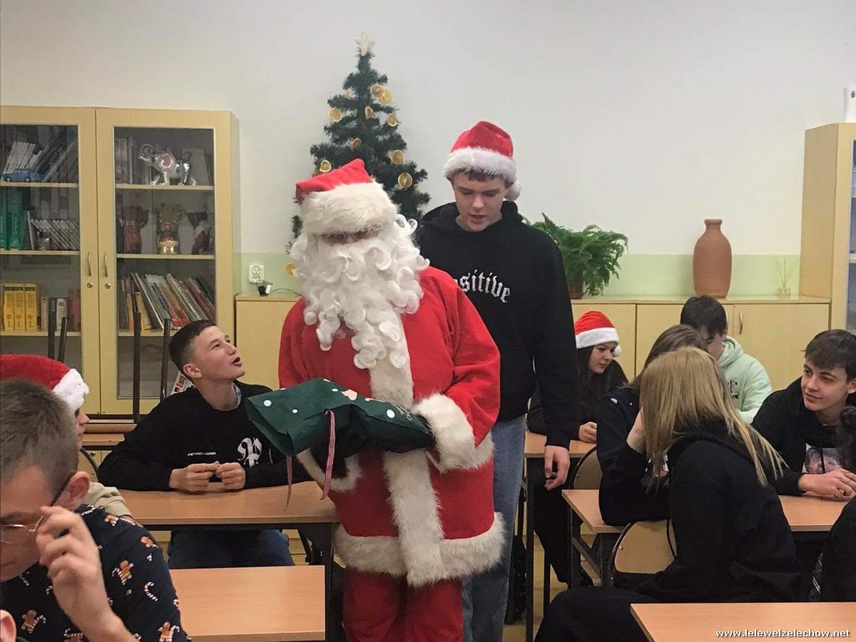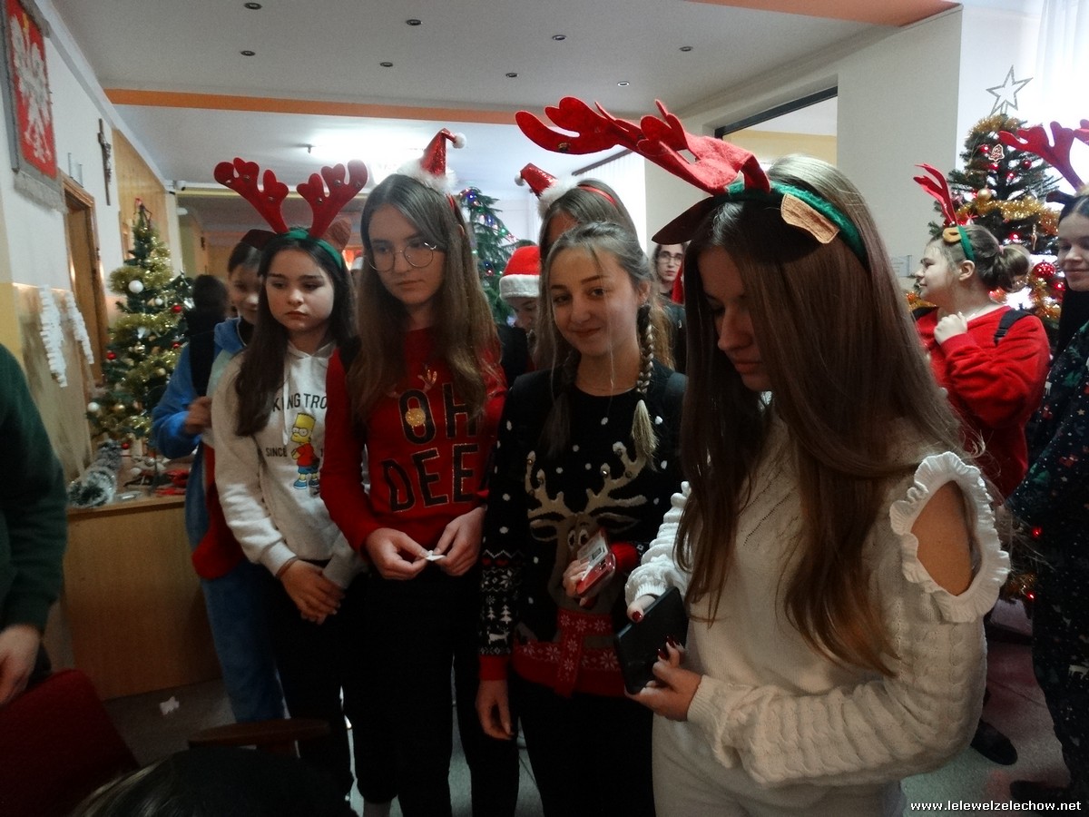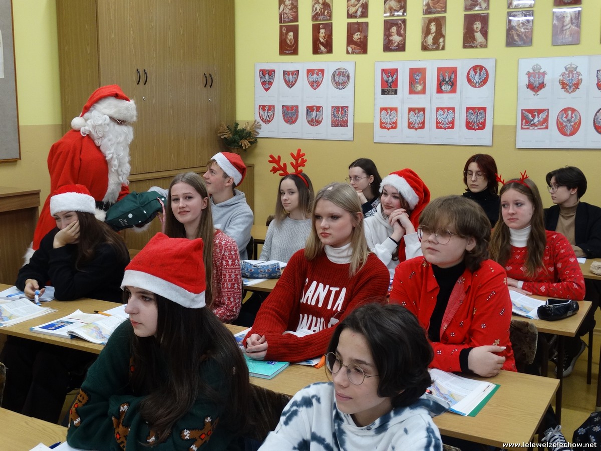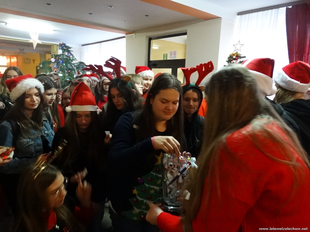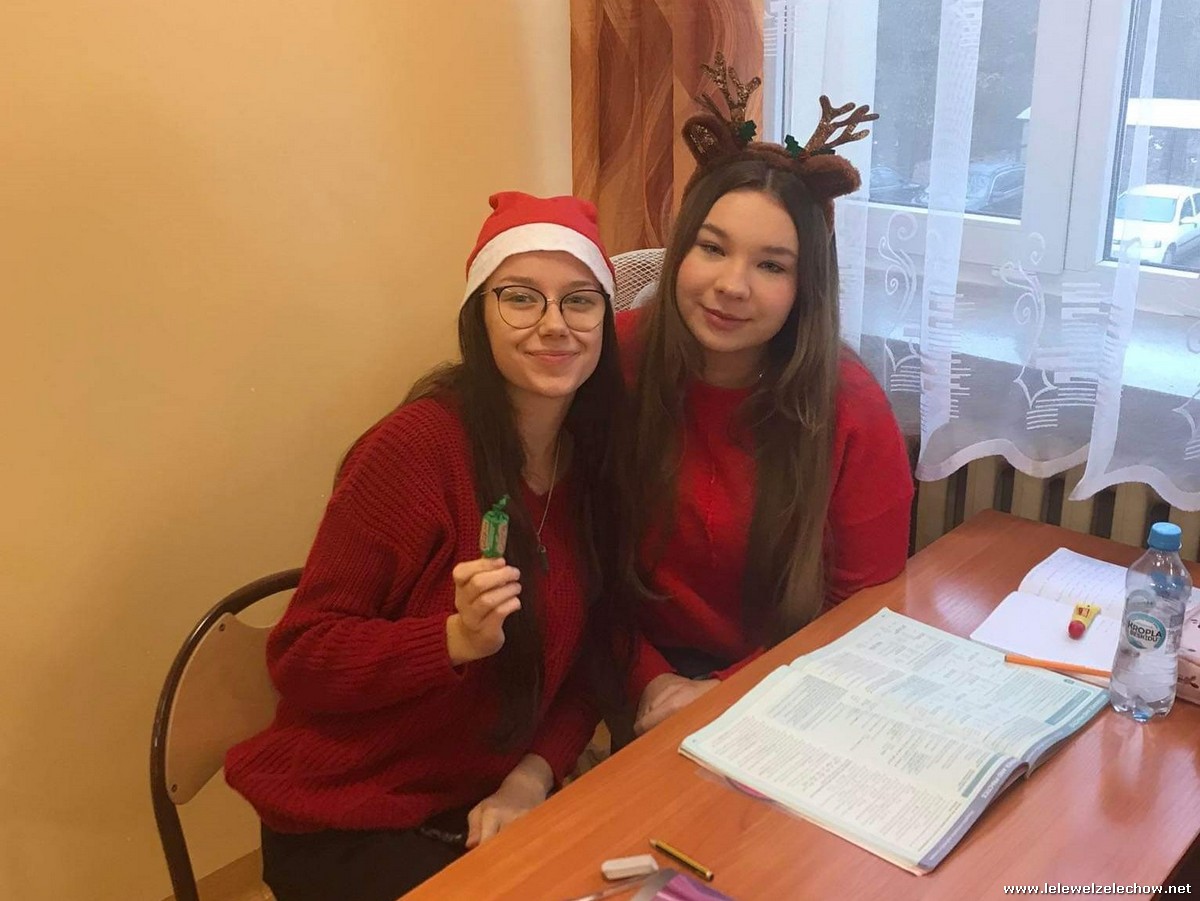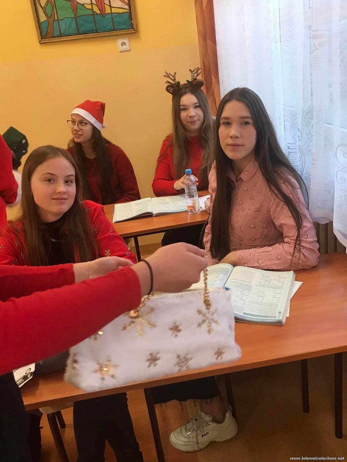 6 grudnia od rana zwyczajne lekcje - matematyki, historii czy języka niemieckiego…Tylko czerwone czapeczki z białymi pomponikami dominują nad zeszytami i książkami. Aż tu nagle! Puk! puk! Do klas przybywa Mikołaj, który wszystkie grzeczne dzieci, starsze i młodsze, obdarowuje cukierkami! Ale to nie koniec niespodzianek! Wszyscy, którzy założyli tego dnia mikołajkowe ubiory brali udział w loterii fantowej. Pieczołowicie zapakowane prezenciki wręczyli pomocnicy Mikołaja - Oliwia, Patrycja i Piotrek:) Radość i uśmiech zagościły na twarzach naszych uczniów!