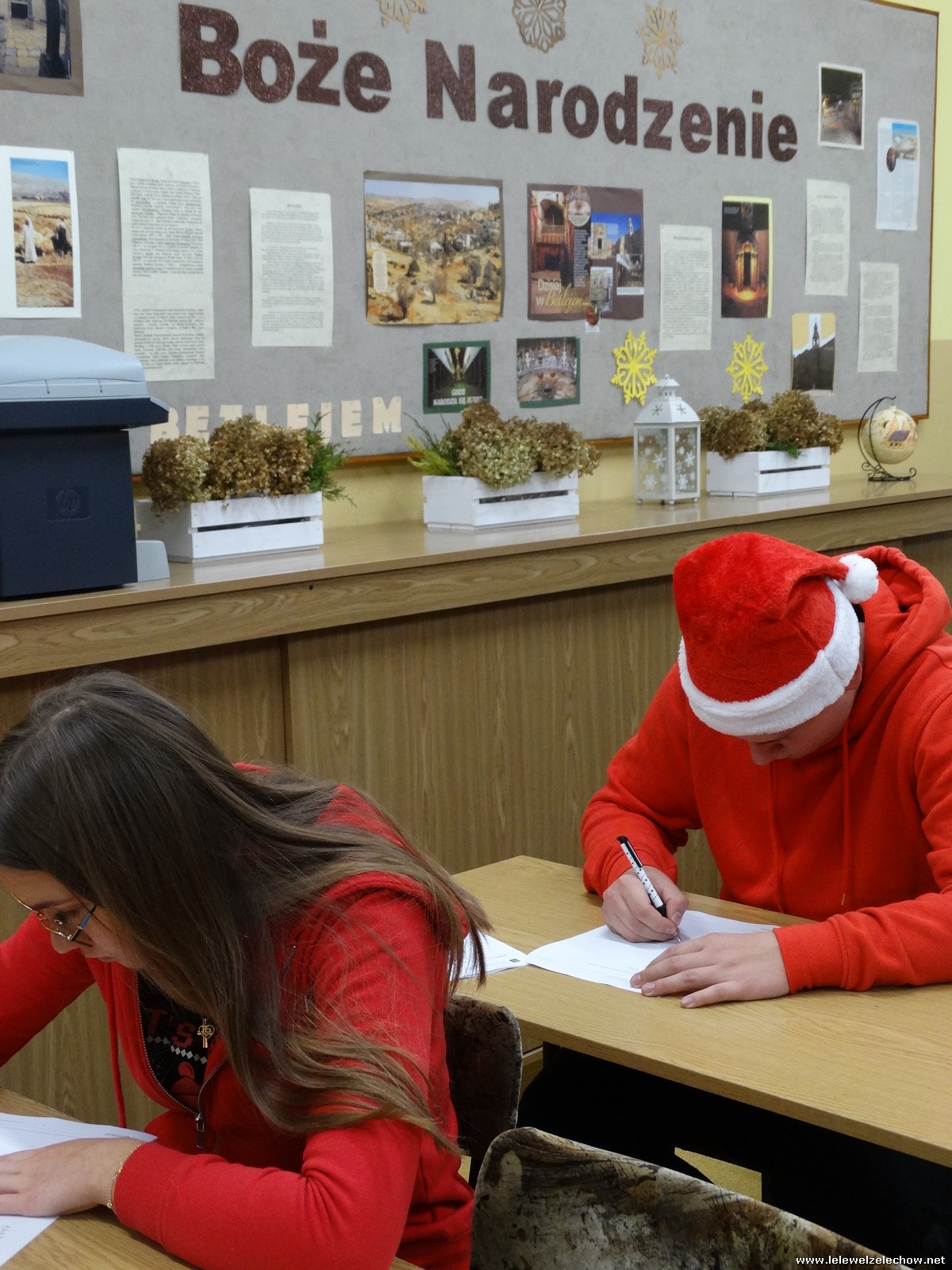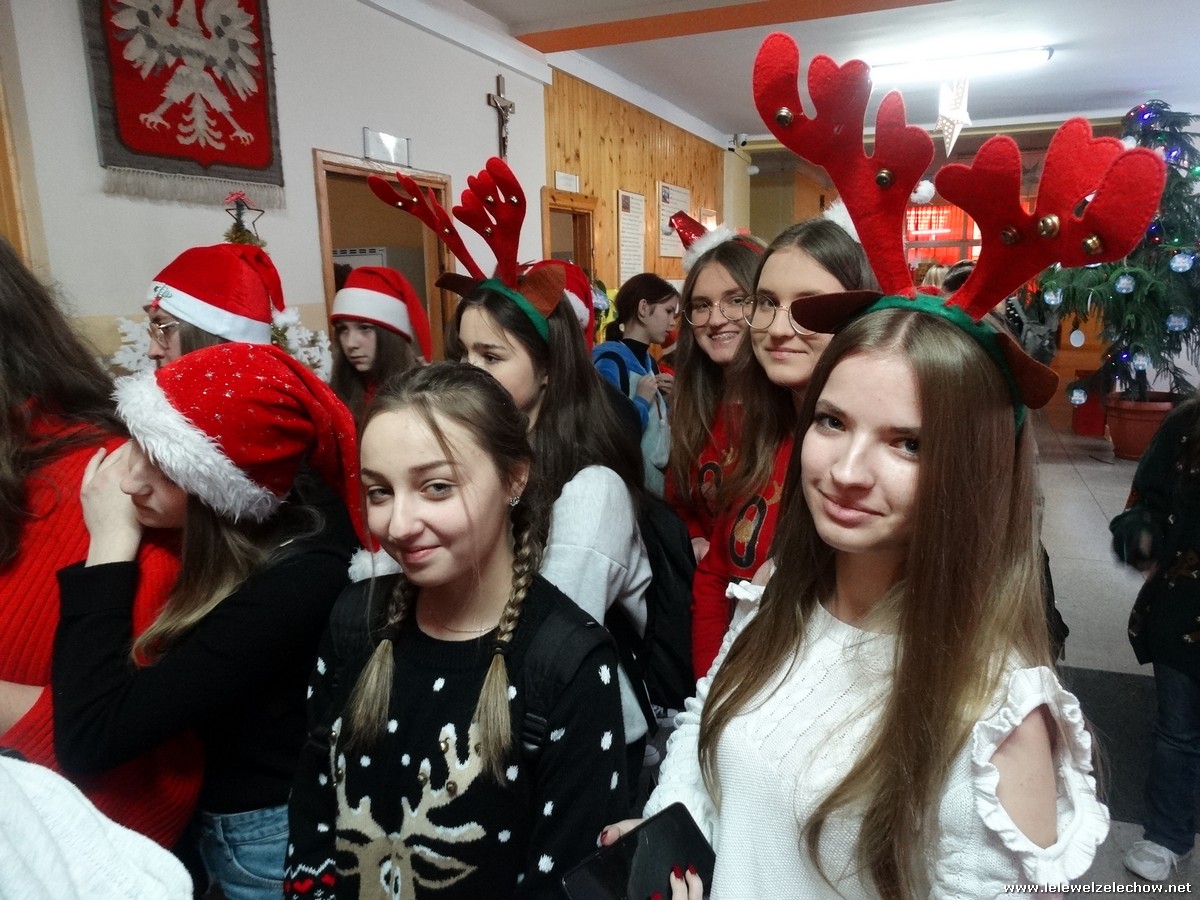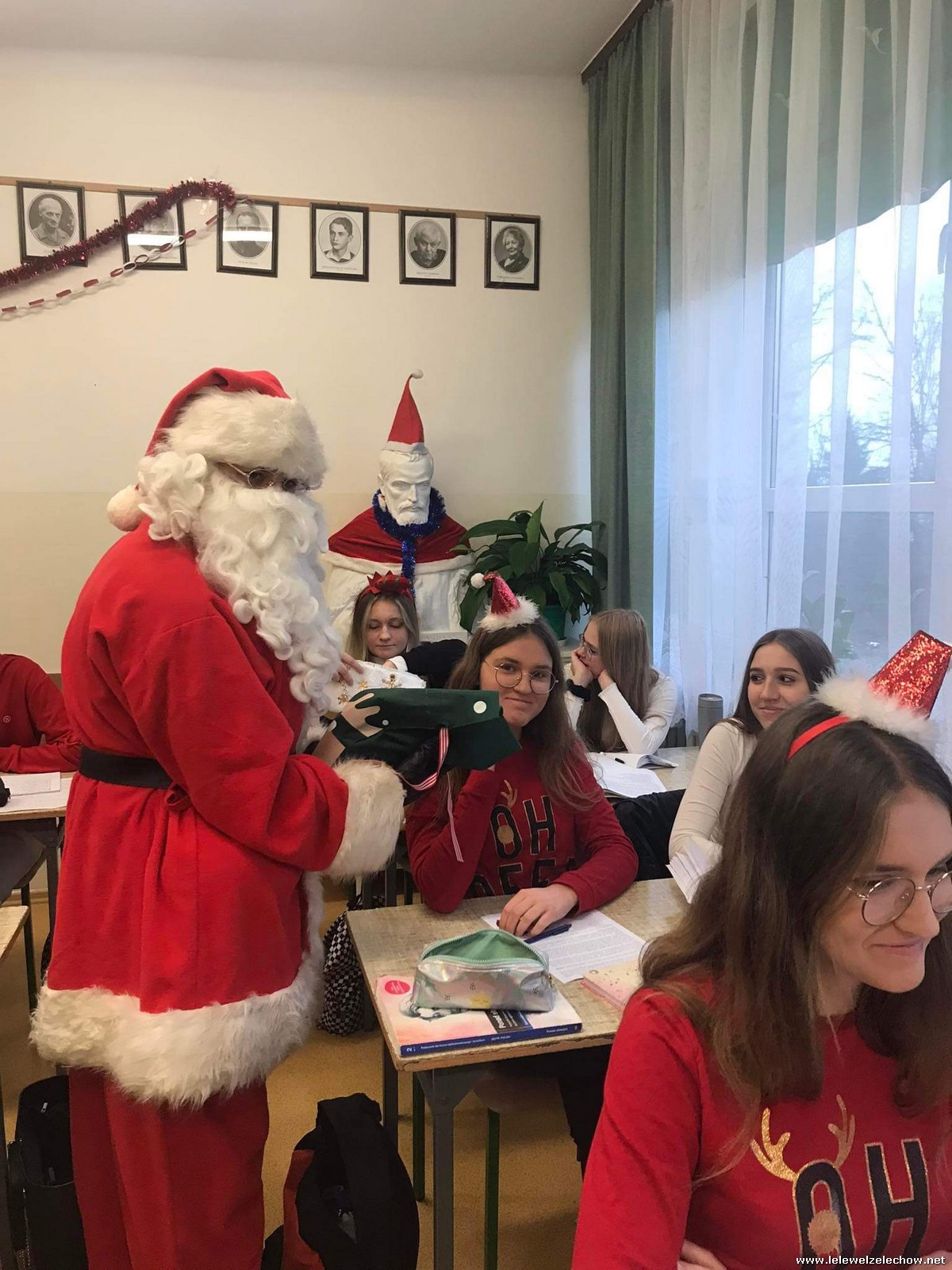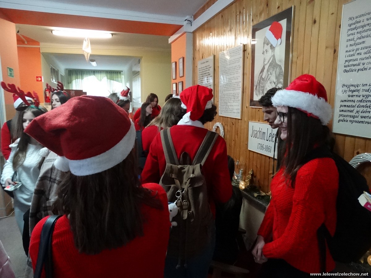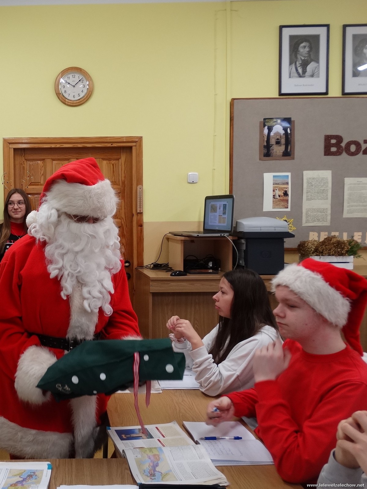 6 grudnia od rana zwyczajne lekcje - matematyki, historii czy języka niemieckiego…Tylko czerwone czapeczki z białymi pomponikami dominują nad zeszytami i książkami. Aż tu nagle! Puk! puk! Do klas przybywa Mikołaj, który wszystkie grzeczne dzieci, starsze i młodsze, obdarowuje cukierkami! Ale to nie koniec niespodzianek! Wszyscy, którzy założyli tego dnia mikołajkowe ubiory brali udział w loterii fantowej. Pieczołowicie zapakowane prezenciki wręczyli pomocnicy Mikołaja - Oliwia, Patrycja i Piotrek:) Radość i uśmiech zagościły na twarzach naszych uczniów!