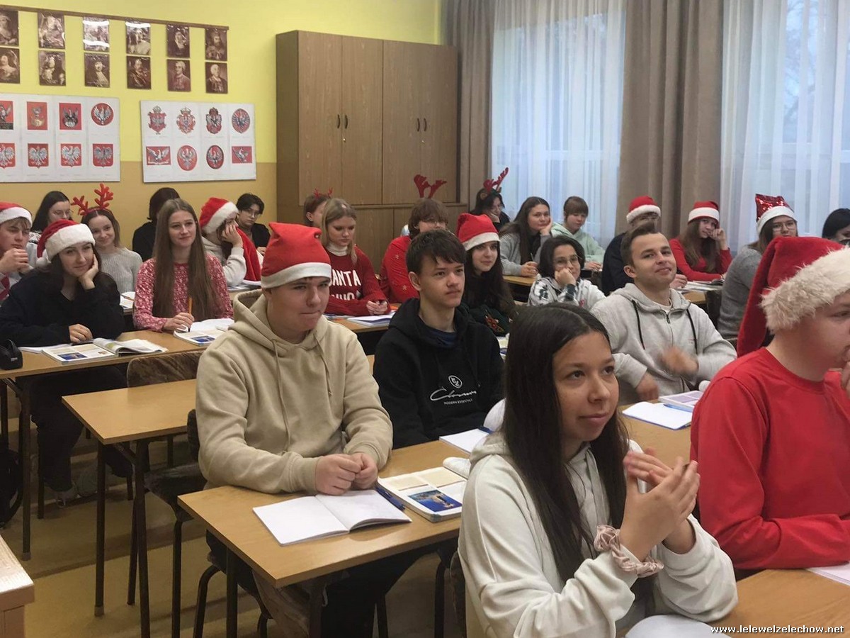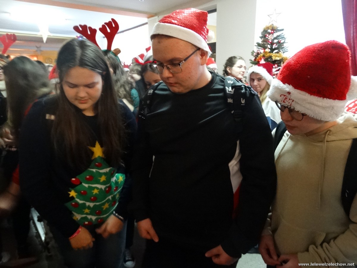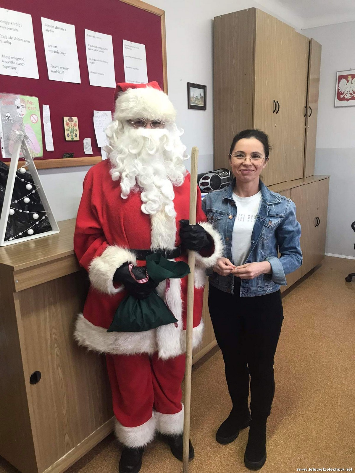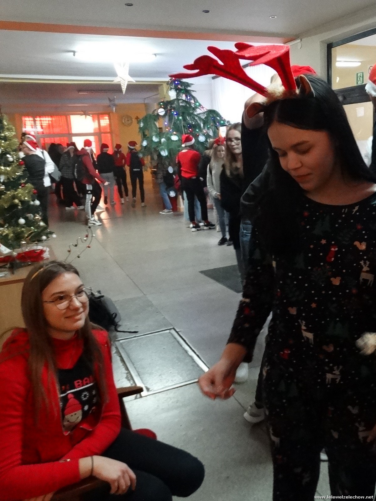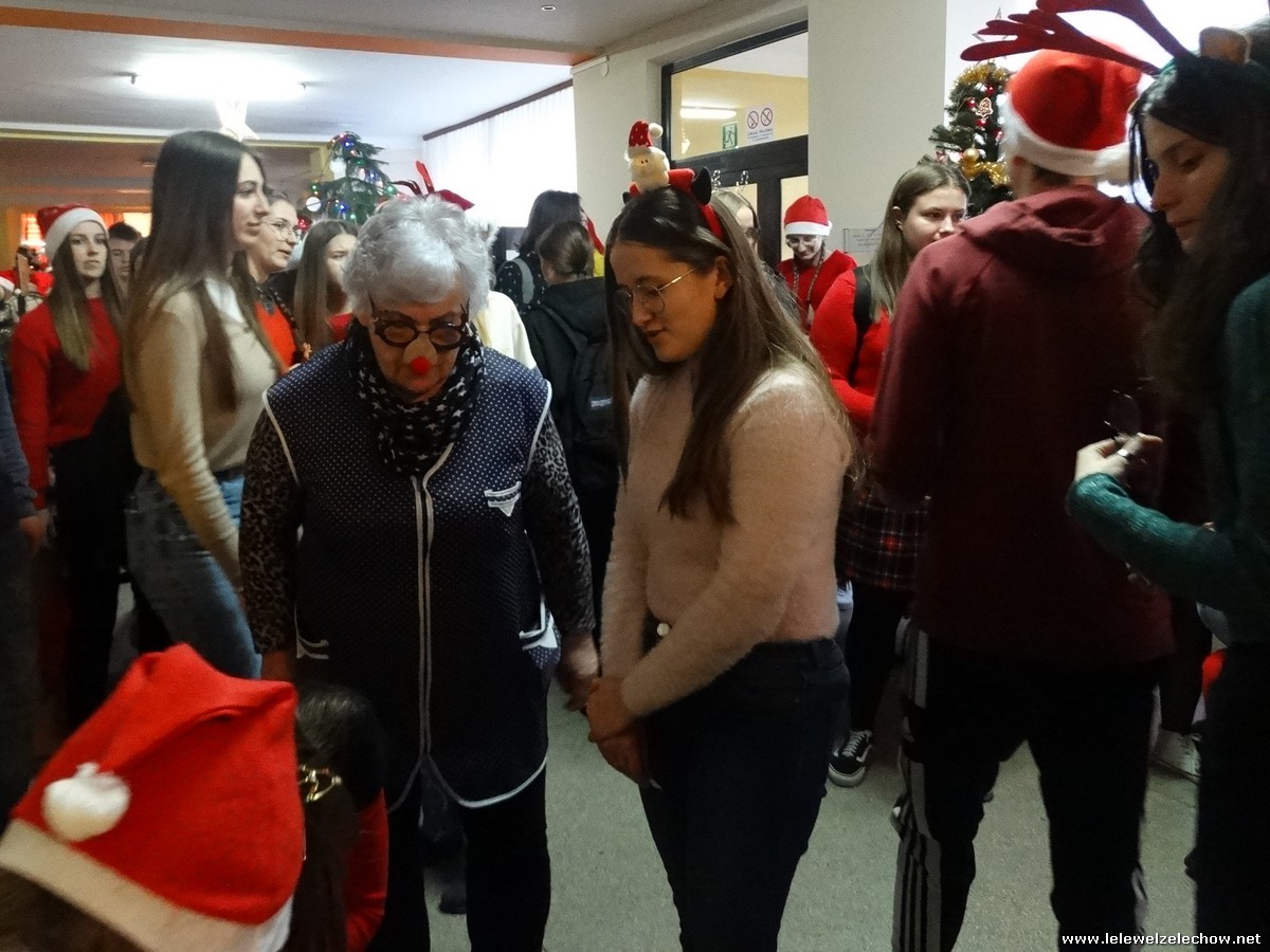 6 grudnia od rana zwyczajne lekcje - matematyki, historii czy języka niemieckiego…Tylko czerwone czapeczki z białymi pomponikami dominują nad zeszytami i książkami. Aż tu nagle! Puk! puk! Do klas przybywa Mikołaj, który wszystkie grzeczne dzieci, starsze i młodsze, obdarowuje cukierkami! Ale to nie koniec niespodzianek! Wszyscy, którzy założyli tego dnia mikołajkowe ubiory brali udział w loterii fantowej. Pieczołowicie zapakowane prezenciki wręczyli pomocnicy Mikołaja - Oliwia, Patrycja i Piotrek:) Radość i uśmiech zagościły na twarzach naszych uczniów!