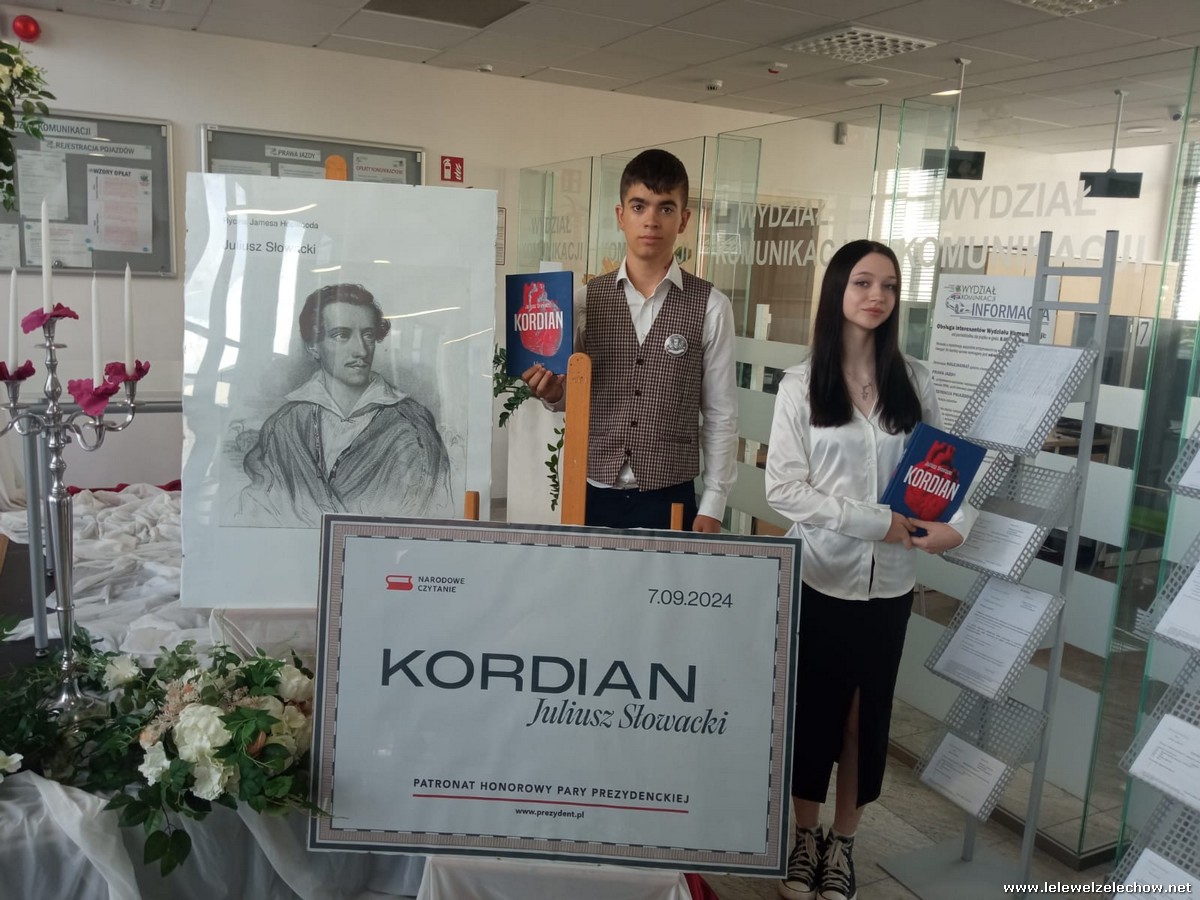 Naszą szkołę w akcji Narodowego Czytania reprezentowali uczniowie: Laura Kocielnik z II a i Bartosz Konopka z III b, którzy wraz z Panią Dyrektor Sylwią Tomaszek pięknie zaprezentowali fragment II aktu dramatu – rozmowę Kordiana z Wiolettą. Nad przygotowaniem młodzieży czuwały panie: Magdalena Woźniak i Anna Włodarczyk.