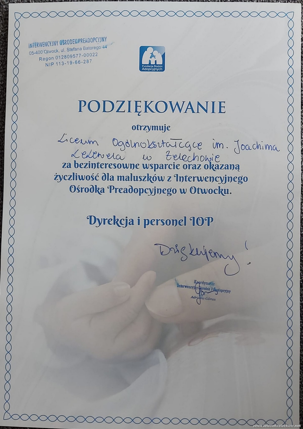 Dzięki Waszemu zaangażowaniu udało nam się zebrać znaczną ilość artykułów higienicznych dla niemowląt, które wolontariusze wraz z opiekunami przekazali do Interwencyjnego Ośrodka Preadopcyjnego w Otwocku.