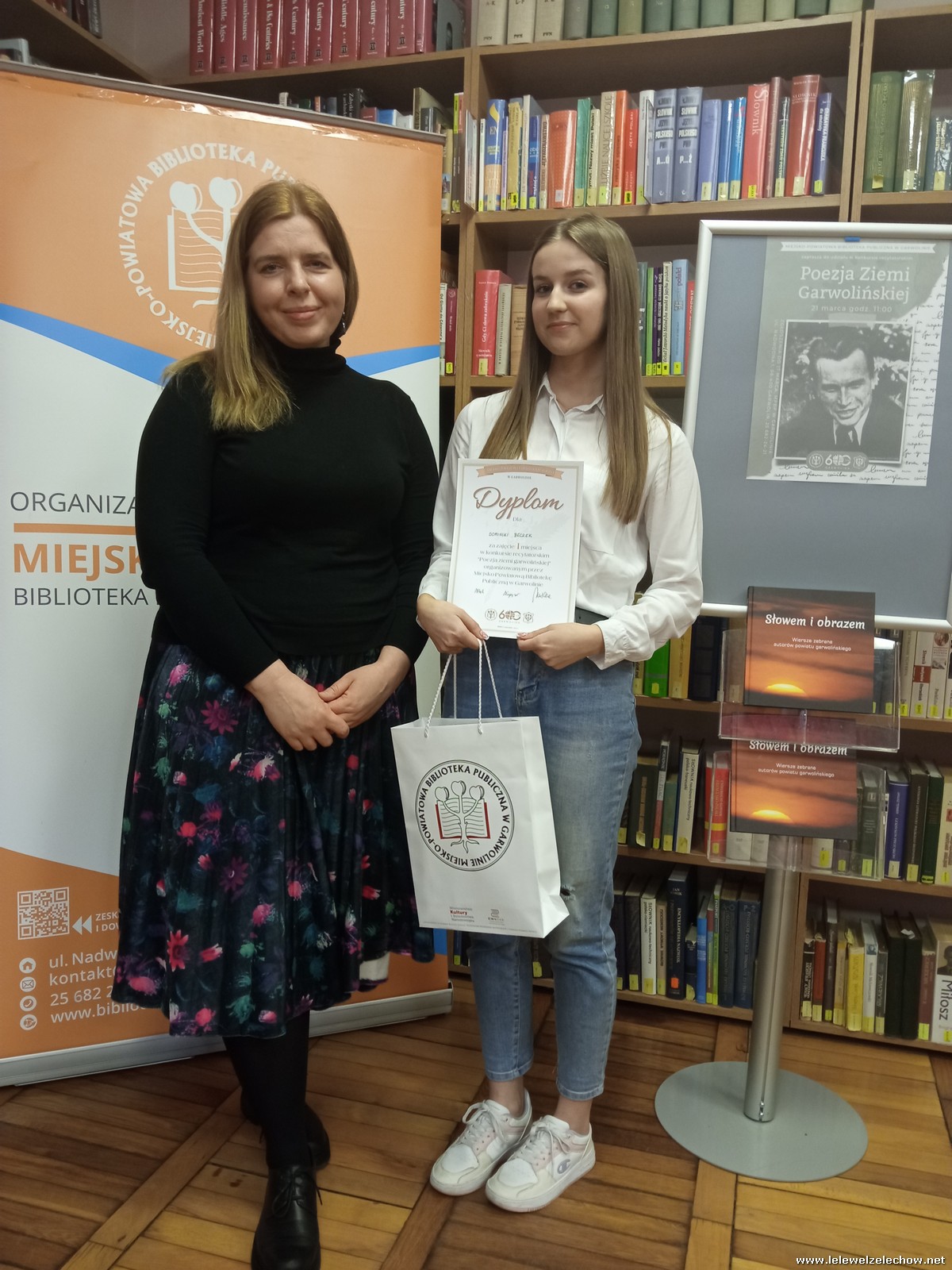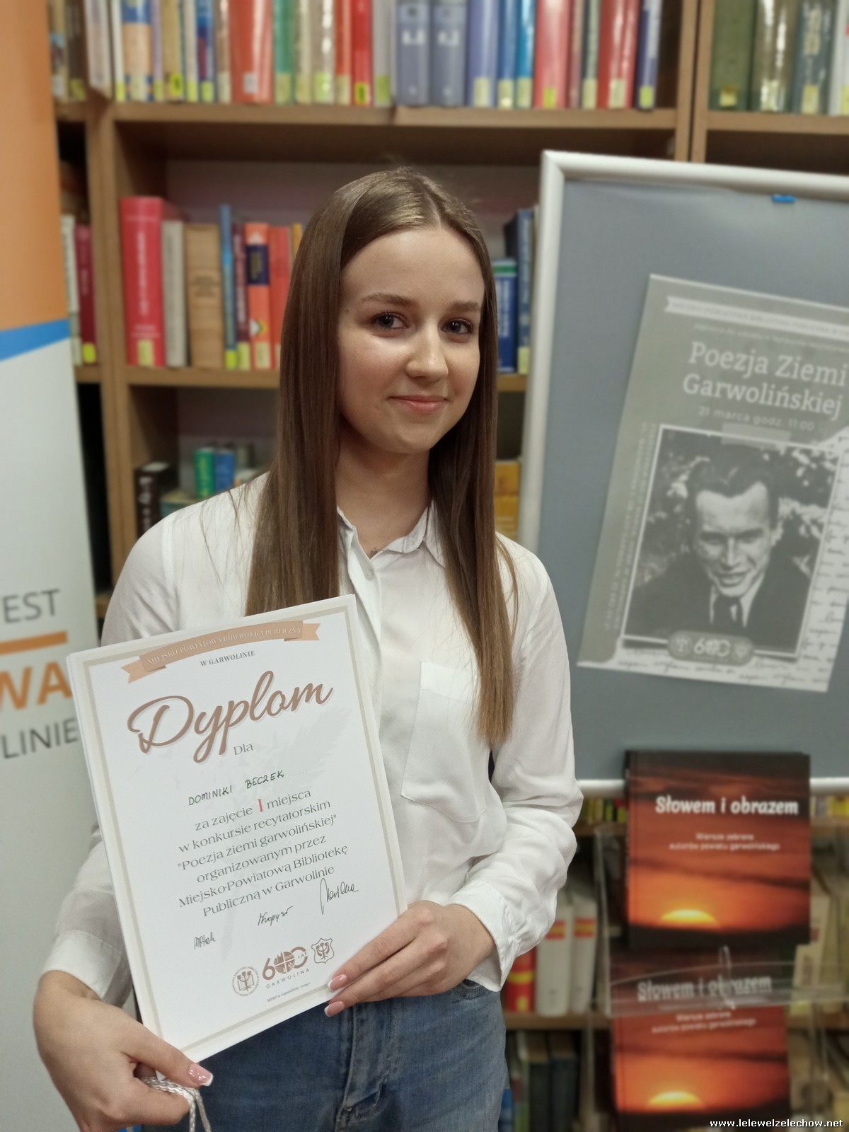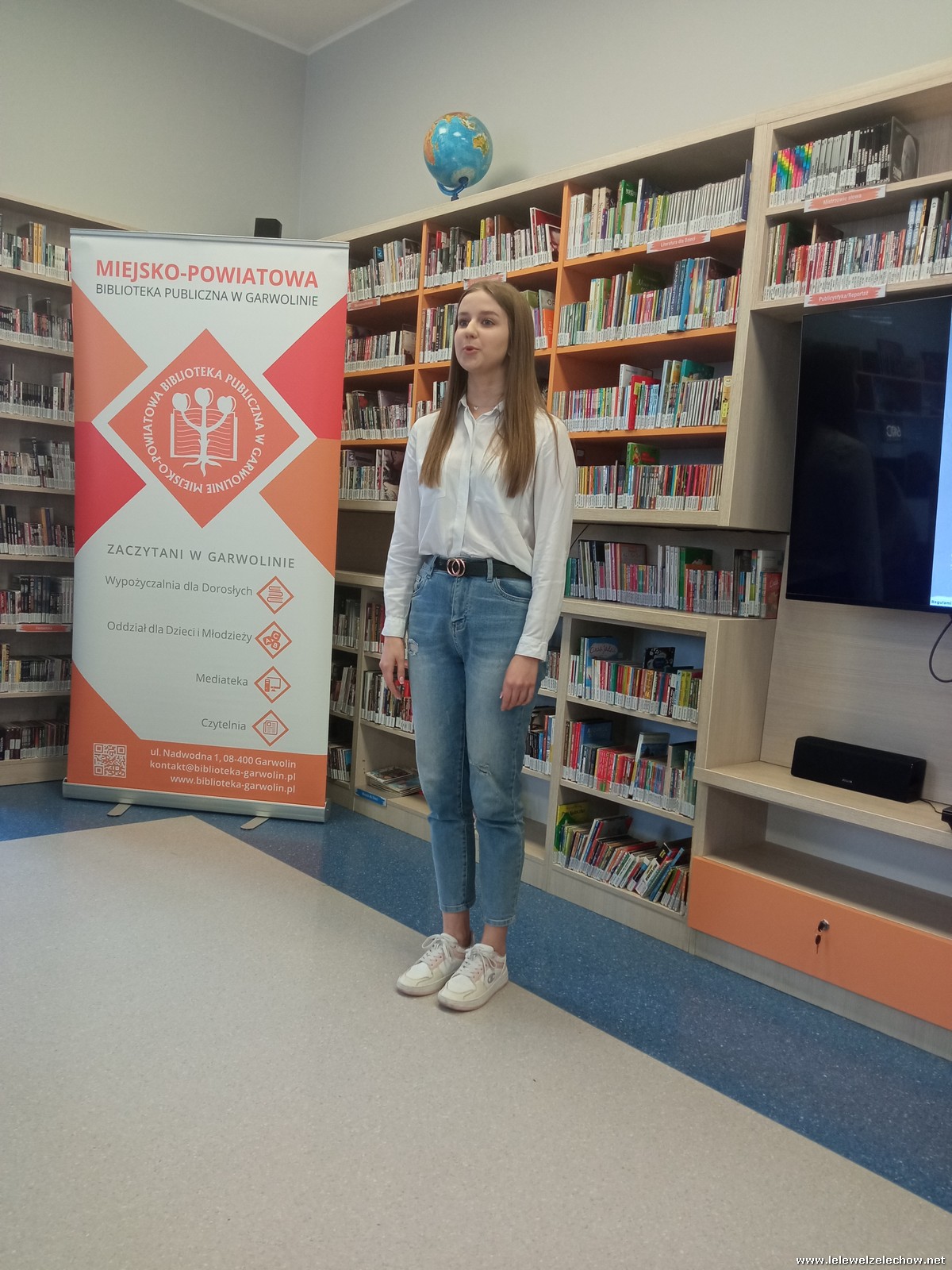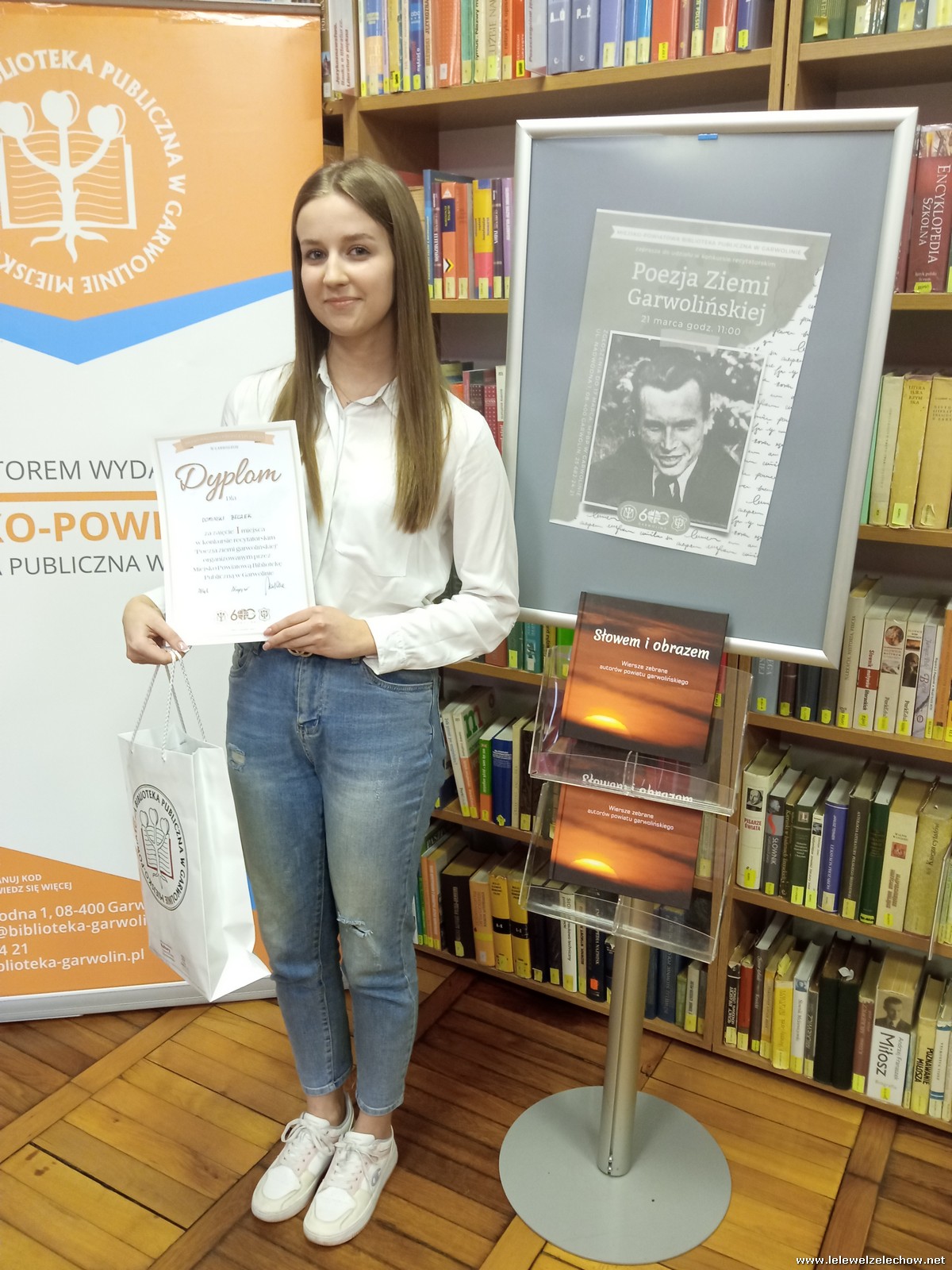 Miejska Biblioteka Publiczna w Garwolinie zorganizowała konkurs recytatorski, w którym wzięli udział przedstawiciele różnych szkół powiatowych. Wśród recytujących byli zarówno uczniowie klas podstawowych jak i ponadpodstawowych – w sumie ponad 50 osób. Poezja uczy wrażliwości, daje możliwość zetknięcia się z tym, co czasem nieuchwytne, wyraża emocje i skłania do przemyśleń. Niekiedy bawi, często stawia pytania o sens życia. Tego wszystkiego dało się doświadczyć podczas słuchania recytacji wierszy poetów, którzy mieszkali lub mieszkają w okolicach Garwolina. Różnorodność i piękno tej twórczości zaprezentowali uczestnicy konkursu. Tym bardziej cieszy nas fakt, że I miejsce w tym zdobyła nasza uczennica – Dominika Beczek z klasy II a, która przygotowała wiersz Marii Stefanowskiej „Mój książę”. Opiekunką uczennicy była pani Anna Włodarczyk. Bardzo cieszymy się z tego sukcesu.