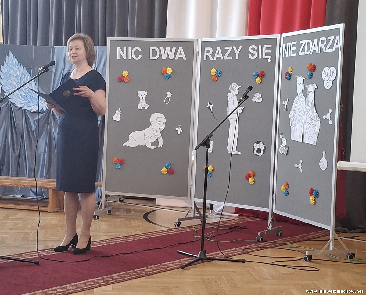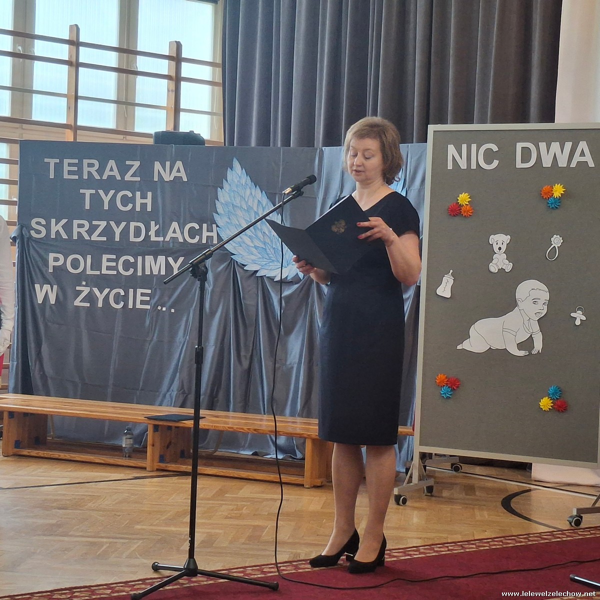 Pani Dyrektor podziękowała także wychowawcom za opiekę nad klasami, wdrażanie do szkolnego życia, motywowanie do nauki, a nauczycielom za przekazywanie wiedzy i pracę, jaką włożyli w przygotowanie uczniów do matury. Zwróciła się także do rodziców, wyrażając wdzięczność za współpracę i doceniając trud włożony w wychowanie swoich dzieci.