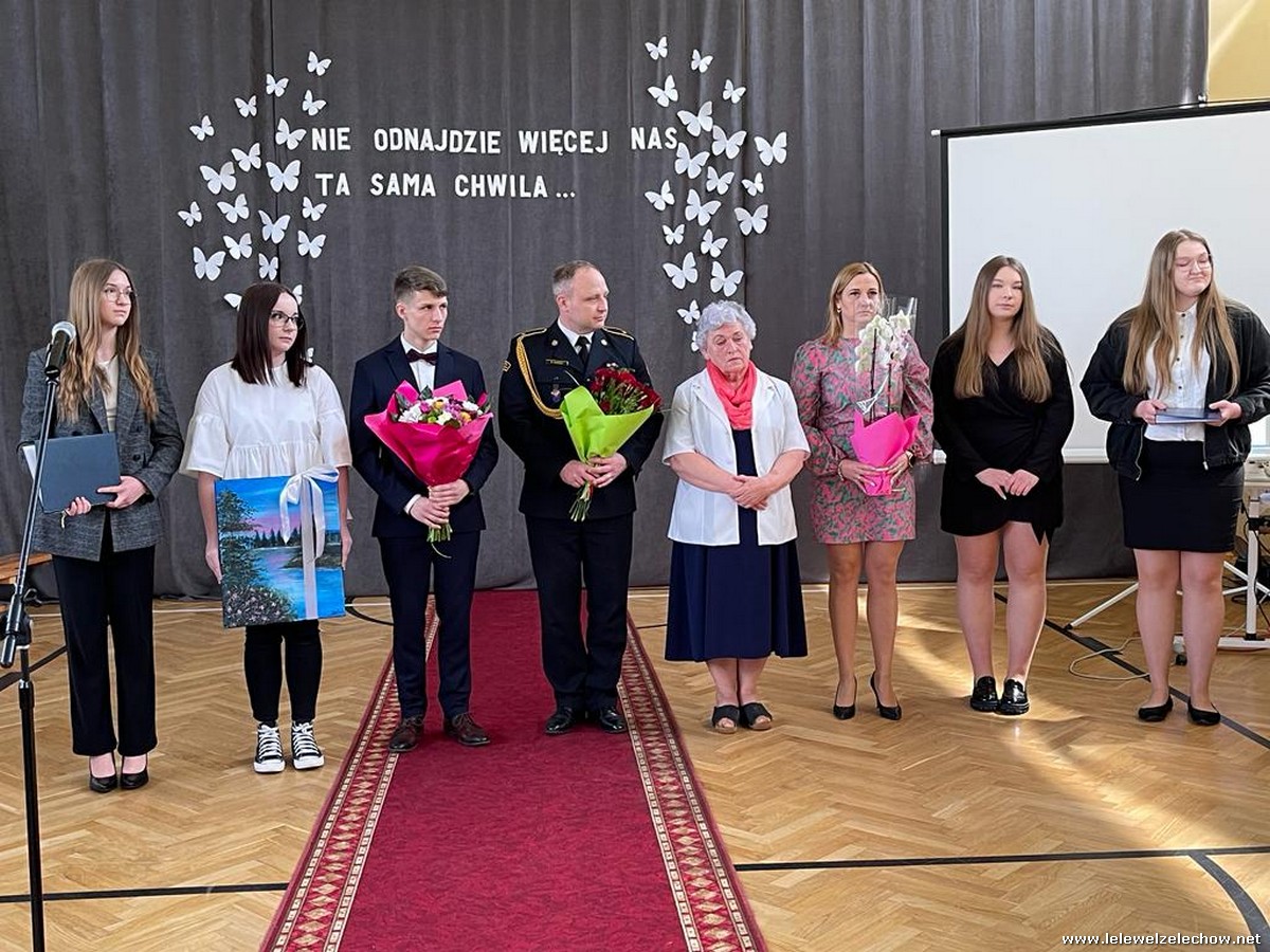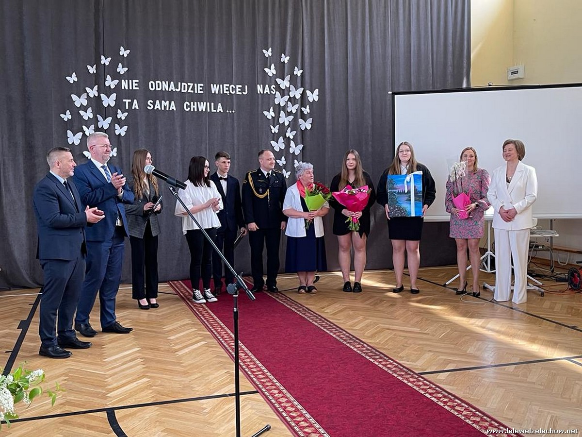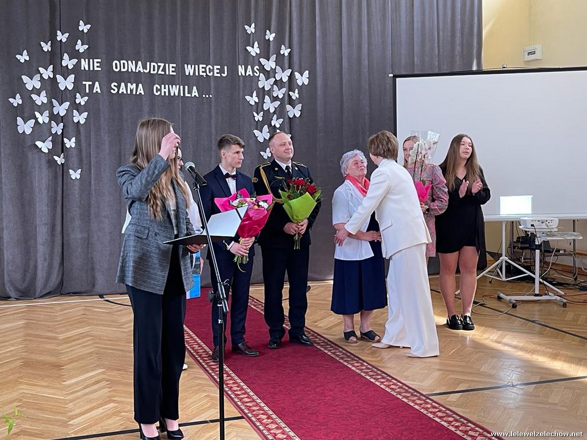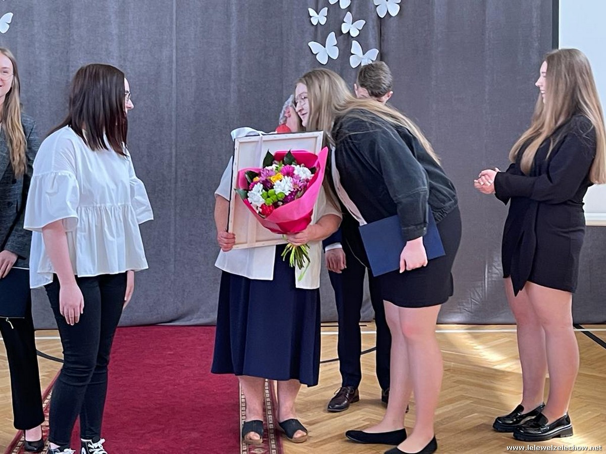 Cała społeczność szkolna pożegnała panią Basię. Samorząd Uczniowski w imieniu wszystkich obecnych uczniów oraz wielu wcześniejszych roczników podziękował za dobroć, otwarte serce i pomoc. Licealiści wręczyli kwiaty oraz specjalnie namalowany przez Amelię Borek obraz. Życzenia i podziękowania złożyła pani Dyrektor Sylwia Tomaszek, nauczyciele i pracownicy niepedagogiczni szkoły. Do życzeń dołączyli pan Starosta oraz pan Burmistrz- absolwent szkoły.