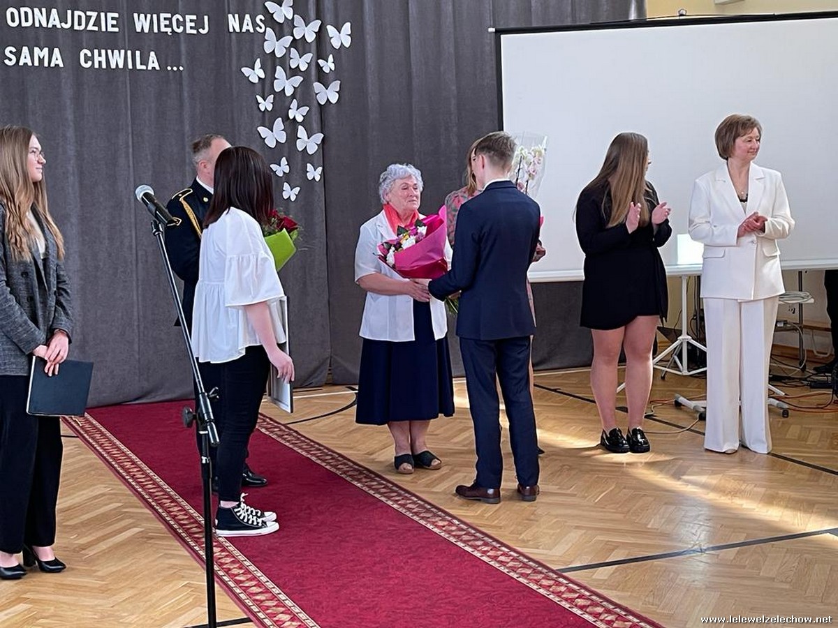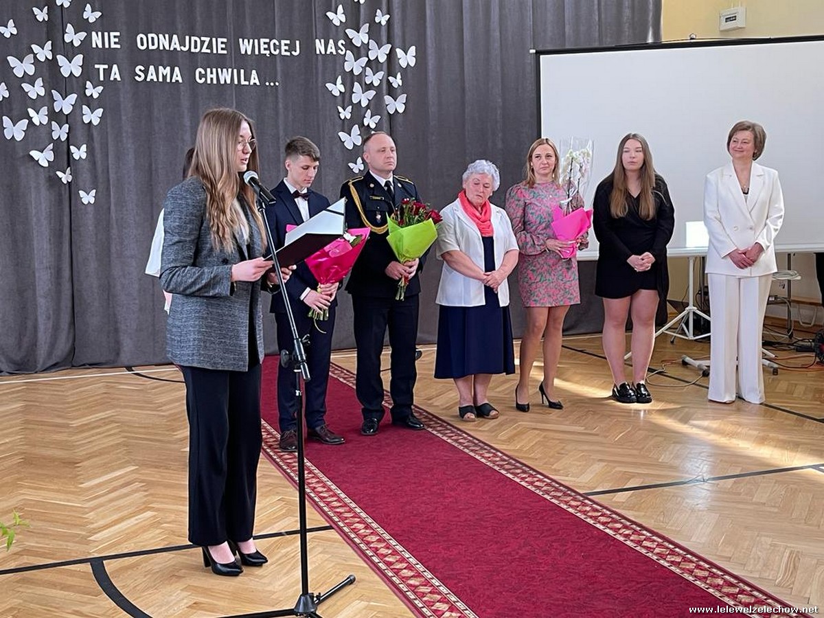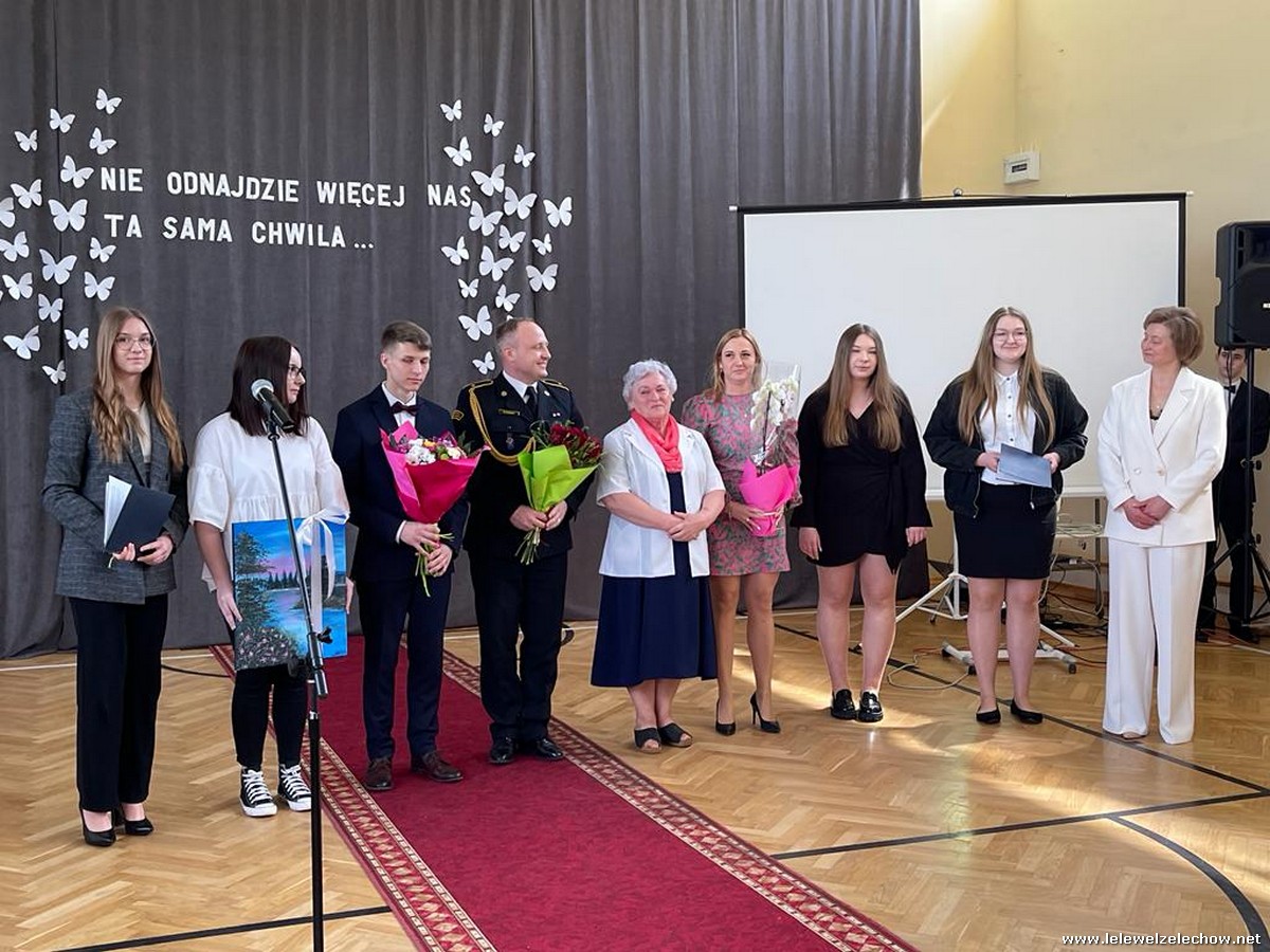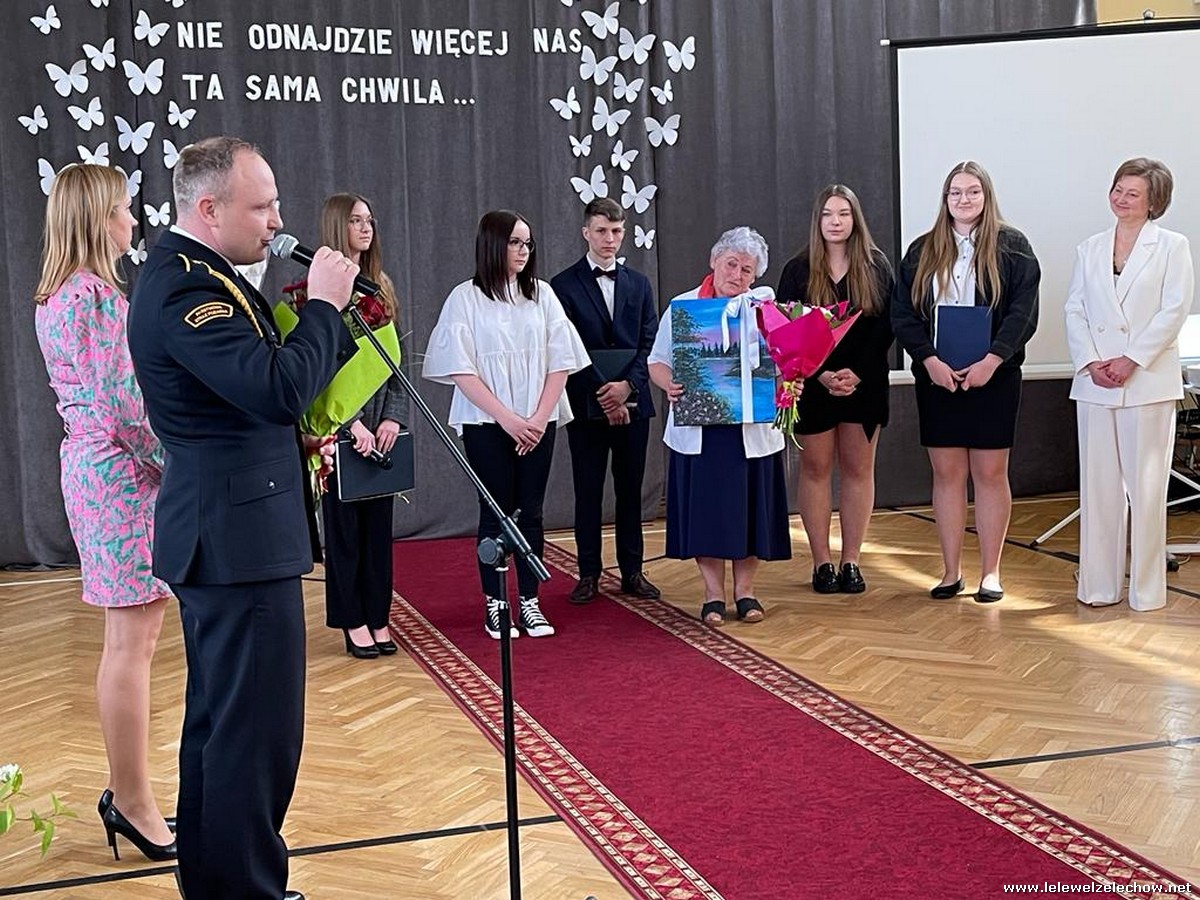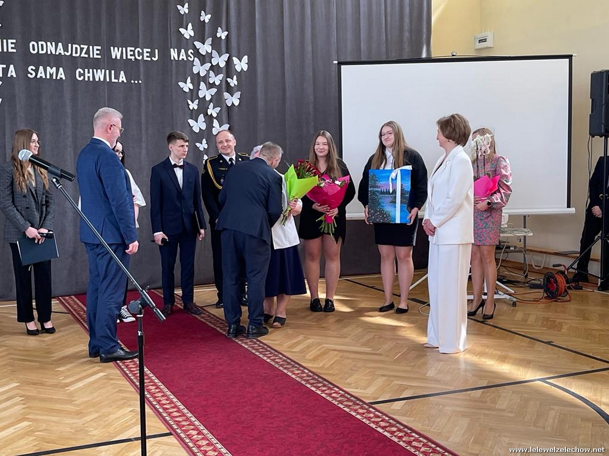 Cała społeczność szkolna pożegnała panią Basię. Samorząd Uczniowski w imieniu wszystkich obecnych uczniów oraz wielu wcześniejszych roczników podziękował za dobroć, otwarte serce i pomoc. Licealiści wręczyli kwiaty oraz specjalnie namalowany przez Amelię Borek obraz. Życzenia i podziękowania złożyła pani Dyrektor Sylwia Tomaszek, nauczyciele i pracownicy niepedagogiczni szkoły. Do życzeń dołączyli pan Starosta oraz pan Burmistrz- absolwent szkoły.