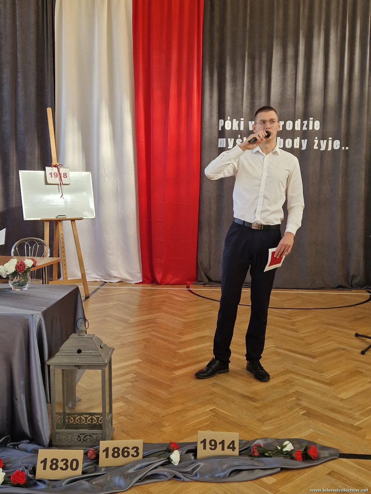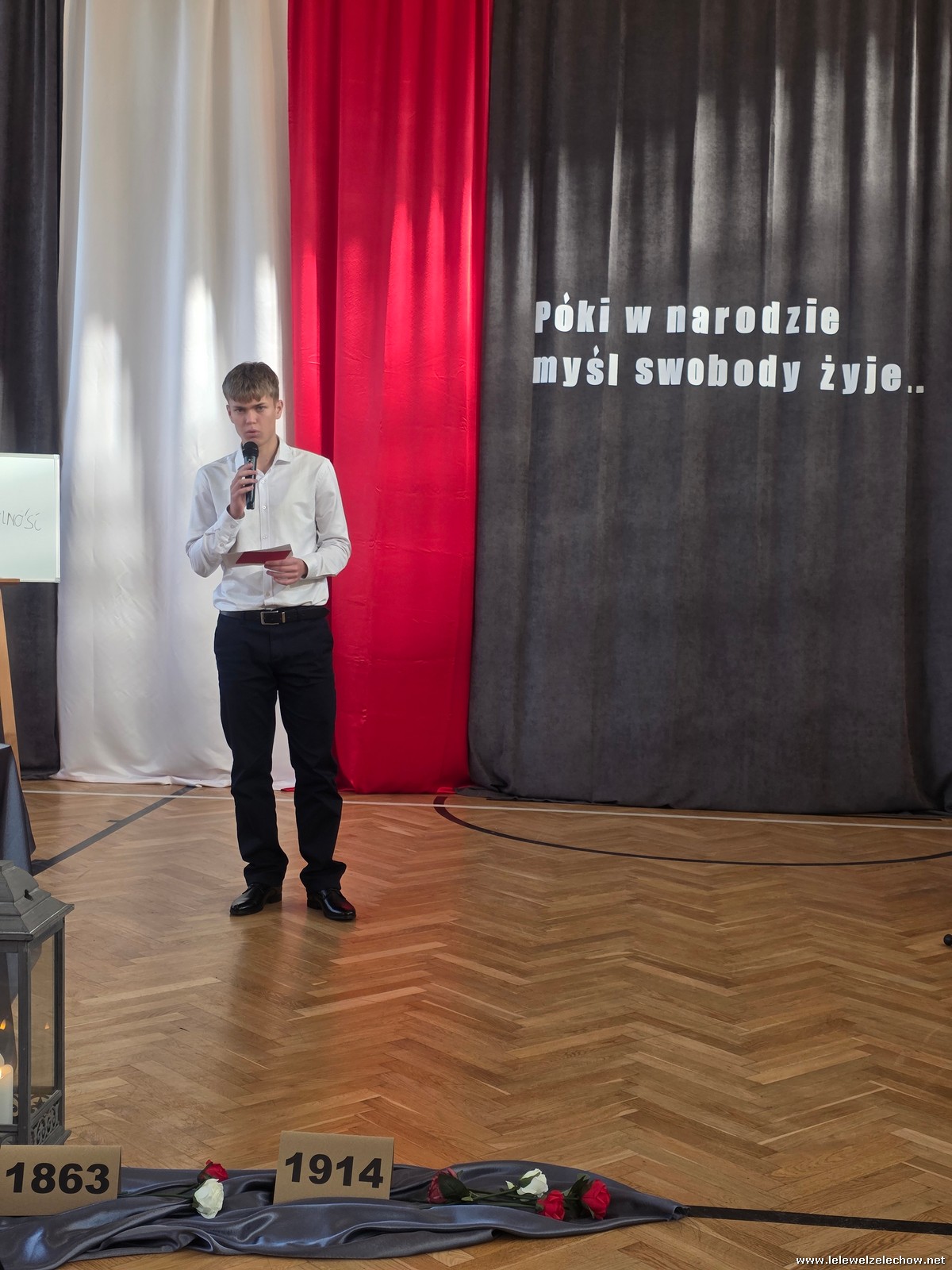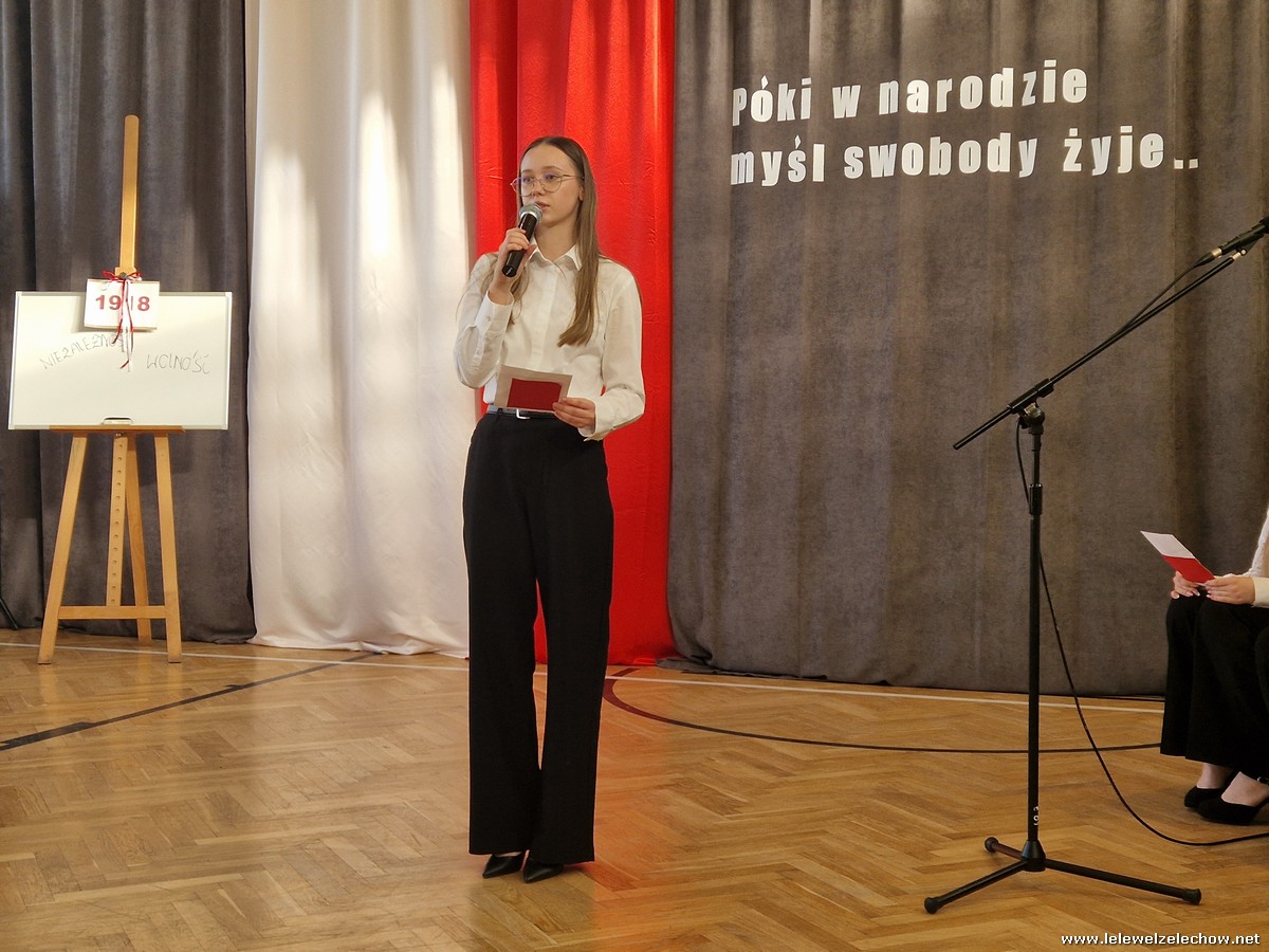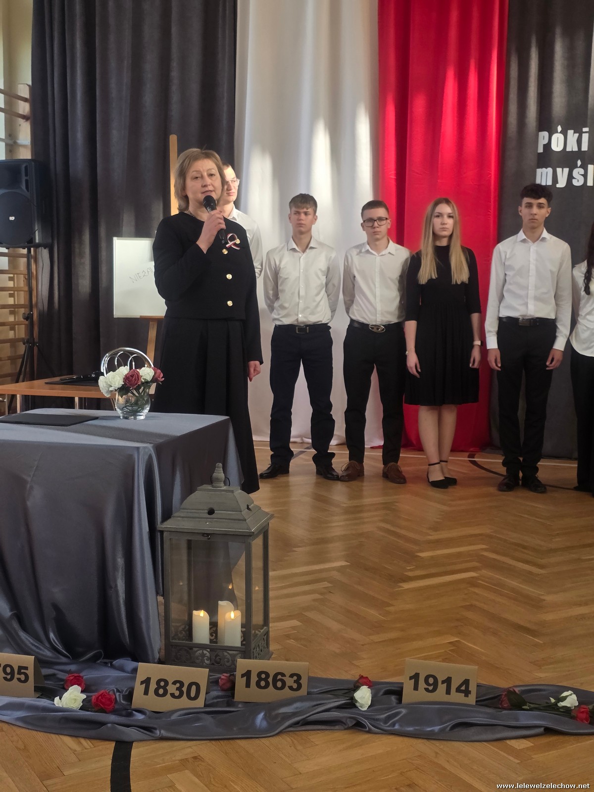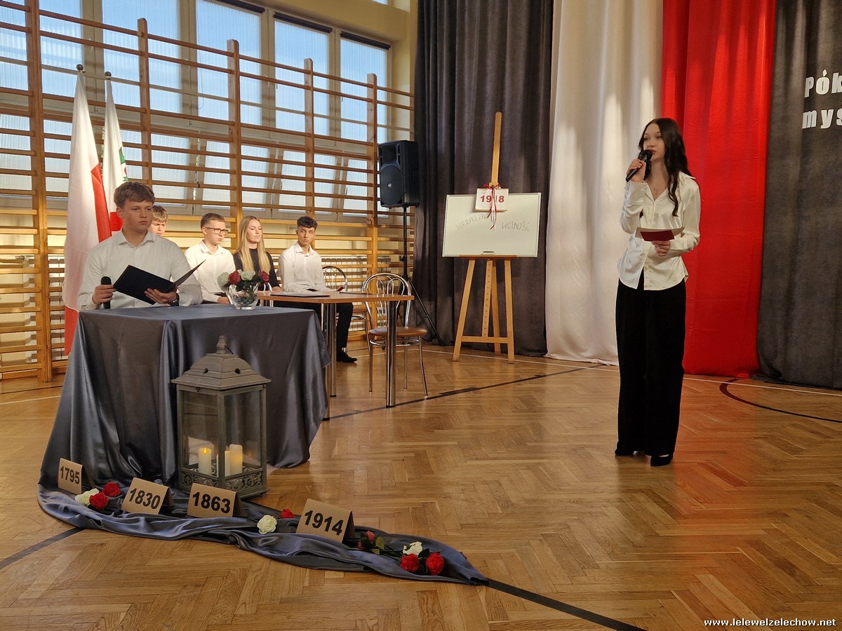 Uczniowie klas III poprowadzili nas pieśnią i poezją przez czas 123 lat polskiej niewoli. Od rozbiorów, poprzez zrywy niepodległościowe, walkę o polskość pod zaborami, czyn zbrojny I wojny światowej aż po uzyskanie upragnionej wolności. To tę wartość wielokrotnie podkreślano w programie, zaznaczając, że nie była ona również w 1918 roku Polakom dana raz na zawsze...