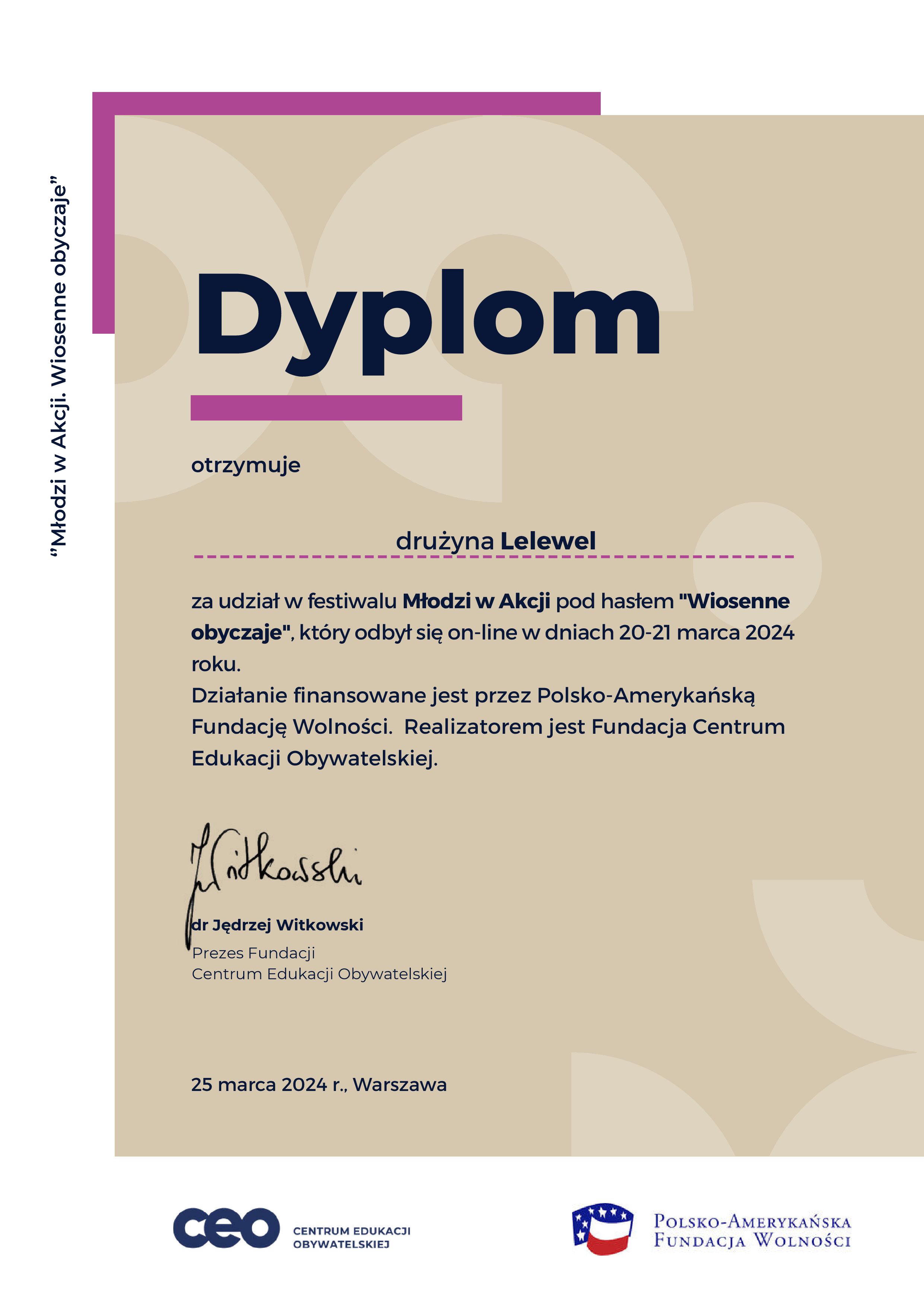 Miło nam poinformować,że drużyna ,,LELEWEL,, realizująca projekt Centrum Edukacji Obywatelskiej:,,Mapa wiosny. Na ludowo,, uzyskała wyróżnienie za udział w festiwalu internetowym odbywającym się w dniach 20-21 marca. Dziewczyny 2c stanowiły jedną z 65 drużyn biorących udział w tym wydarzeniu. Do 16 szkół, w tym naszego liceum organizatorzy przekazali Dyplom i nagrody. Widać, że sprawiły one radość:)