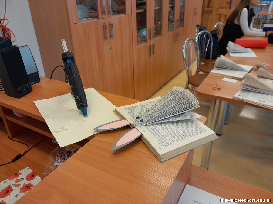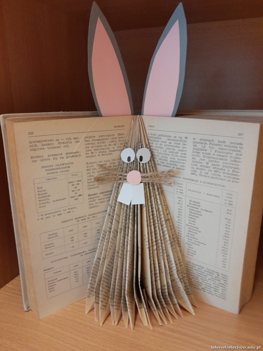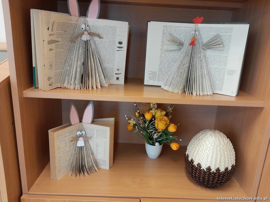 Podczas zajęć bibliotecznych, pod kierunkiem pani Anny Czarneckiej-Górskiej, nasi uczniowie przygotowali ozdoby wielkanocne wykorzystując stare, nieaktualne książki. Powstały urocze zajączki i kurczaczki, które ozdobiły półki biblioteki szkolnej oraz świetlicy.