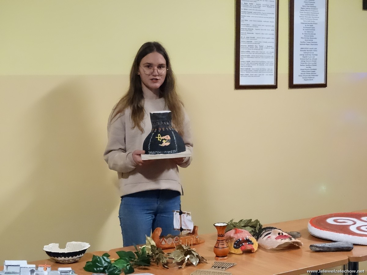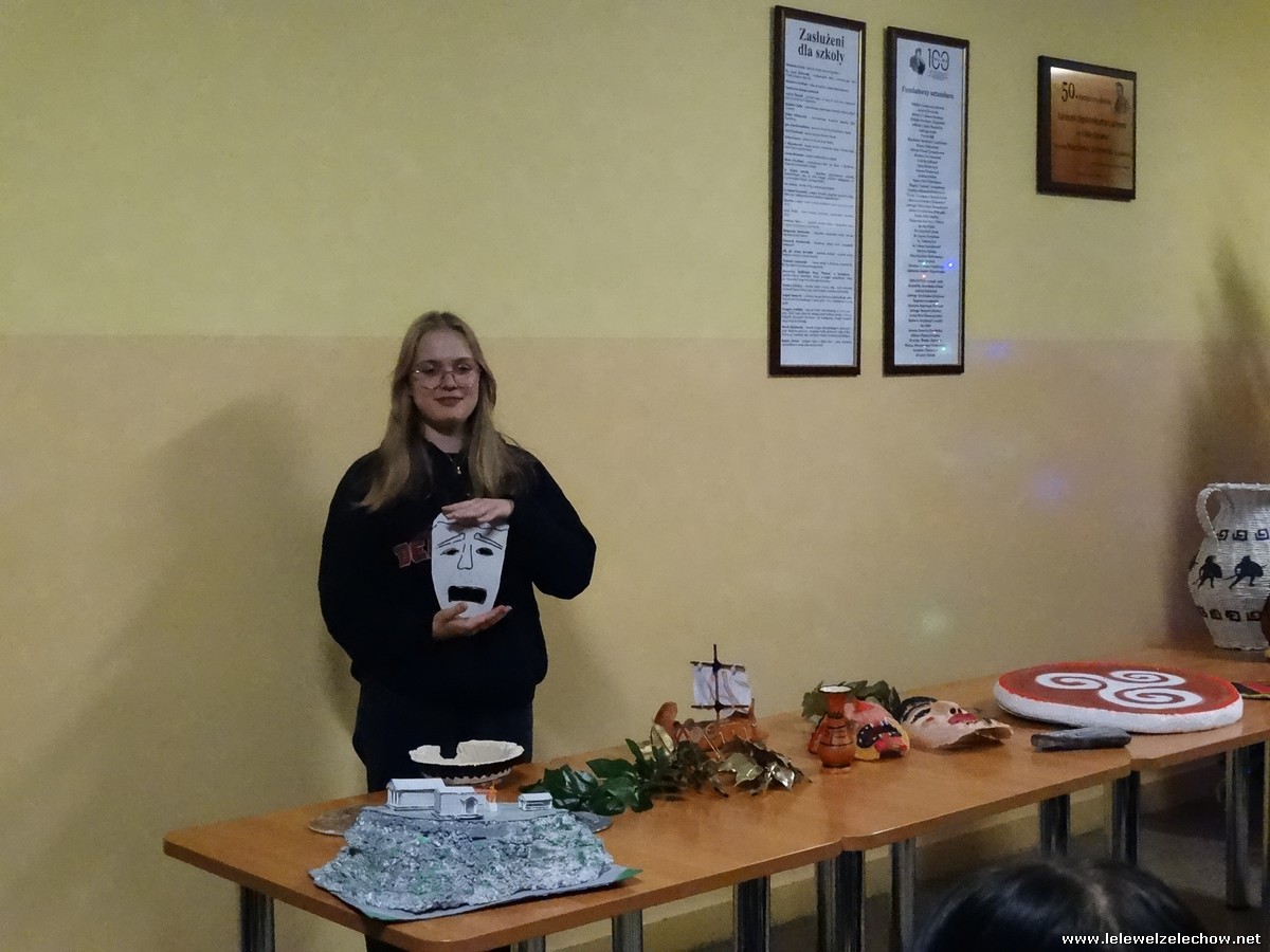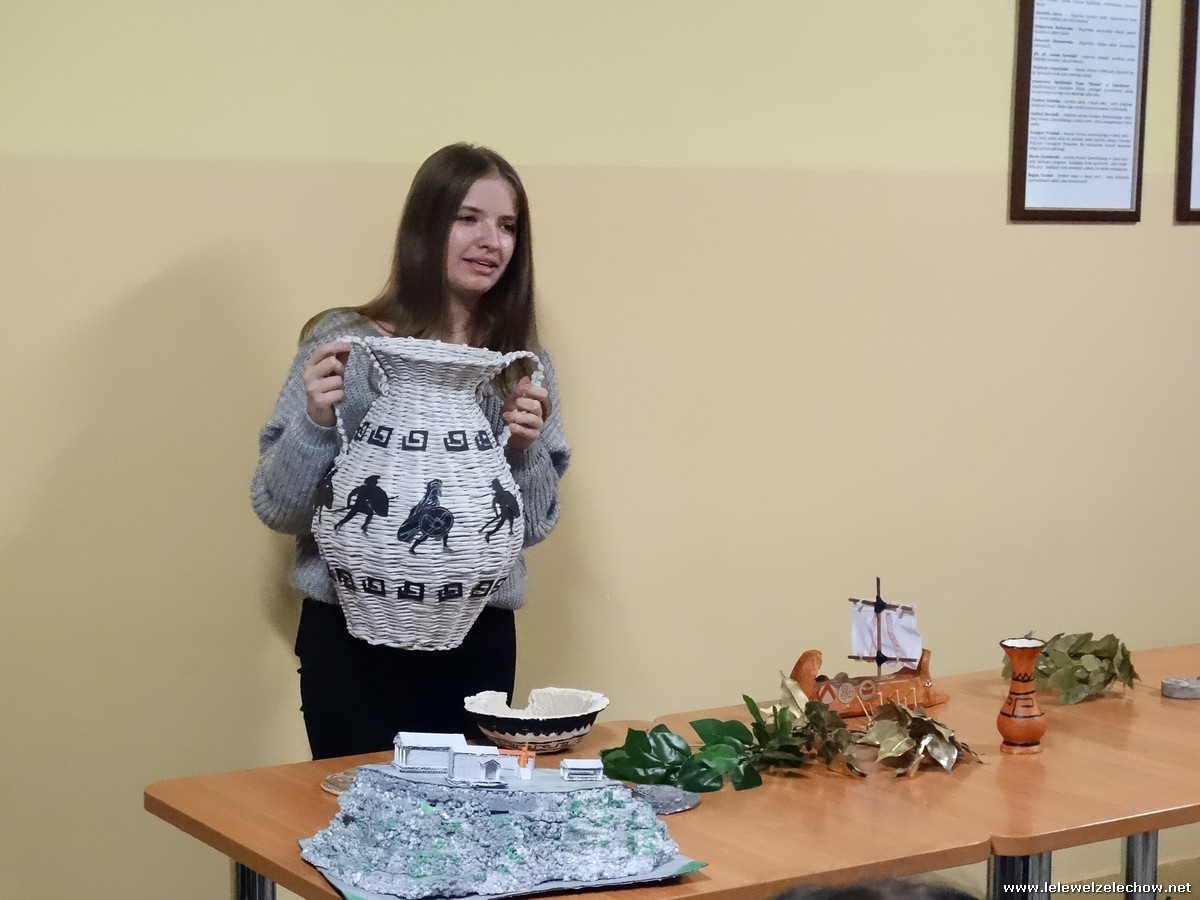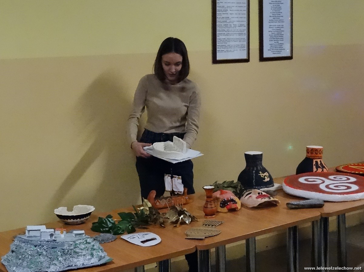 Wśród przygotowanych prac pojawiły się: wieńce laurowe, maski teatralne, wazy greckie, tarcze, tzw. hoplony, monety oraz ostrakon, model świątyni greckiej, kolumny doryckiej, triery - okrętu ateńskiego oraz teatru i Akropolu. Uczniowie przedstawiali przygotowane przez siebie prace jednocześnie przedstawiając do czego służyły starożytnym Grekom. Były to prace wykonane w różnej technice ale zwracały uwagę pomysłowością oraz starannością wykonania. Po zakończeniu prezentacji pani Urszula Kobielus - nauczyciel historii, podziękowała uczniom za przygotowane eksponaty oraz krótko omówiła całość projektu. W lekcji uczestniczyła, obserwując prezentacje uczniowskie, pani dyrektor- Sylwia Tomaszek.