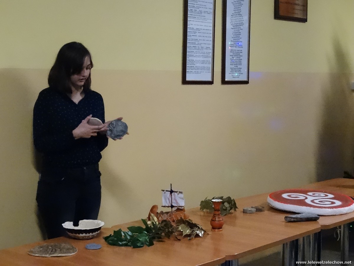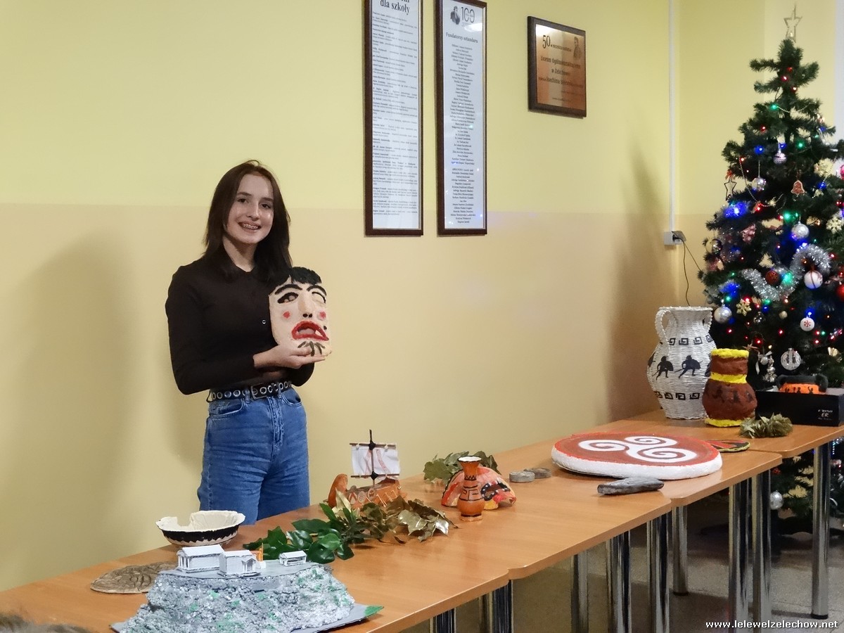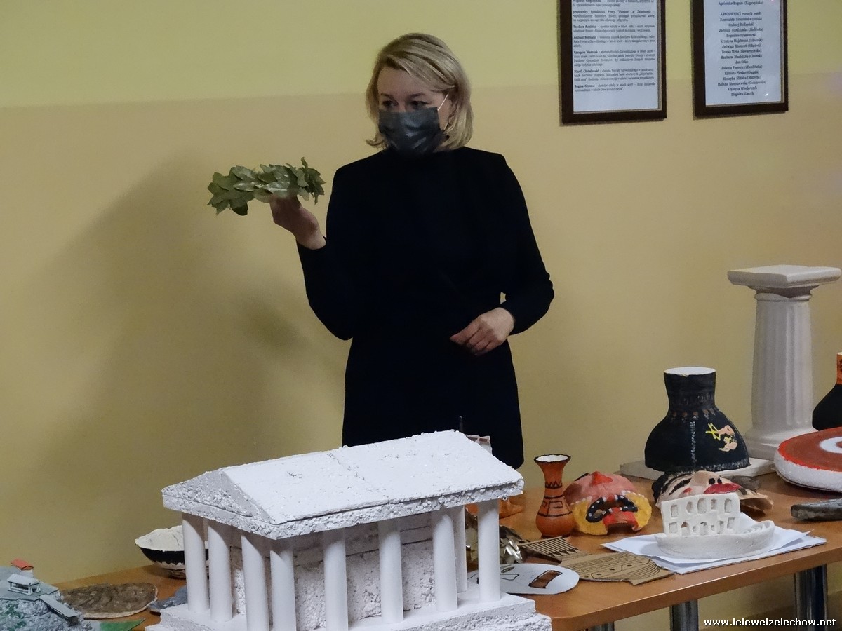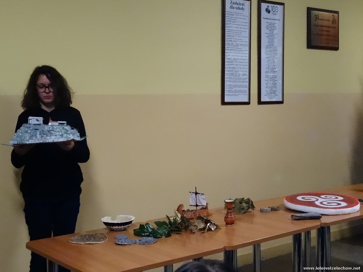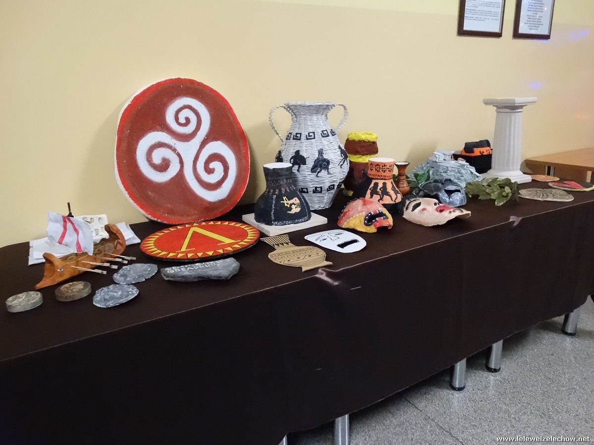 Wśród przygotowanych prac pojawiły się: wieńce laurowe, maski teatralne, wazy greckie, tarcze, tzw. hoplony, monety oraz ostrakon, model świątyni greckiej, kolumny doryckiej, triery - okrętu ateńskiego oraz teatru i Akropolu. Uczniowie przedstawiali przygotowane przez siebie prace jednocześnie przedstawiając do czego służyły starożytnym Grekom. Były to prace wykonane w różnej technice ale zwracały uwagę pomysłowością oraz starannością wykonania. Po zakończeniu prezentacji pani Urszula Kobielus - nauczyciel historii, podziękowała uczniom za przygotowane eksponaty oraz krótko omówiła całość projektu. W lekcji uczestniczyła, obserwując prezentacje uczniowskie, pani dyrektor- Sylwia Tomaszek.