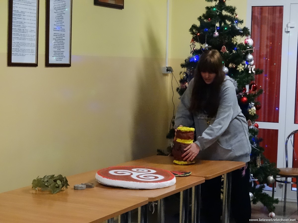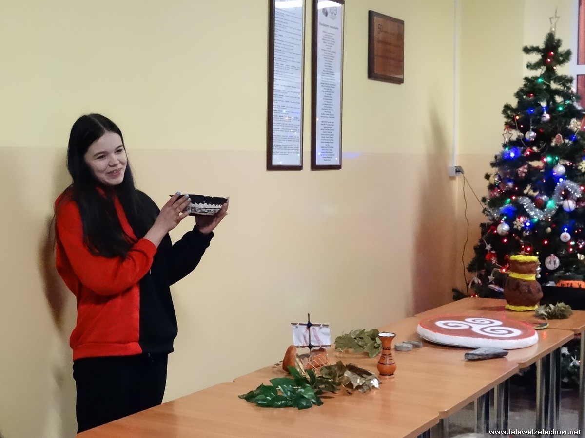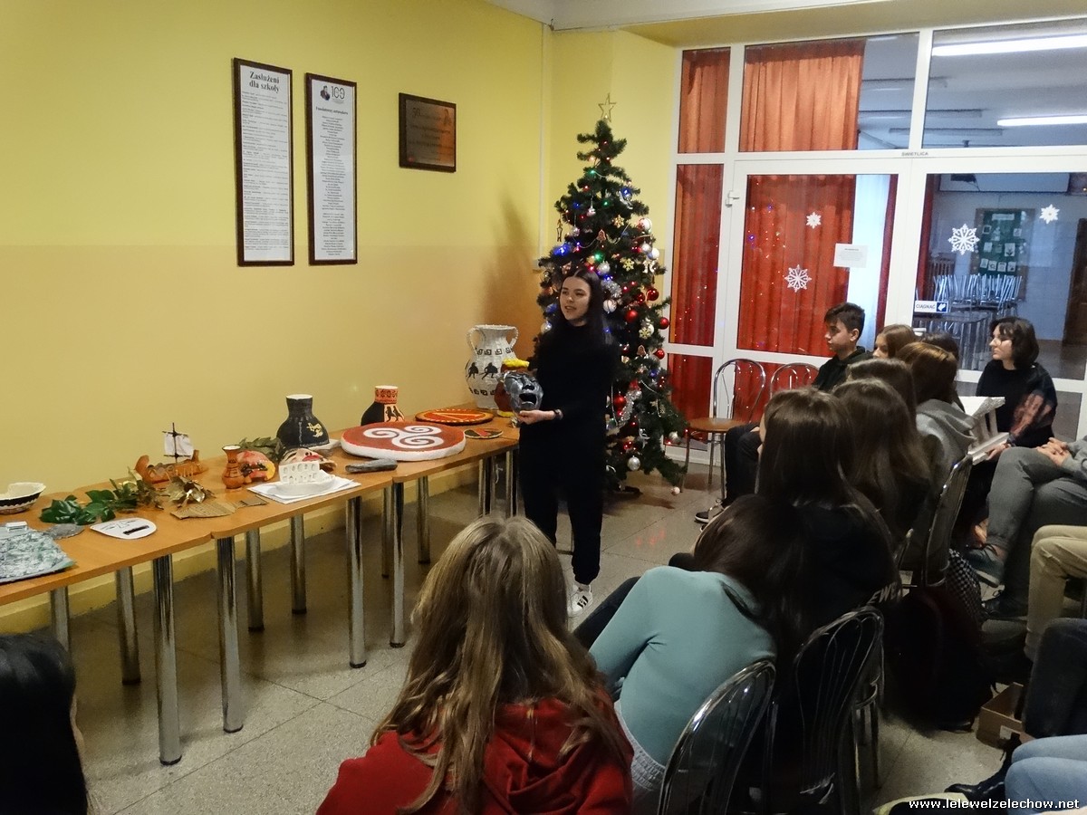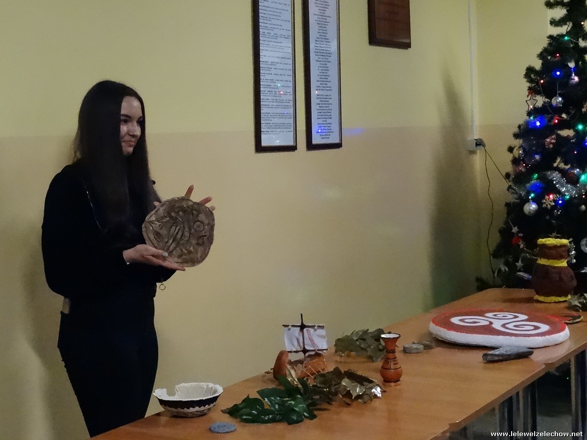 Wśród przygotowanych prac pojawiły się: wieńce laurowe, maski teatralne, wazy greckie, tarcze, tzw. hoplony, monety oraz ostrakon, model świątyni greckiej, kolumny doryckiej, triery - okrętu ateńskiego oraz teatru i Akropolu. Uczniowie przedstawiali przygotowane przez siebie prace jednocześnie przedstawiając do czego służyły starożytnym Grekom. Były to prace wykonane w różnej technice ale zwracały uwagę pomysłowością oraz starannością wykonania. Po zakończeniu prezentacji pani Urszula Kobielus - nauczyciel historii, podziękowała uczniom za przygotowane eksponaty oraz krótko omówiła całość projektu. W lekcji uczestniczyła, obserwując prezentacje uczniowskie, pani dyrektor- Sylwia Tomaszek.