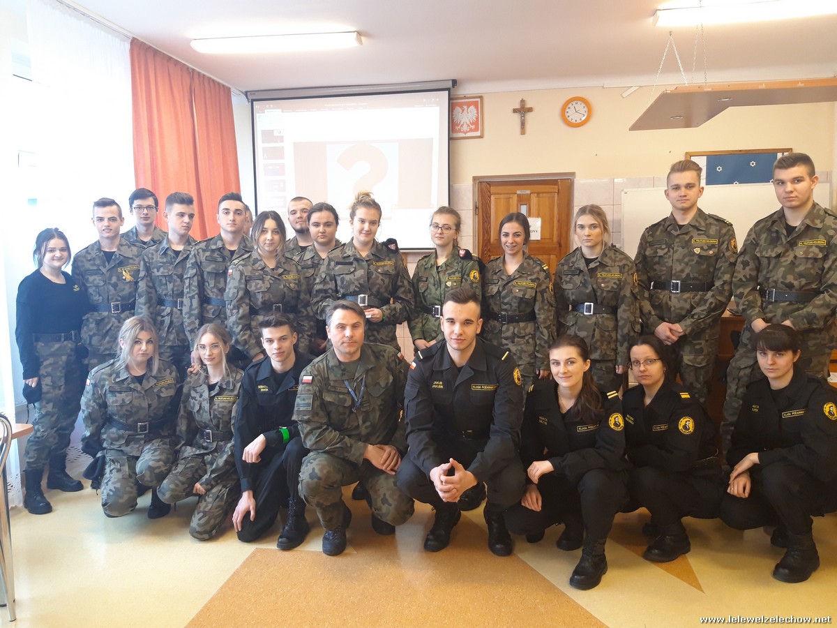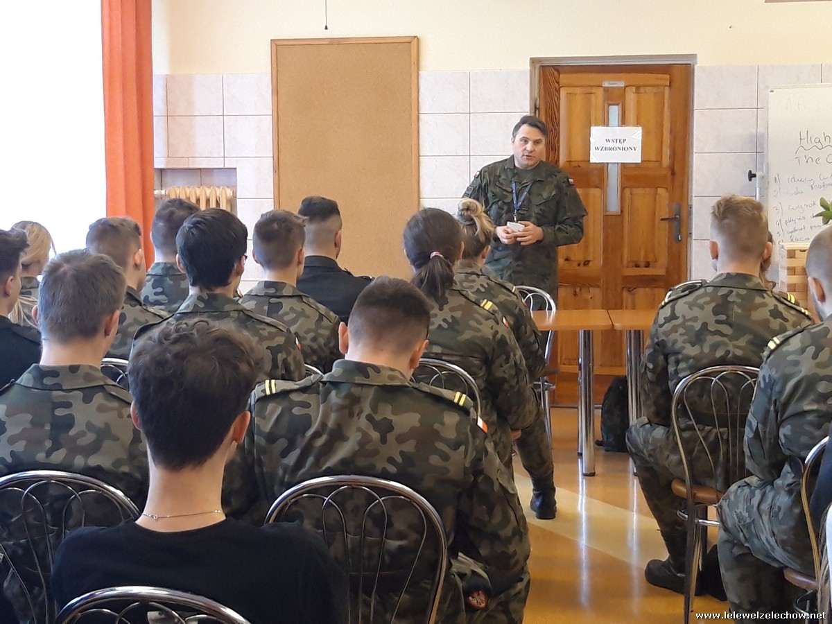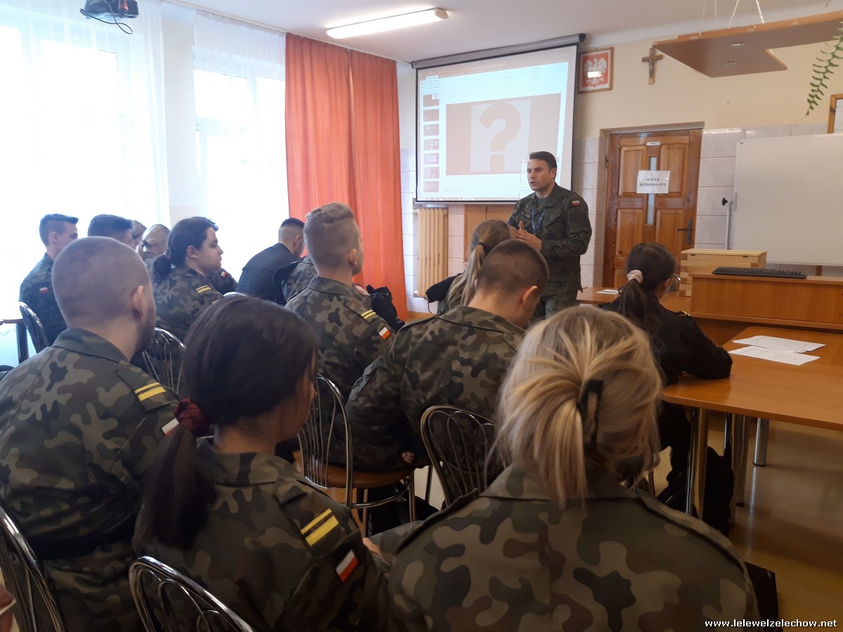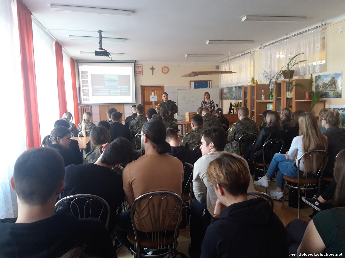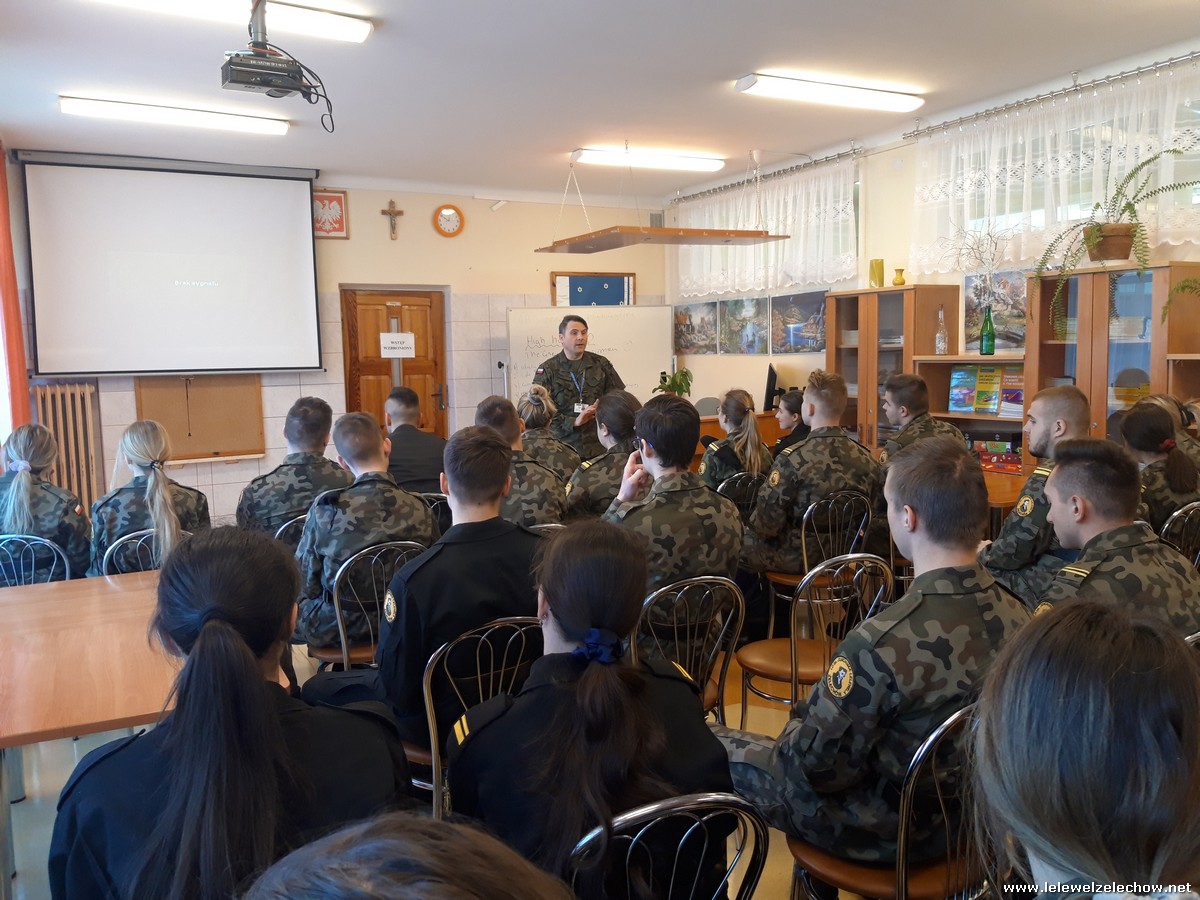 4 marca uczniowie klas 3a i 3b (mundurowi i nie mundurowi) spotkali się z przedstawicielem Wojskowej Komendy Uzupełnień w Garwolinie. Uczniowie dowiedzieli się o zbliżającej się tzw. kwalifikacji wojskowej dla ich rocznika jak również o wielu innych kwestiach związanych ze służbą w wojsku, a także planowanymi zmianami związanymi z projektem Ustawy o obronie ojczyzny. Uczniowie z uwagą wysłuchali słów prelegenta- szefa Wydziału Rekrutacji WKU- majora Sylwestra Kulika.