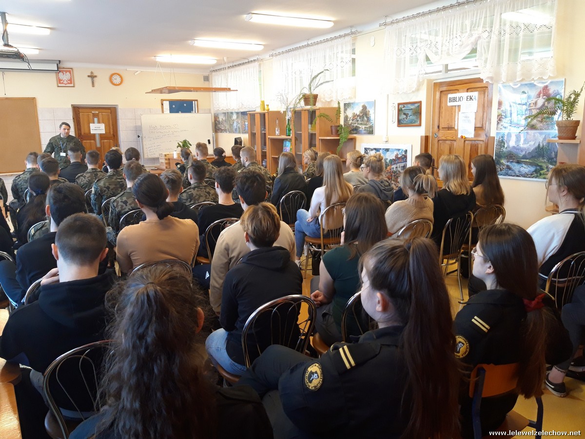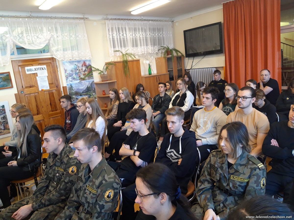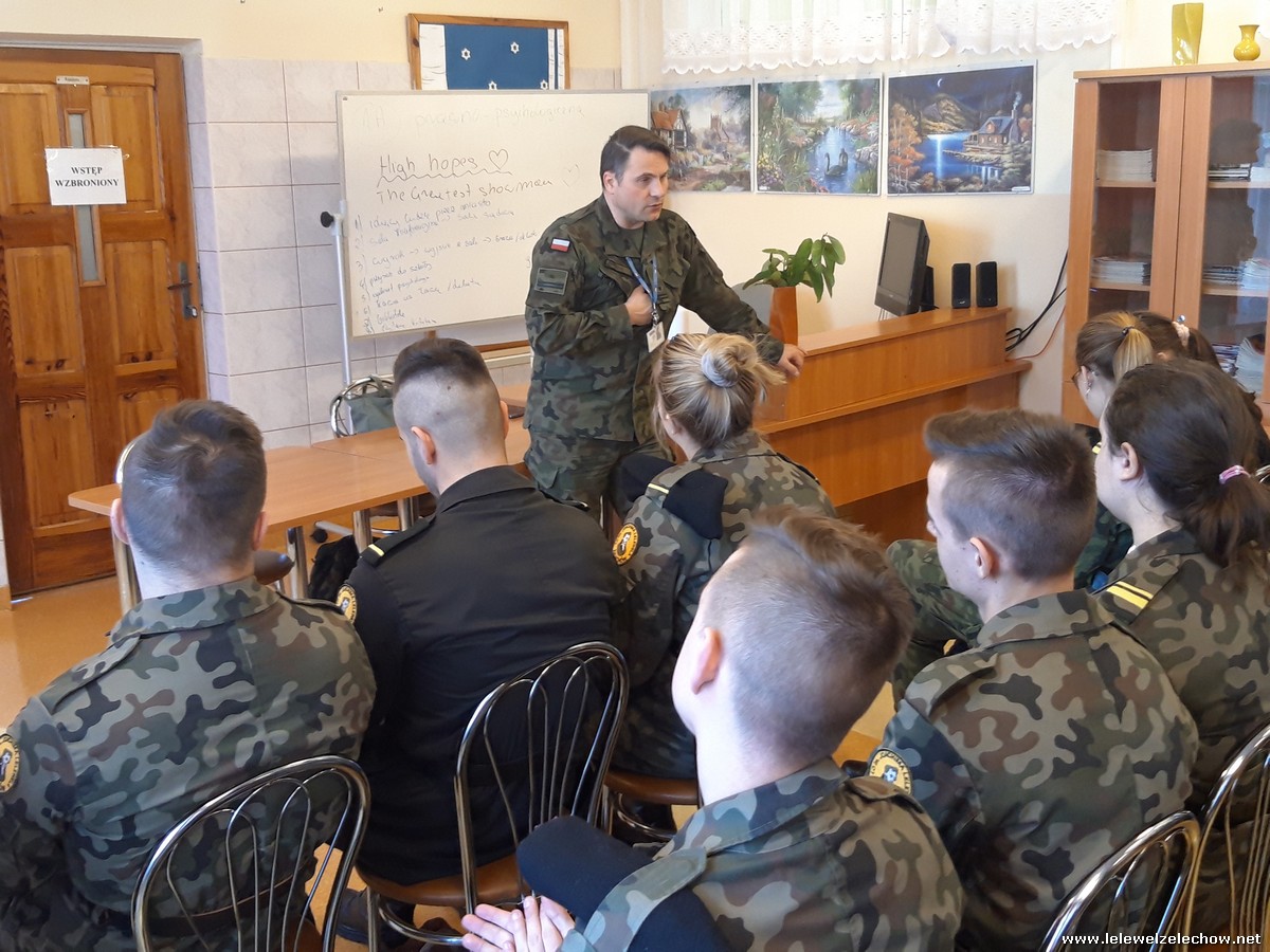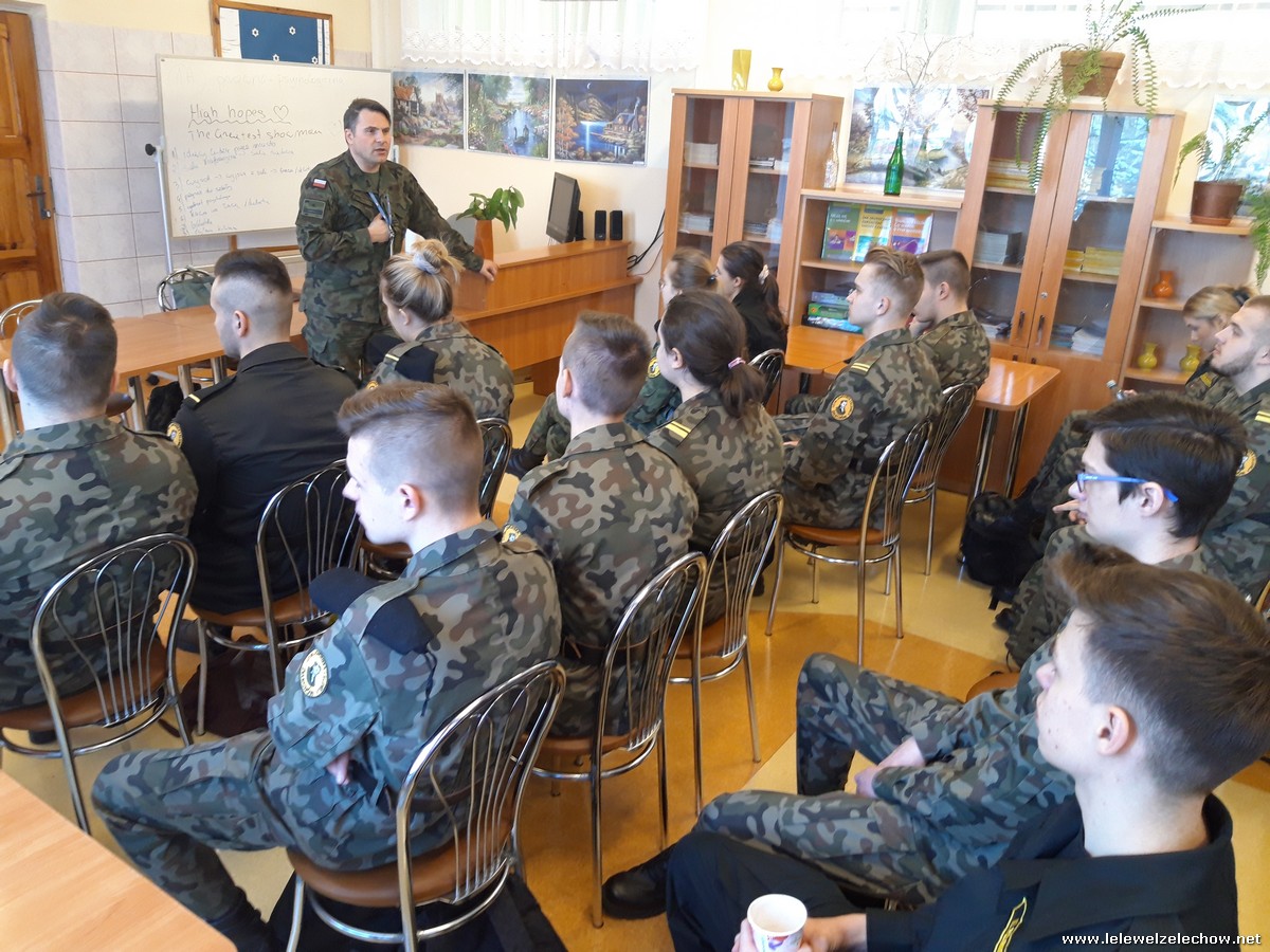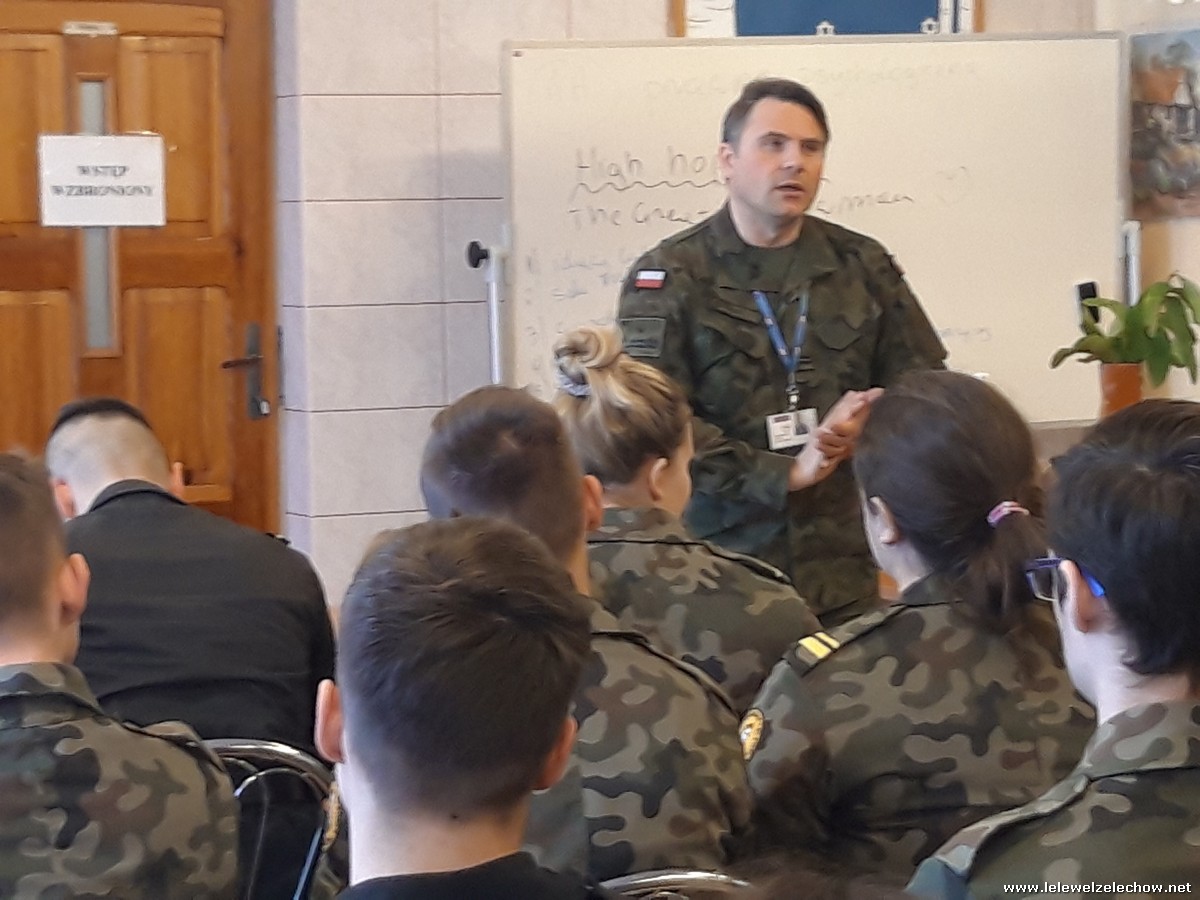 4 marca uczniowie klas 3a i 3b (mundurowi i nie mundurowi) spotkali się z przedstawicielem Wojskowej Komendy Uzupełnień w Garwolinie. Uczniowie dowiedzieli się o zbliżającej się tzw. kwalifikacji wojskowej dla ich rocznika jak również o wielu innych kwestiach związanych ze służbą w wojsku, a także planowanymi zmianami związanymi z projektem Ustawy o obronie ojczyzny. Uczniowie z uwagą wysłuchali słów prelegenta- szefa Wydziału Rekrutacji WKU- majora Sylwestra Kulika.