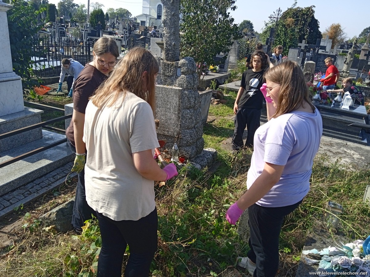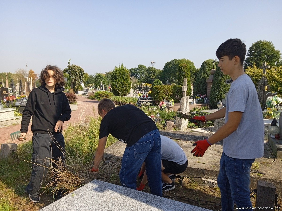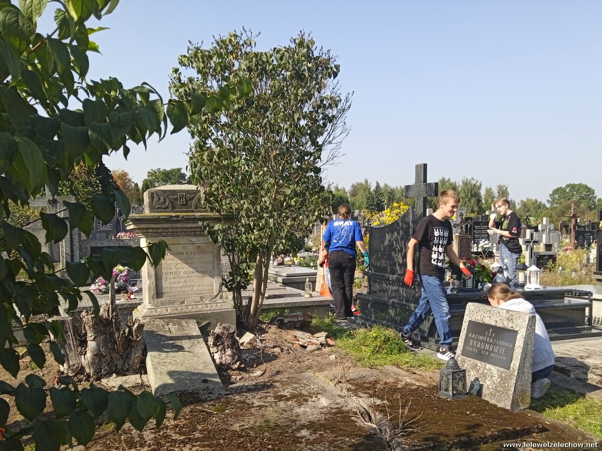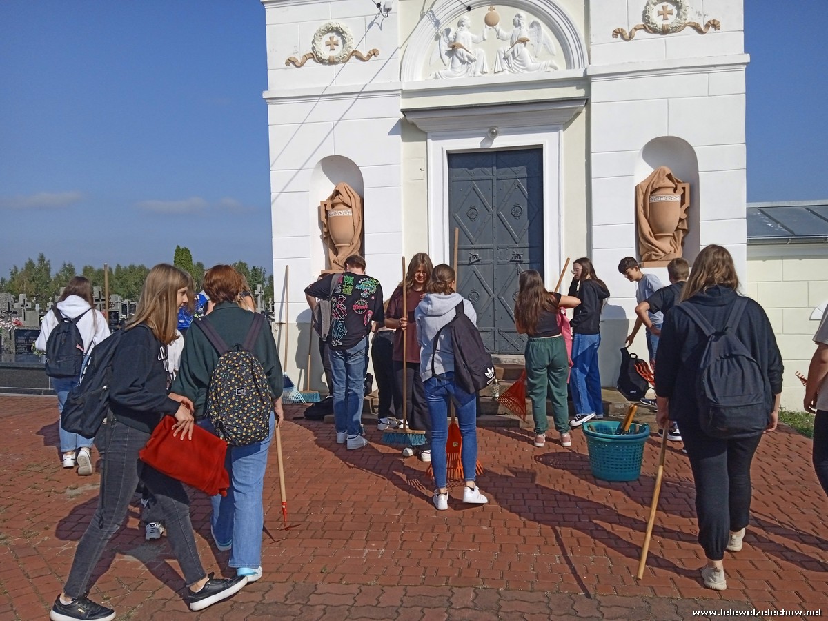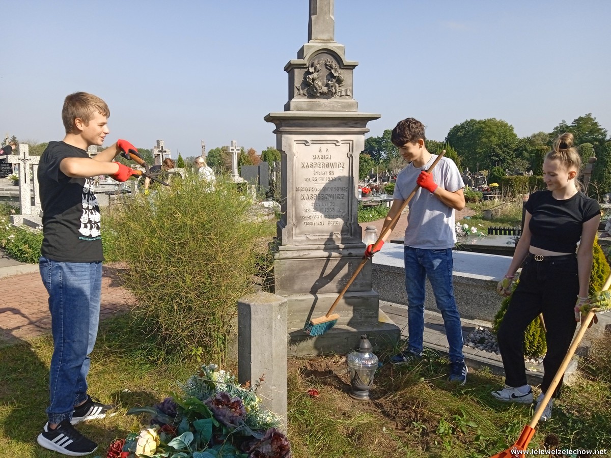 Tradycyjne sprzątanie zabytkowych nagrobków na cmentarzu w Żelechowie. Przy sprzyjającej wrześniowo-letniej pogodzie prace porządkowe, pod kierunkiem p.Urszuli Kobielus, wykonali uczniowie klas 2ab.