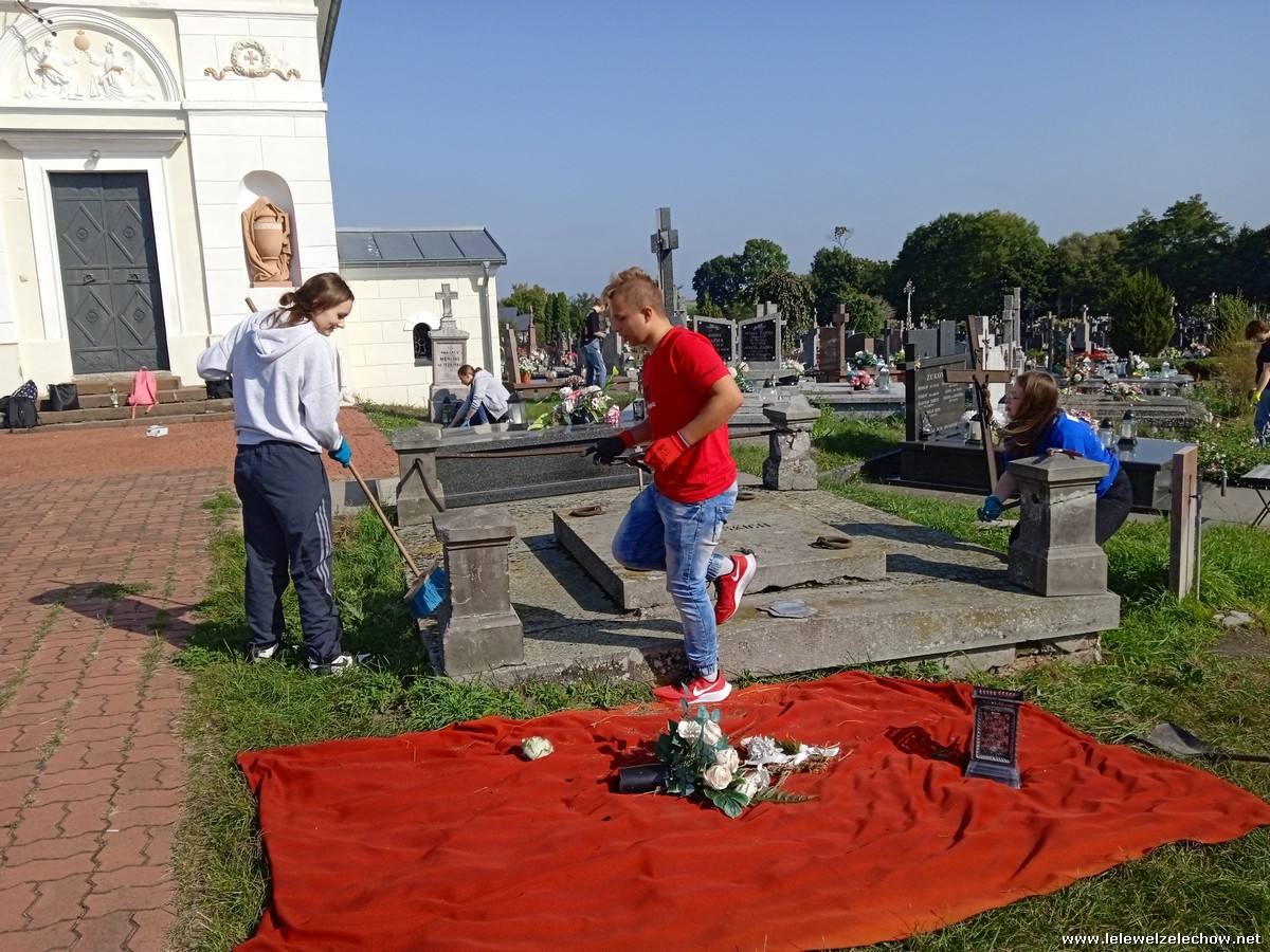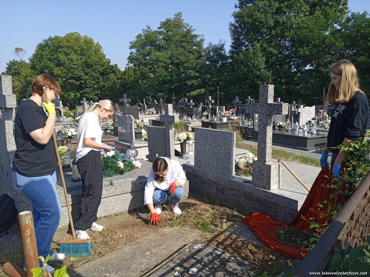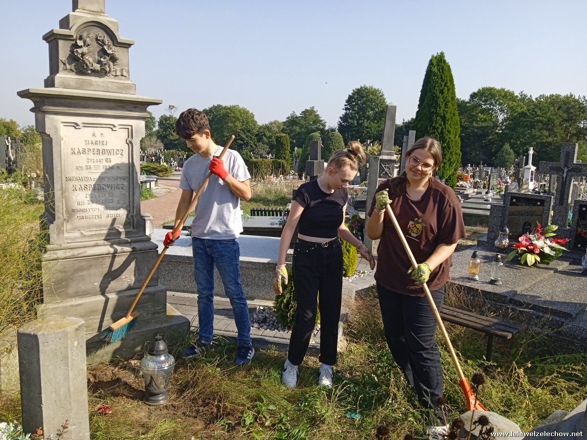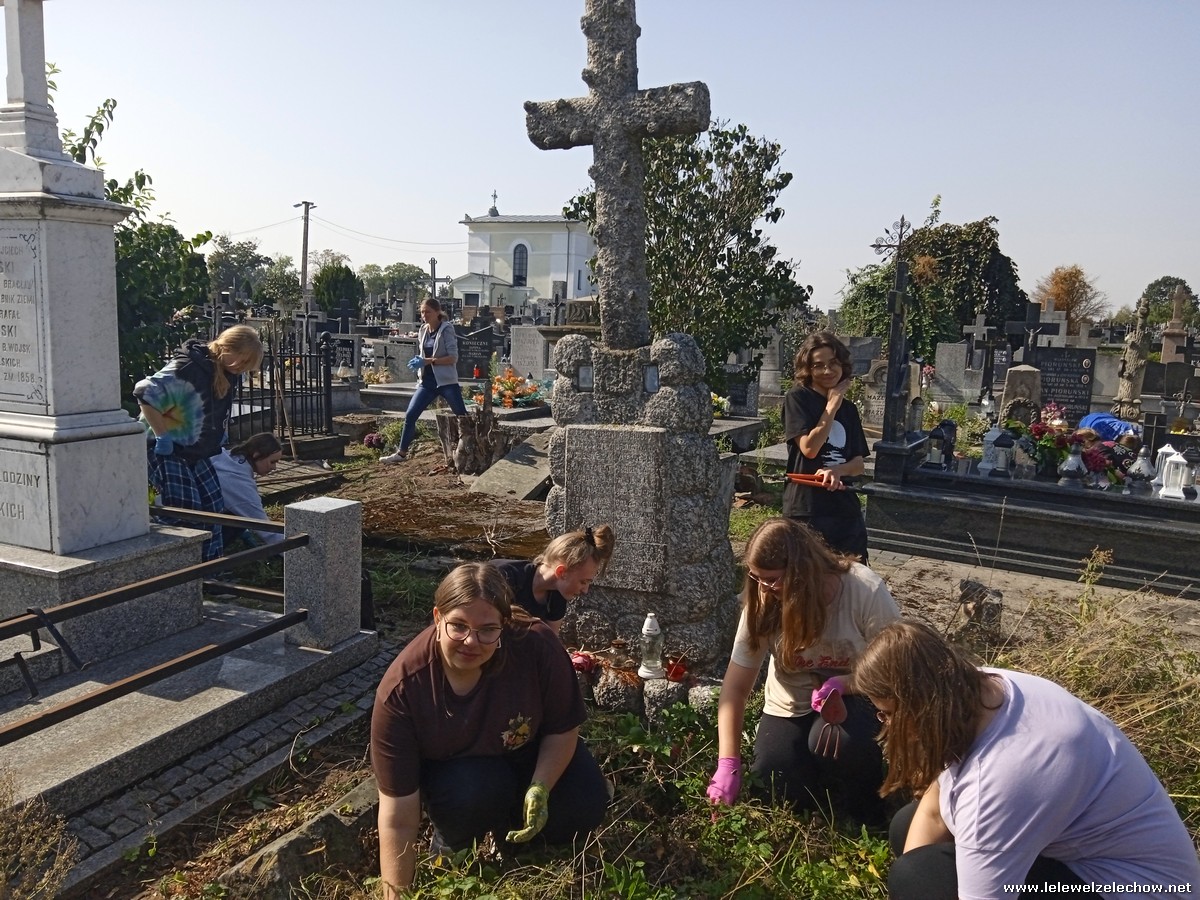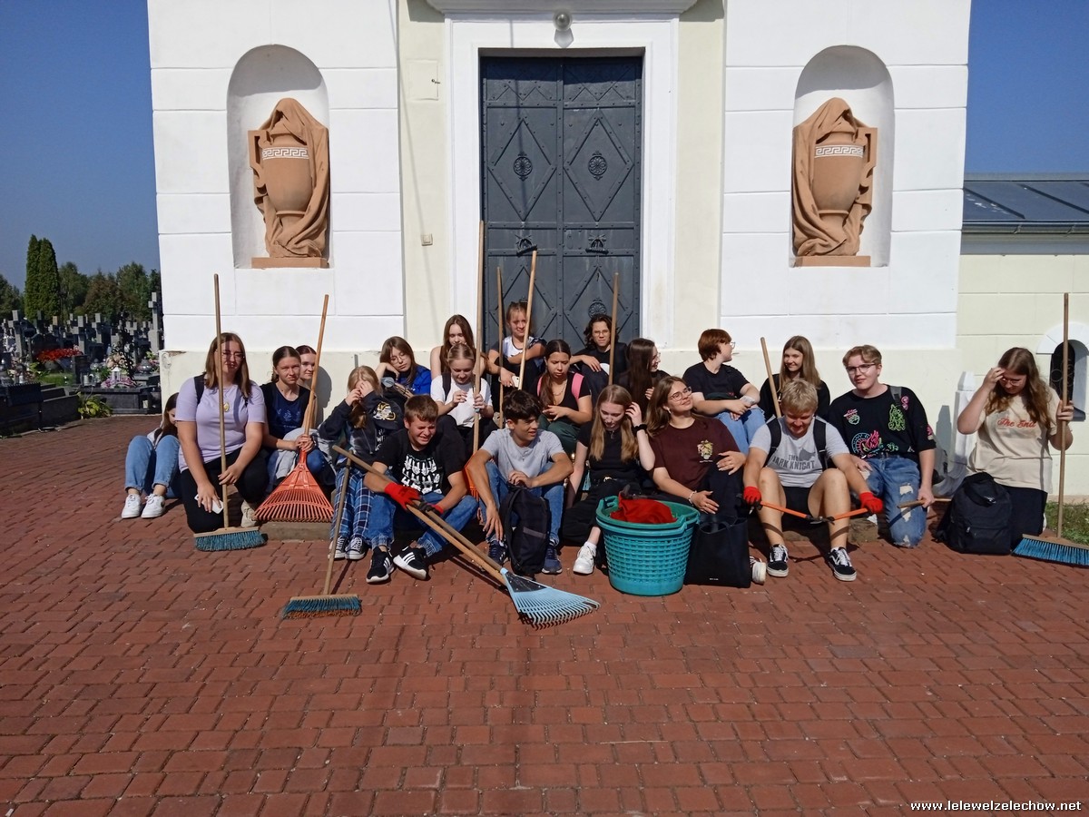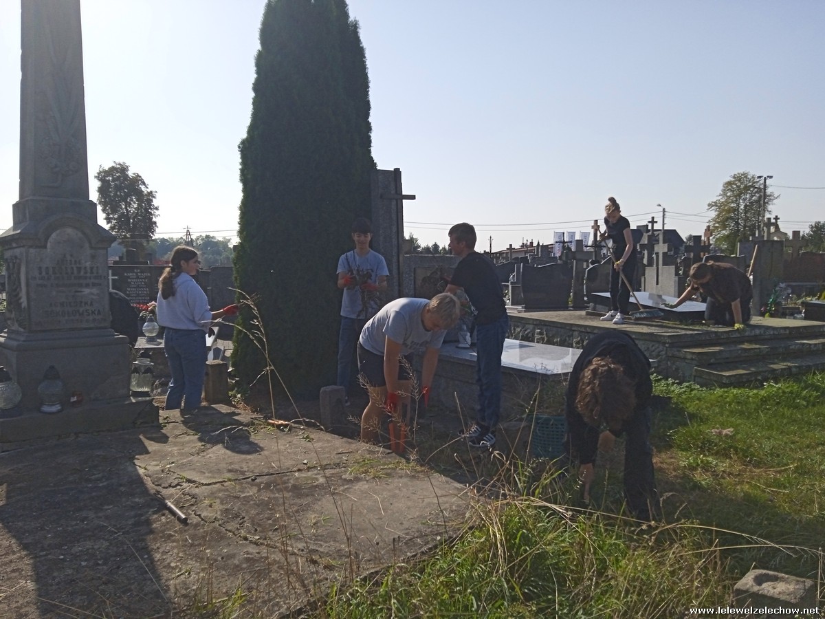 Tradycyjne sprzątanie zabytkowych nagrobków na cmentarzu w Żelechowie. Przy sprzyjającej wrześniowo-letniej pogodzie prace porządkowe, pod kierunkiem p.Urszuli Kobielus, wykonali uczniowie klas 2ab.