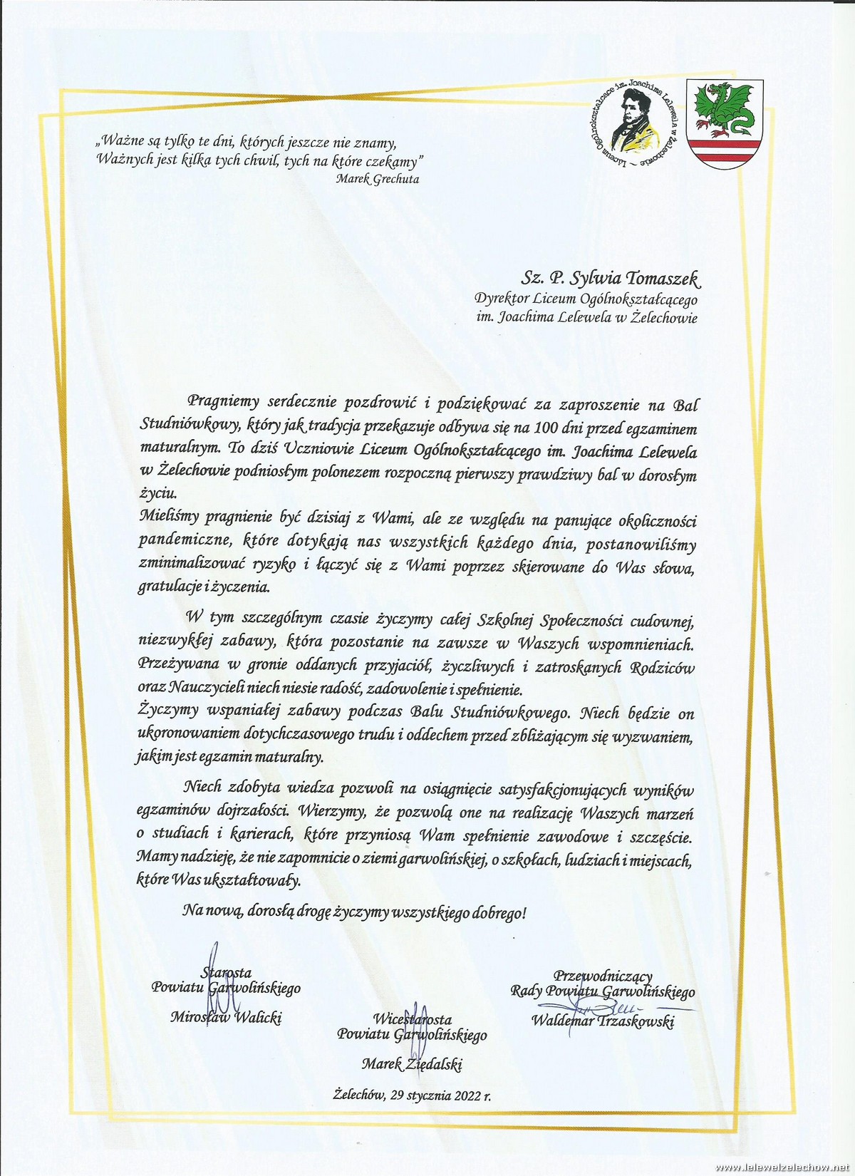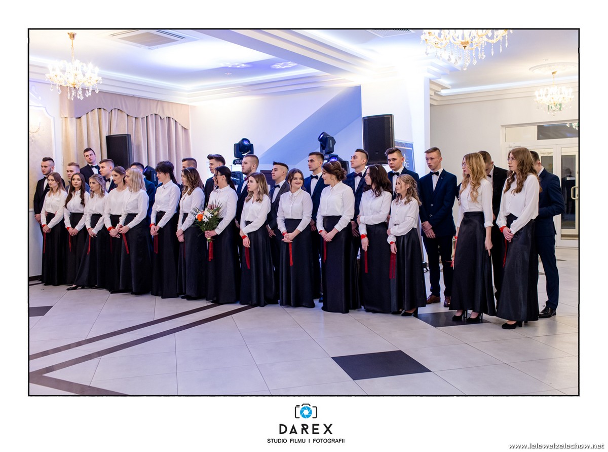 Młodzież z dwóch klas maturalnych wraz z wychowawczyniami, nauczycielami i rodzicami świętowała wyjątkową uroczystość - bal odbywający się tradycyjnie sto dni przed maturą. Rozpoczął się on przemówieniem pani Dyrektor, która po powitaniu zgromadzonych, podkreśliła wyjątkowy czas, jakim były lata nauki w liceum, integracja we wspólnych działaniach, pracach, spotkaniach. Odczytała także listy od Gości, którzy, ze względu na pandemiczną sytuację, nie mogli przybyć. Słowa do zgromadzonych skierowali: Poseł na Sejm Rzeczypospolitej Polskiej pan Grzegorz Woźniak, Starosta Powiatu Garwolińskiego pan Mirosław Walicki, Wicestarosta Powiatu Garwolińskiego pan Marek Ziędalski, Przewodniczący Rady Powiatu Garwolińskiego pan Waldemar Trzaskowski. Ksiądz Leszek Mućka zabrał głos w imieniu Księdza Eugeniusza Filipiuka, Proboszcza żelechowskiej parafii. Wszyscy podkreślali wyjątkowość i ulotność trwającej chwili, życzyli zgromadzonym udanej zabawy. Następnie wystąpiła przewodnicząca Komitetu Studniówkowego, pani Irena Jadanowska, dziękując nauczycielom za czas i uwagę poświęcone licealistom. Młodzież, zwracając się do grona pedagogicznego, pracowników szkoły oraz rodziców, wyraziła słowa wdzięczności za wsparcie w procesie nauczania, troskę i cierpliwość, którymi byli otaczani w czasie nauki w szkole średniej. Podkreślili świadomość tego, że za kilka miesięcy ich wspólna droga się zakończy i każdy, biorąc odpowiedzialność za własne życie, wybierze swoją własną ścieżkę. Obiecali też, że po balu studniówkowym skoncentrują się na nauce, aby jak najlepiej mogli poradzić sobie na majowych egzaminach maturalnych. Część oficjalną zakończył pięknie wykonany przez maturzystów polonez, przygotowany pod czujnym okiem nauczycielki wychowania fizycznego, pani Joanny Włodarczyk.