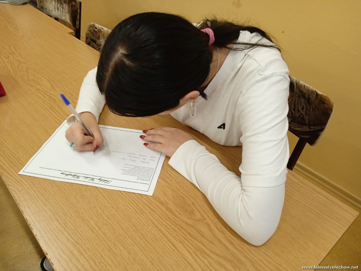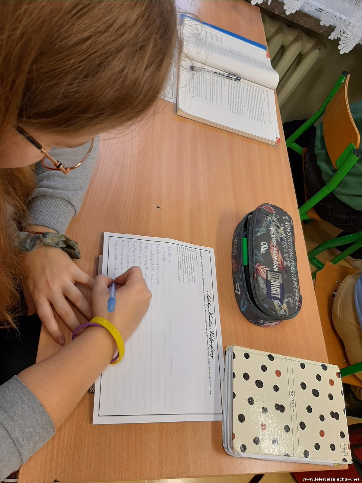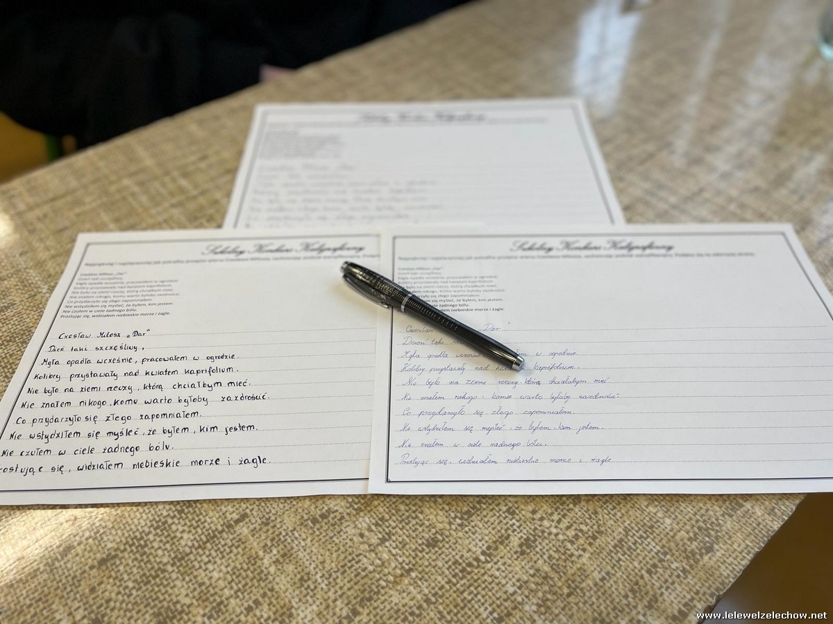 Kaligrafia to sztuka starannego i estetycznego pisania. Dawniej nauka pięknego pisania była obowiązkowym przedmiotem w szkole. Odręczne pismo kształtowało charakter, a także uczyło cierpliwości. Nie inaczej jest i dziś, dlatego 6 lutego zorganizowano w Lelewelu Szkolny konkurs kaligraficzny. Uczniowie mieli za zadanie jak najstaranniej i najpiękniej przepisać wiersz Czesława Miłosza pt. „Dar”. W konkursie uczestniczyli wszyscy uczniowie liceum. Każdy z nich starał się wykonać zadanie najlepiej jak potrafi. Pomysłodawczynią konkursu była pani Urszula Kobielus a nad jego przebiegiem czuwały panie polonistki – Magdalena Woźniak i Anna Włodarczyk. Niełatwo było zdecydować, kto pisze najpiękniej i najstaranniej, ale ostatecznie wyłoniono zwycięzców: