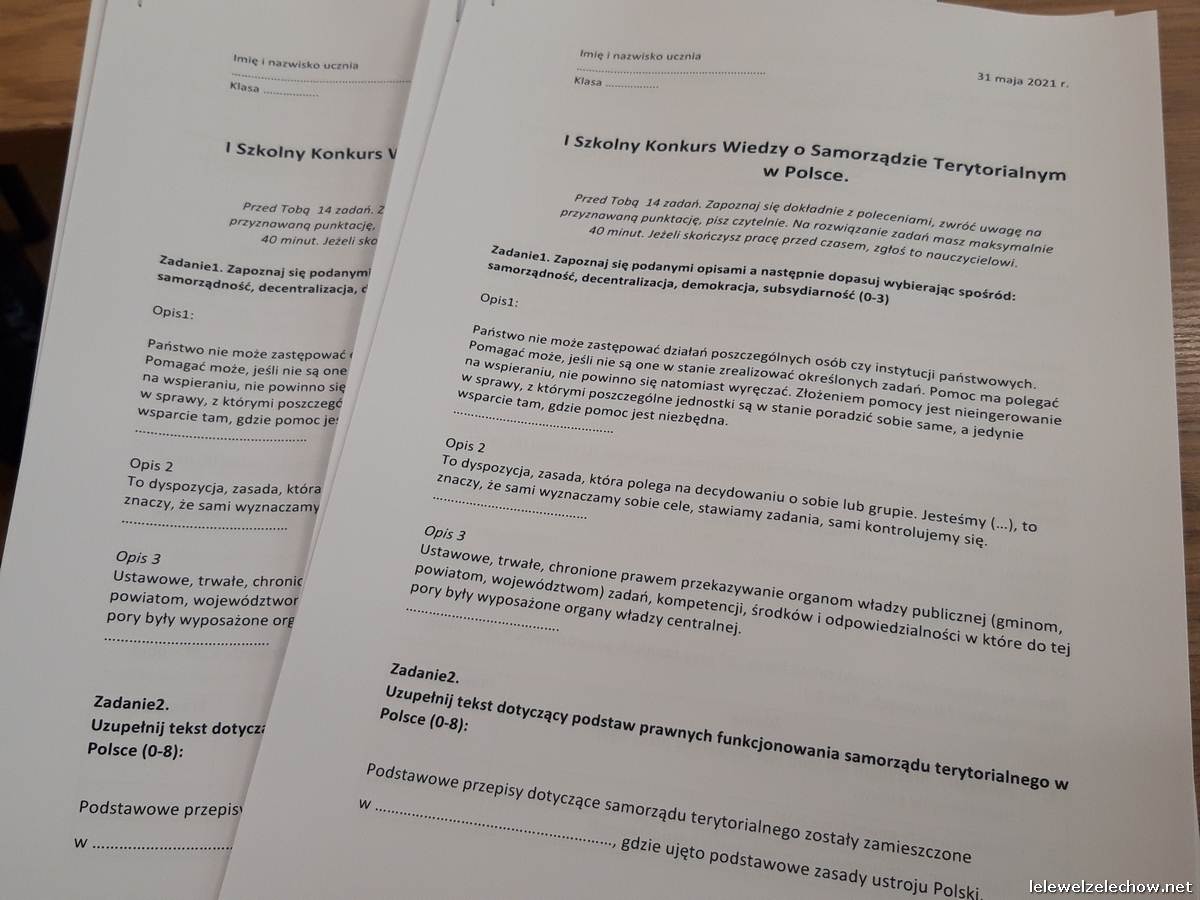 31 maja, po powrocie wszystkich uczniów do nauczania stacjonarnego, zorganizowany został I Szkolny Konkurs Wiedzy o Samorządzie terytorialnym w Polsce. Uczestniczyli w nim wszyscy uczniowie realizujący wiedzę o społeczeństwie na poziomie podstawowym bądź rozszerzonym. Konkurs miał formę testu składającego się z 14 pytań różnego typu i zróżnicowanego stopnia trudności, z którego można było uzyskać maksymalnie 57 punktów. A oto wyniki: