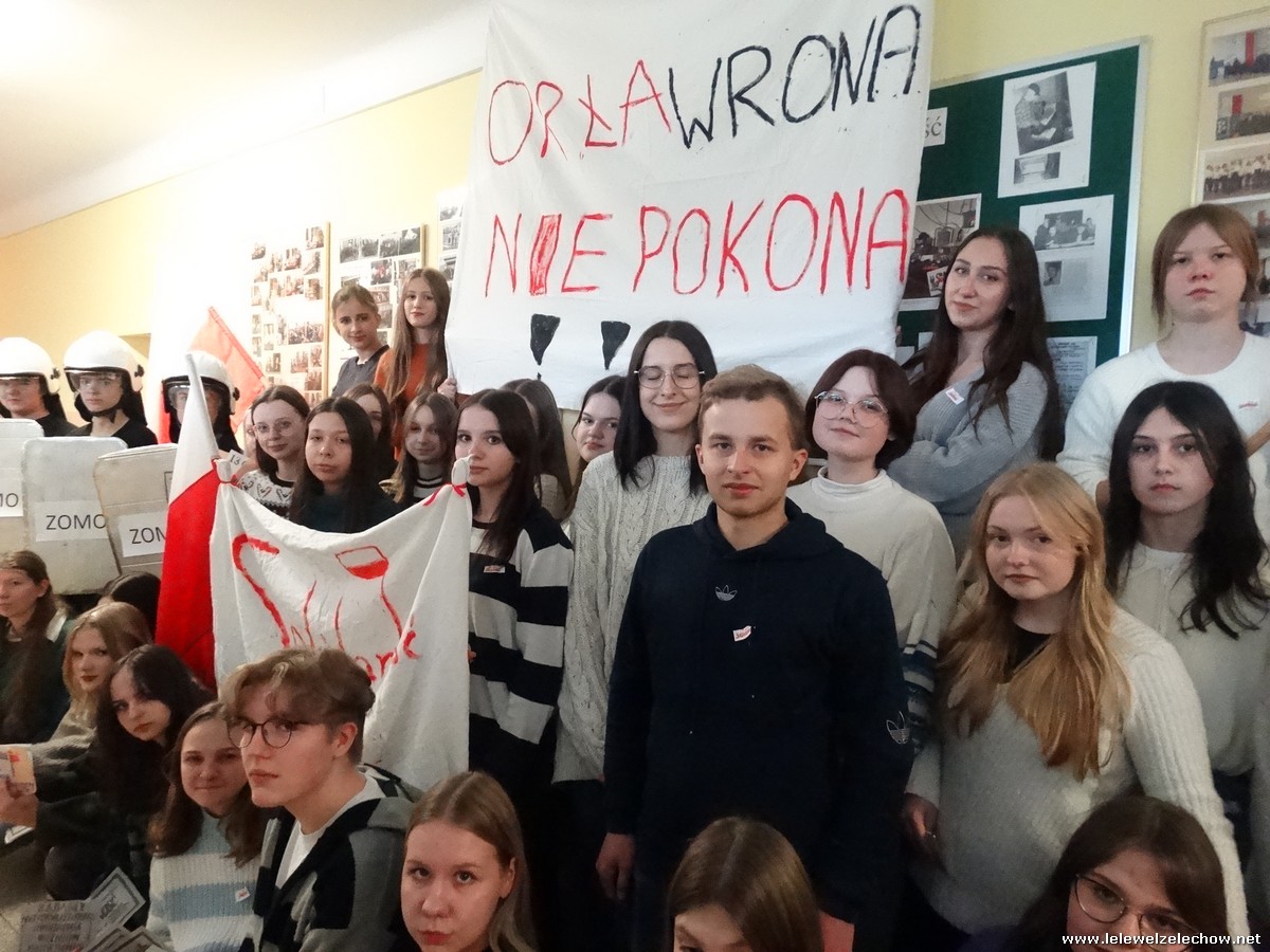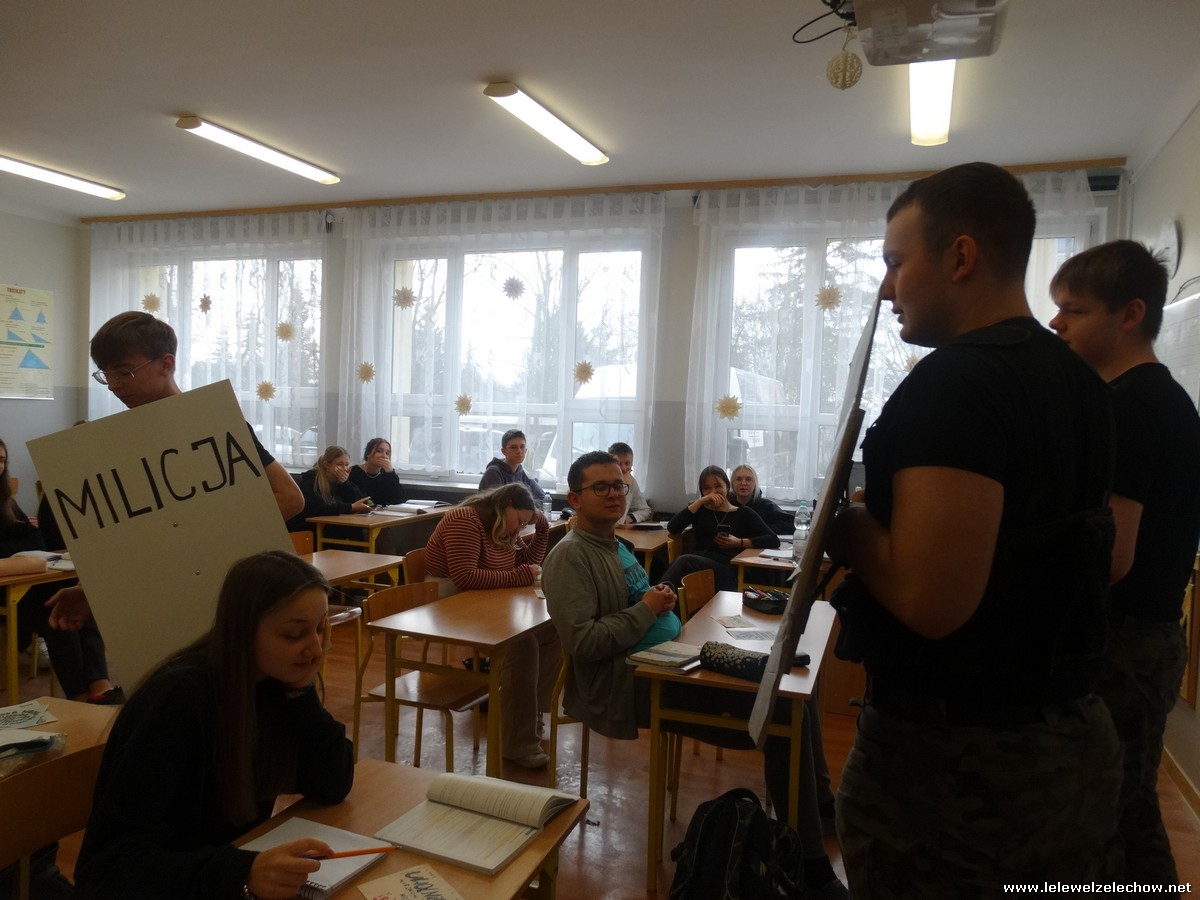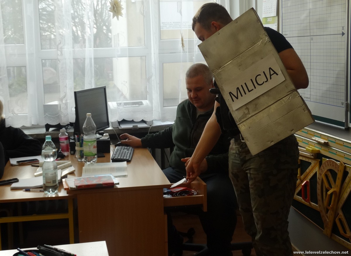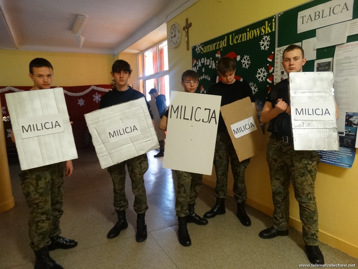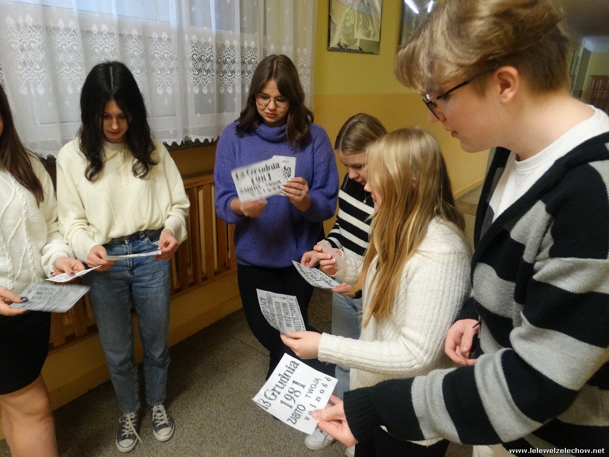 Pod tą nazwą odbyła się dziś na terenie naszej szkoły gra, mająca na celu upamiętnienie 42.rocznicy tych wydarzeń. Uczniowie klas 2a i 2b w ramach lekcji historii zainscenizowali wydarzenia charakterystyczne dla tamtych czasów - patrole milicyjne na ulicach, kontrole obywateli, kolejki przed sklepami i zakupy na kartki, działalność podziemnej ,, Solidarności,, i manifestacje.