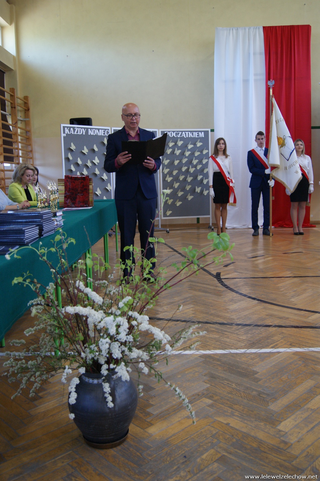 Następnie pani Dyrektor poprosiła o zabranie głosu Gości.Dyrektor Wydziału Edukacji, Kultury i Sportu pan Janusz Kowalski dziękował nauczycielom za doprowadzenie uczniów do końca edukacji i umożliwienie im startu w dorosłość. W imieniu Starosty Powiatu Garwolińskiego pana Mirosława Walickiego wręczył również nagrodę Alicji Mucha za najwyższe wyniki w nauce.
