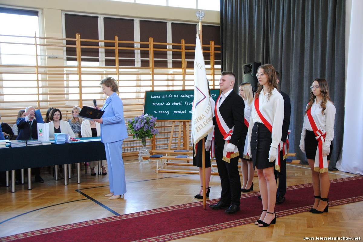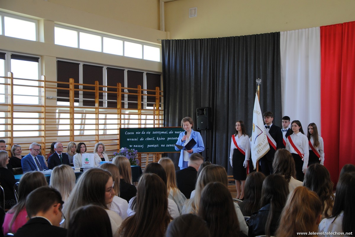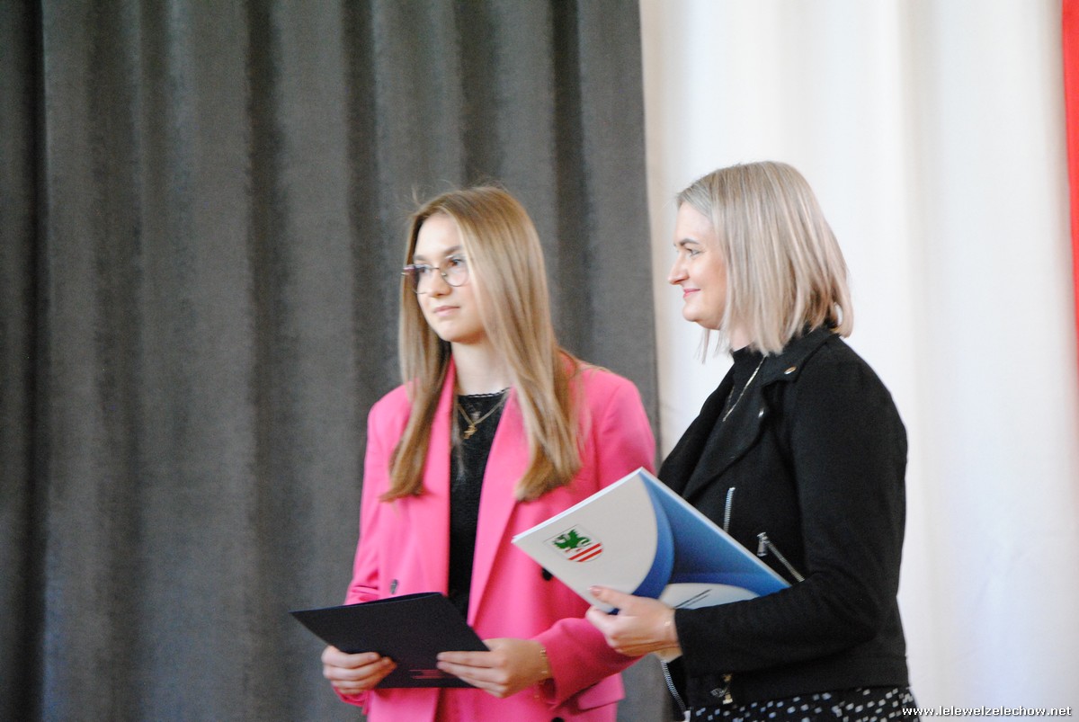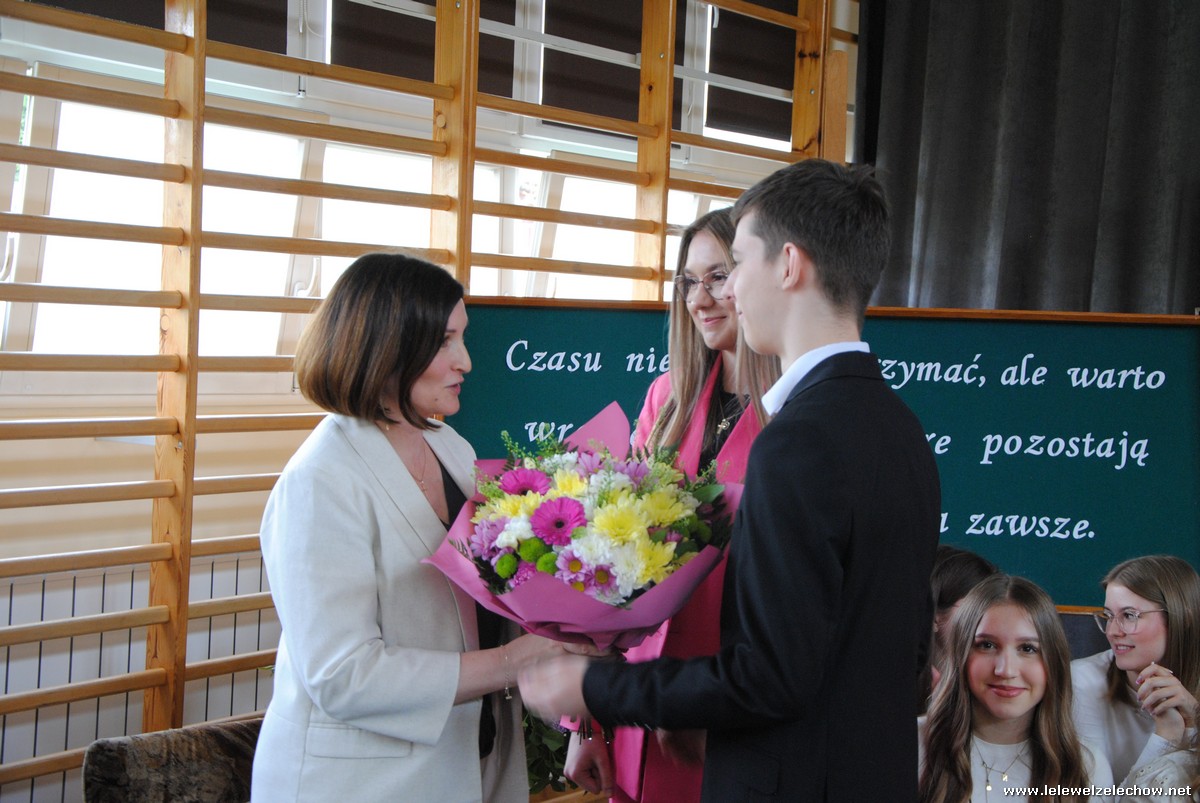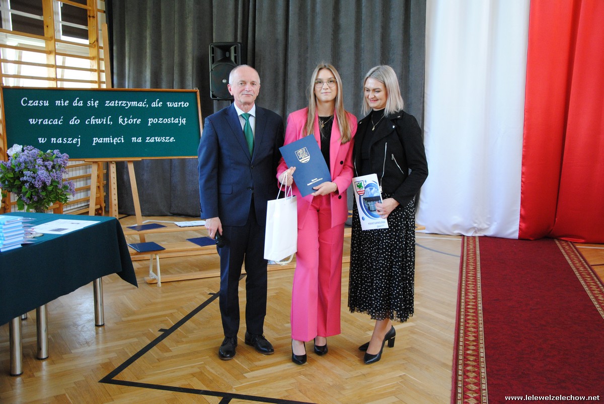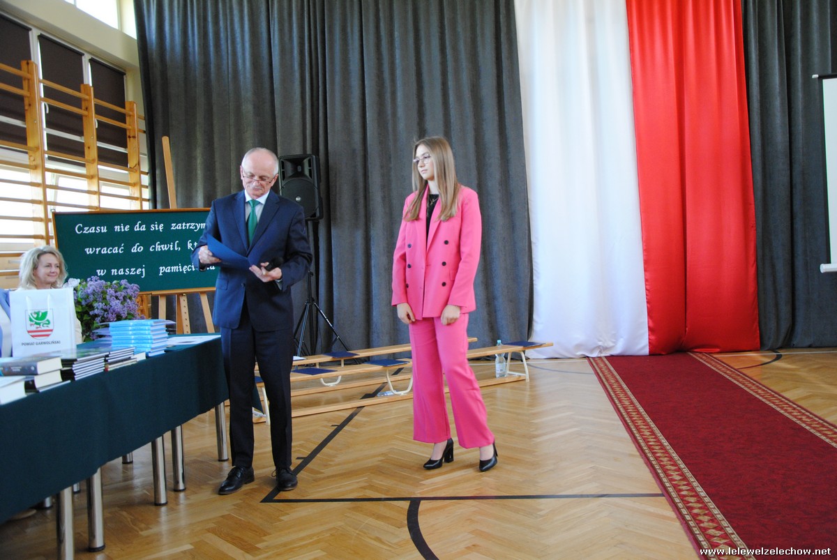 Głos zabrali również zaproszeni goście. Pan Krzysztof Ośka – członek zarządu Powiatu Garwolińskiego odczytał list pana Mirosława Walickiego - Starosty Powiatu Garwolińskiego, skierował do uczniów ciepłe słowa oraz wręczył nagrodę dla najlepszej uczennicy – Oliwii Długaszek. Pan Łukasz Bogusz – Burmistrz Żelechowa w swoim wystąpieniu podkreślił, że też jest absolwentem Lelewela i z sentymentem wspomina czas spędzony w tej szkole. Życzył maturzystom wielu sukcesów w dorosłym życiu oraz powodzenia na egzaminach maturalnych. Z rąk Pana Burmistrza nagrodę otrzymała Maria Majek za udział w uroczystościach lokalnych i godne reprezentowanie Gminy Żelechów.