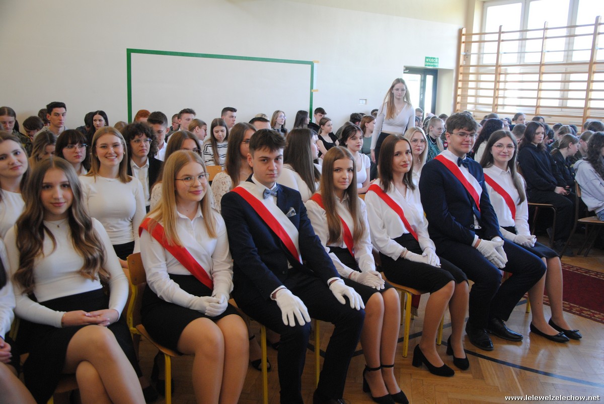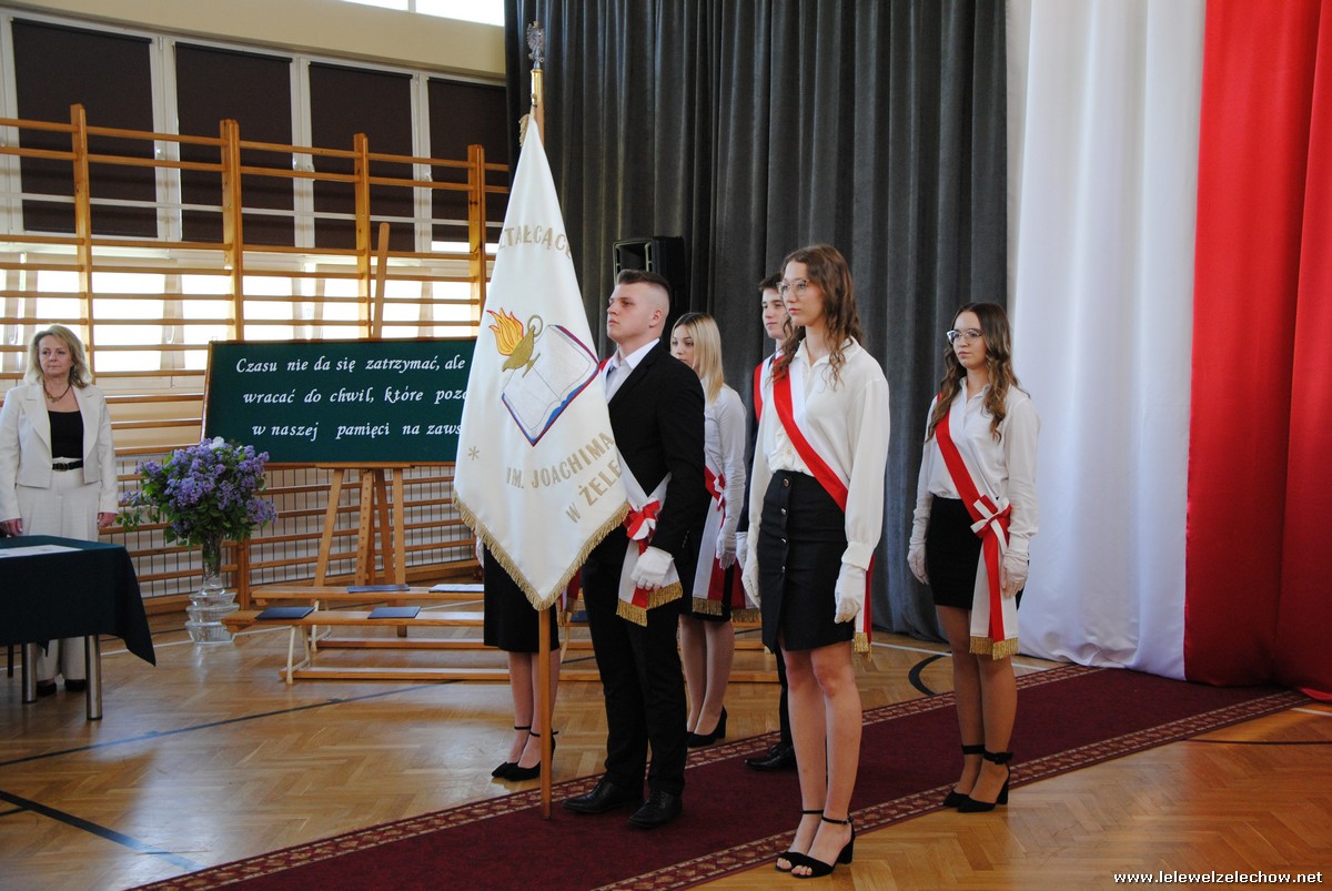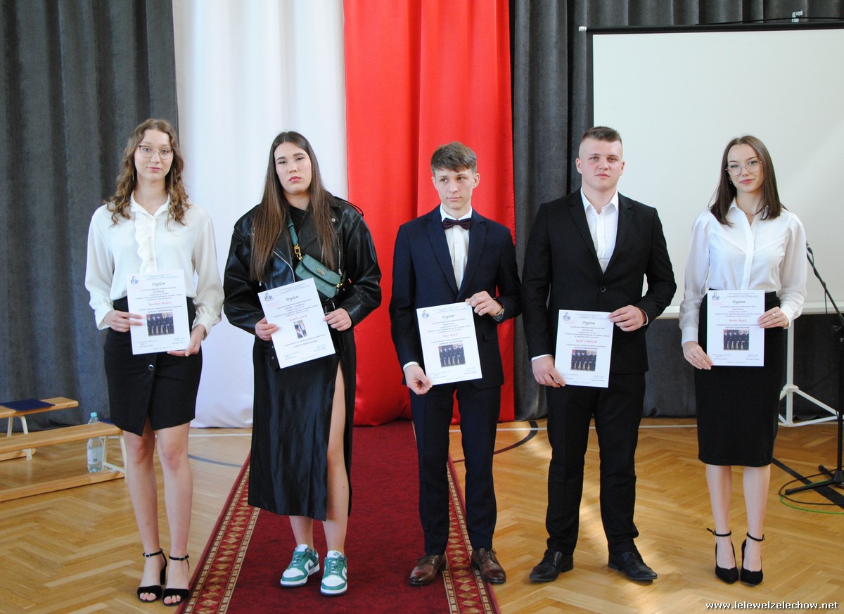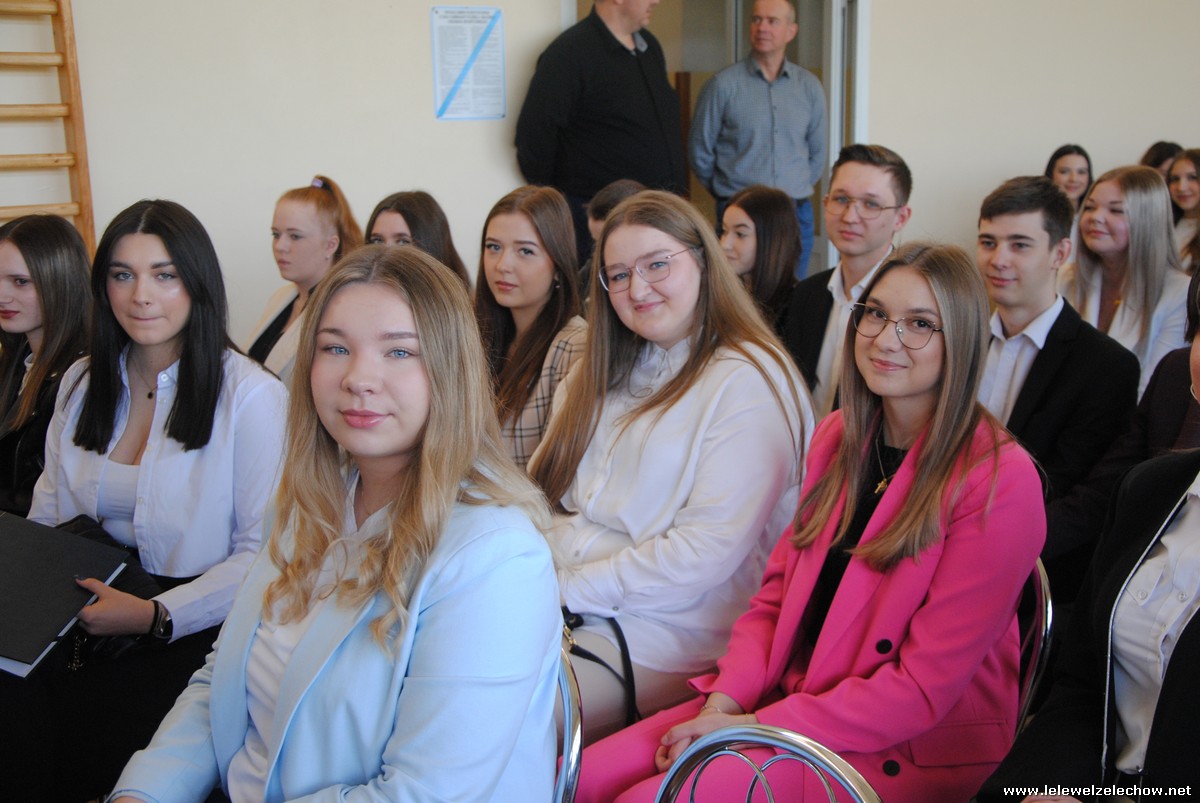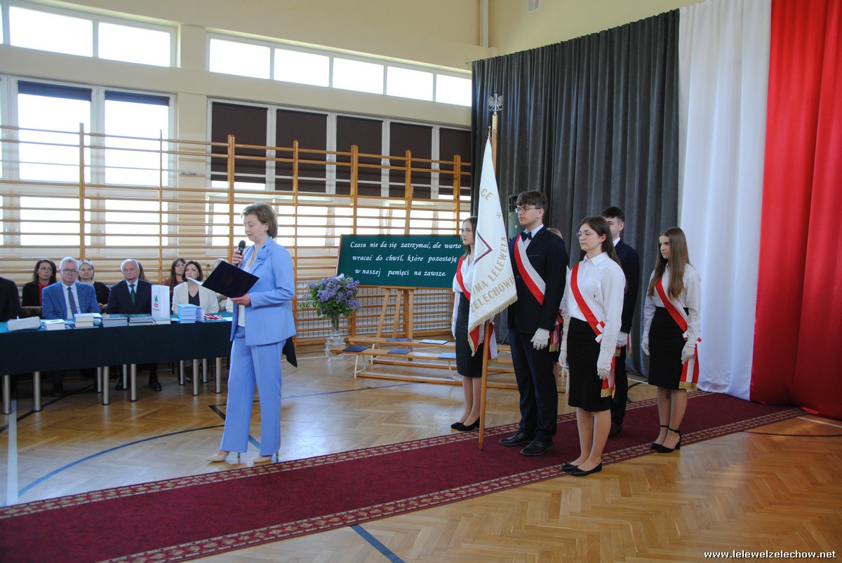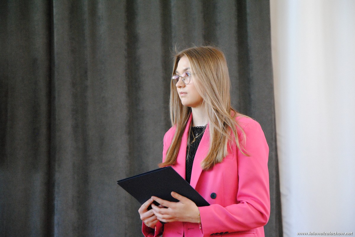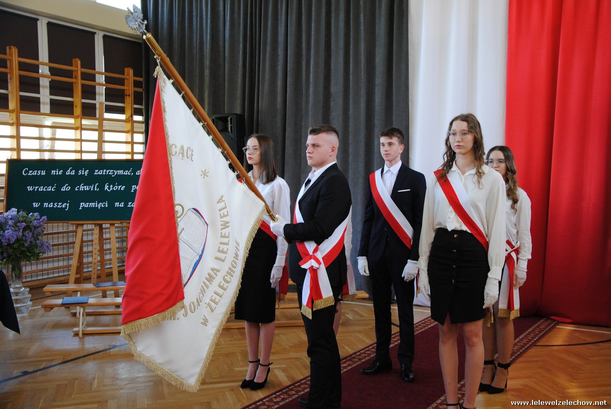 Głos zabrali również zaproszeni goście. Pan Krzysztof Ośka – członek zarządu Powiatu Garwolińskiego odczytał list pana Mirosława Walickiego - Starosty Powiatu Garwolińskiego, skierował do uczniów ciepłe słowa oraz wręczył nagrodę dla najlepszej uczennicy – Oliwii Długaszek. Pan Łukasz Bogusz – Burmistrz Żelechowa w swoim wystąpieniu podkreślił, że też jest absolwentem Lelewela i z sentymentem wspomina czas spędzony w tej szkole. Życzył maturzystom wielu sukcesów w dorosłym życiu oraz powodzenia na egzaminach maturalnych. Z rąk Pana Burmistrza nagrodę otrzymała Maria Majek za udział w uroczystościach lokalnych i godne reprezentowanie Gminy Żelechów.