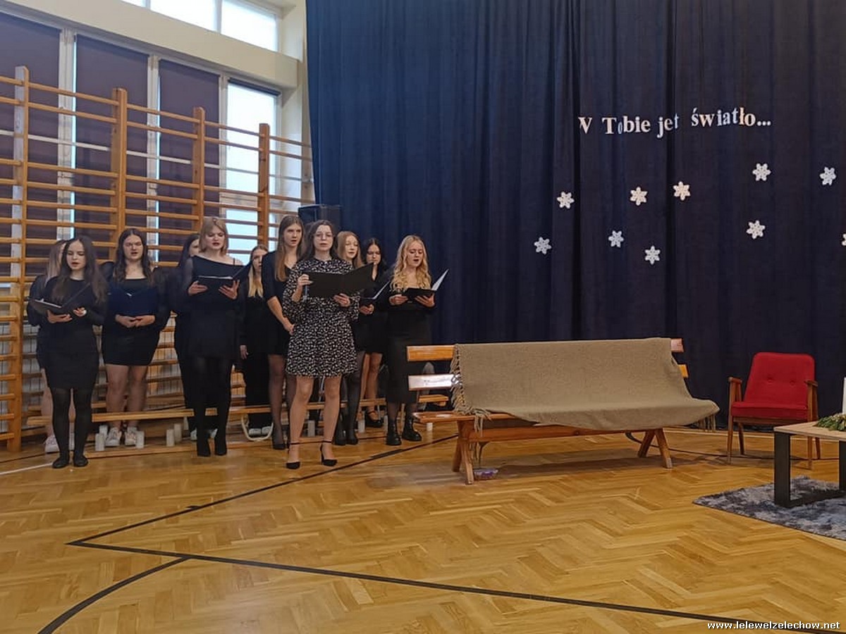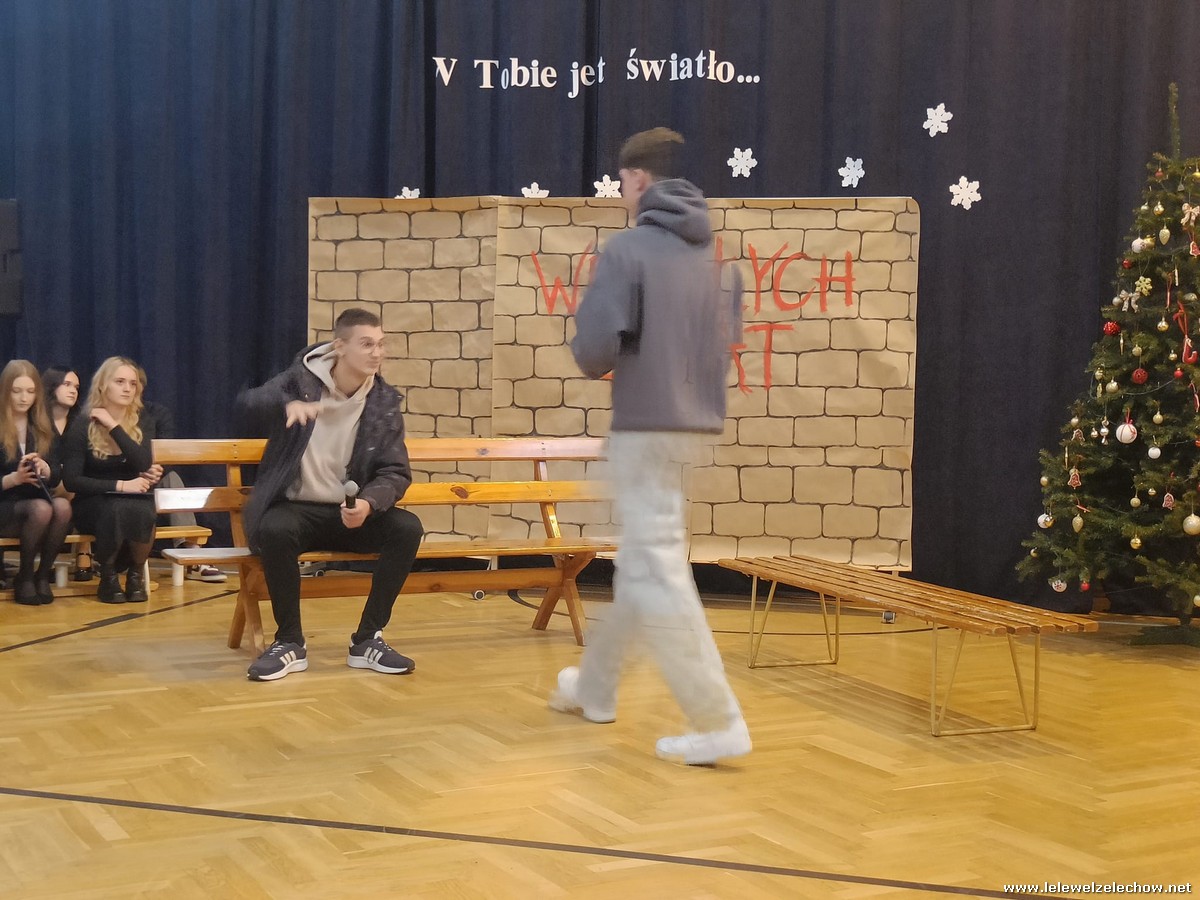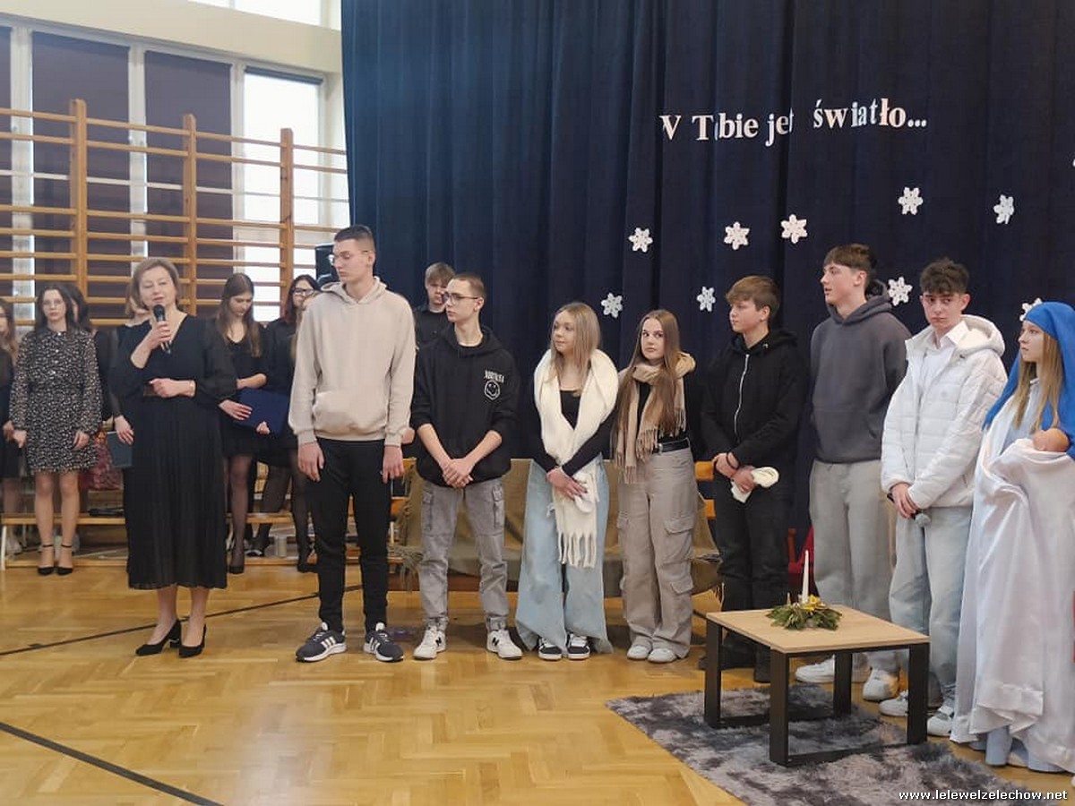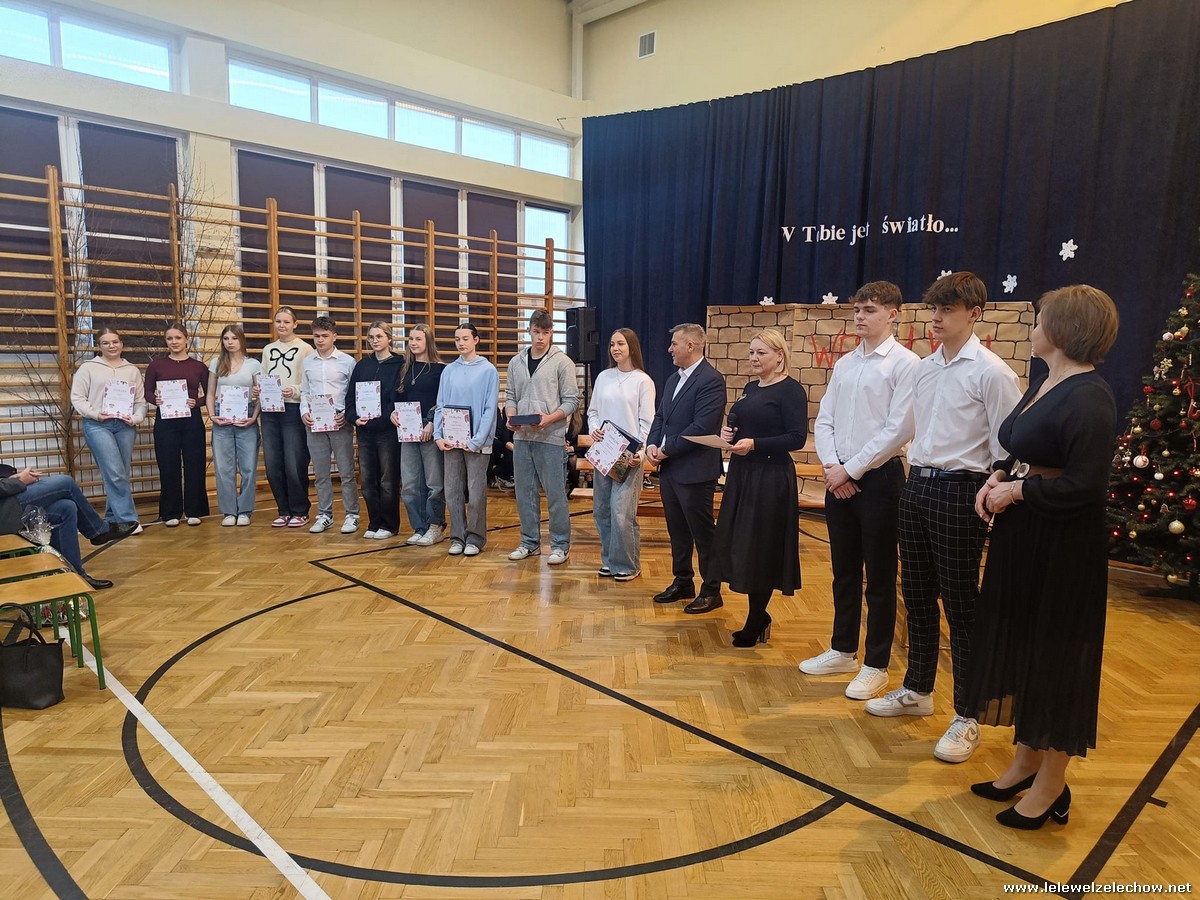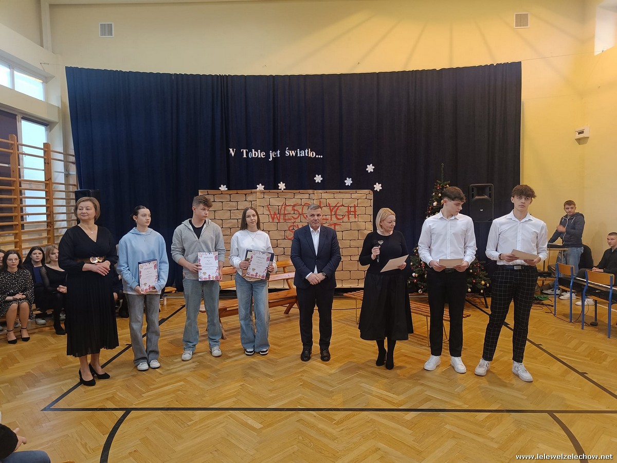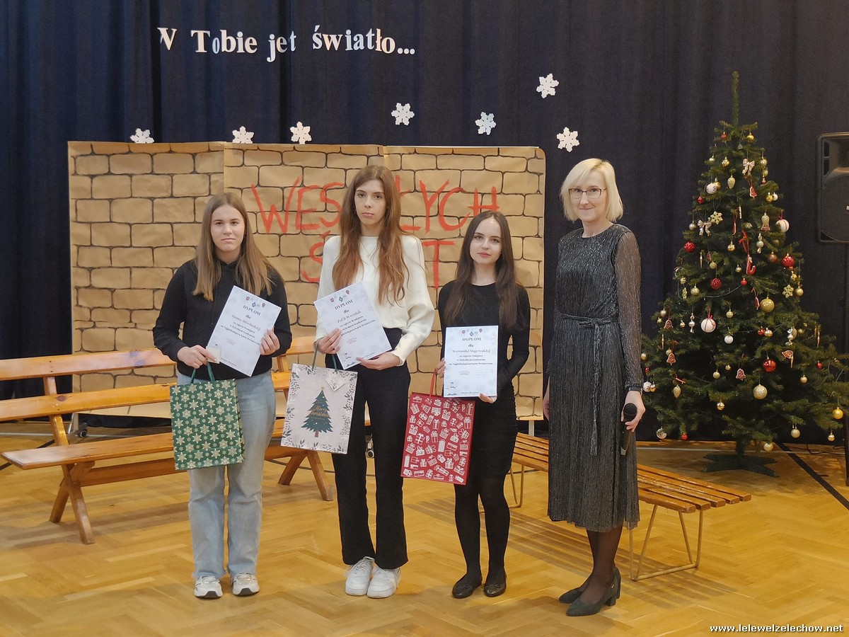 19 grudnia mieliśmy okazję obejrzeć przedstawienie wigilijne w wykonaniu uczniów klas drugich i trzecich naszego liceum wg scenariusza Adama Szafrańca. Narodzenie Pana Jezusa zostało tym razem osadzone we współczesności i wśród problemów dzisiejszych nastolatków, tych rodzinnych, duchowych, a nawet w obliczu śmiertelnej choroby. Przedstawienie przeplatały wzruszające występy chóru pod kierownictwem i przy akompaniamencie ks. Mariusza Rompy. Przedstawienie przygotowały panie: Anna Czarnecka- Górska i Anna Majewska. Wydarzenie uświetnił swoją obecnością Wicestarosta Powiatu Garwolińskiego- pan Mirosław Walicki oraz Dyrektor Wydziału Edukacji, Kultury i Sportu- pani Justyna Maszkiewicz. Przed częścią artystyczną wręczono nagrody za konkursy: stroików bożonarodzeniowych, za świąteczny wystrój sal oraz za najpiękniejszą kartę z życzeniami na Boże Narodzenie.