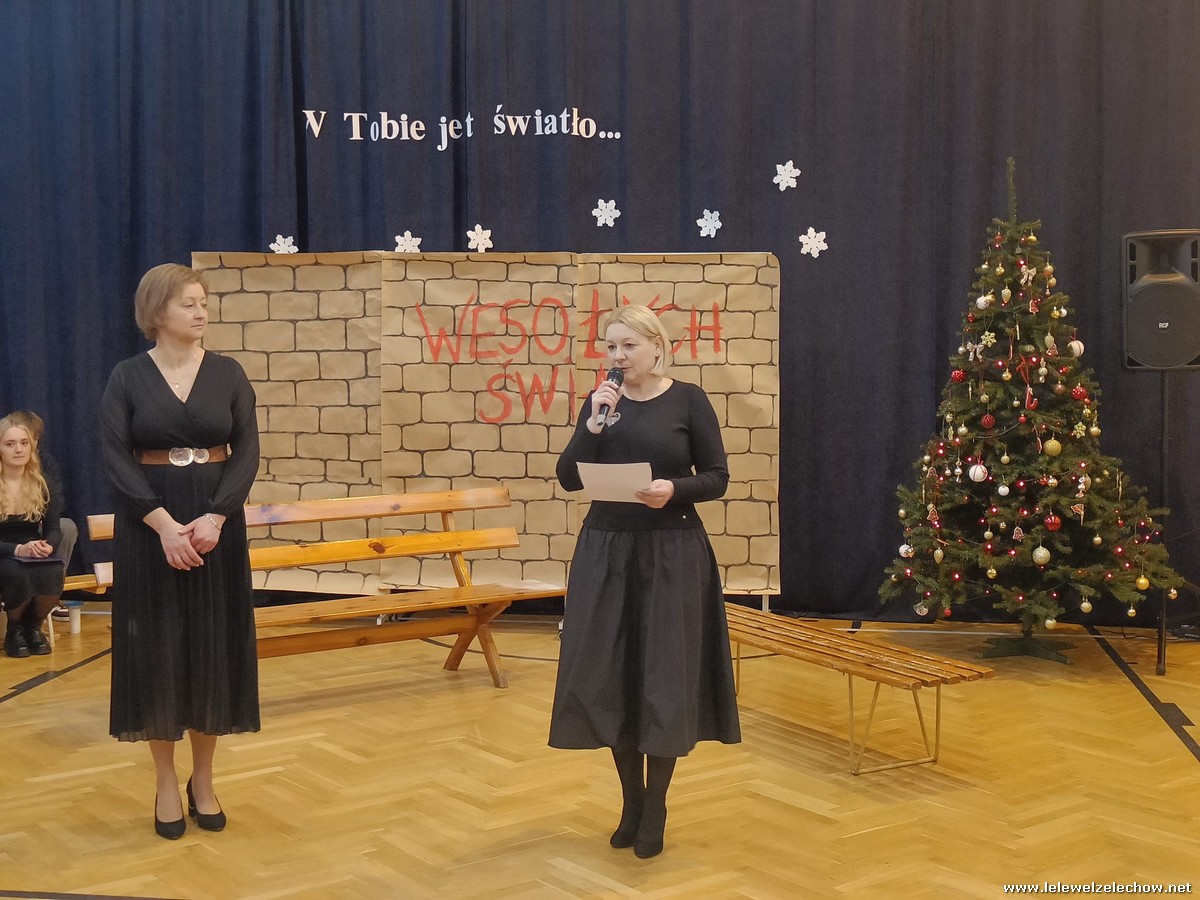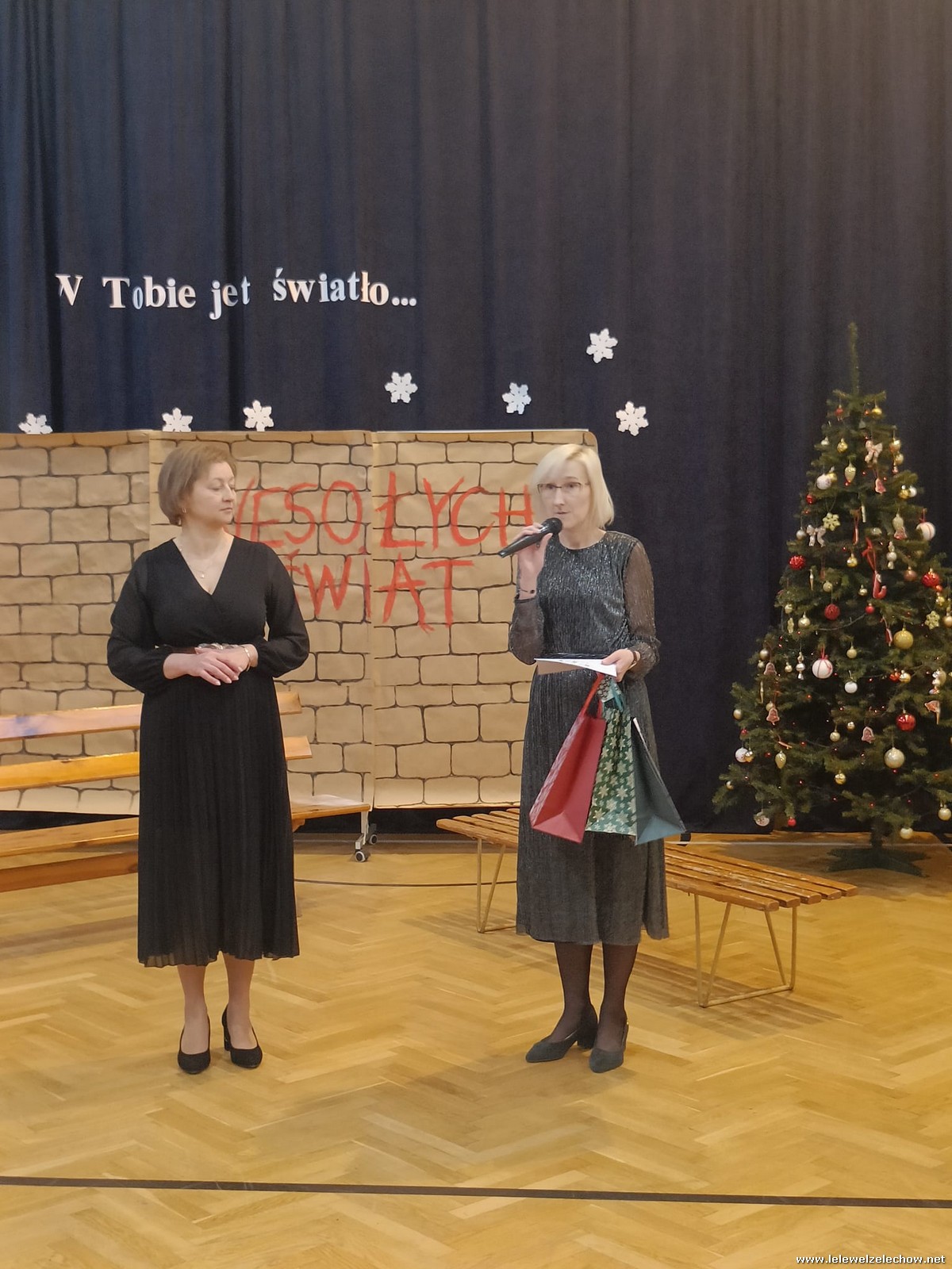 Natomiast po jasełkach pani Dyrektor Sylwia Tomaszek złożyła całej społeczności szkolnej i gościom życzenia świąteczne. Pan Wicestarosta i pani Dyrektor Wydziału Edukacji naszego powiatu podziękowali za zaproszenie na dzisiejszą uroczystość i przekazali bożonarodzeniowe życzenia w imieniu własnym oraz Starosty Powiatu Garwolińskiego- pani Iwony Kurowskiej. Również przedstawicielka Rady Rodziców złożyła na ręce pani Dyrektor słodki upominek i również życzyła radosnych świąt i szczęśliwego następnego roku. Na zakończenie głos zabrali przedstawiciele Samorządu Uczniowskiego., także z najlepszymi życzeniami radosnego świętowania w gronie najbliższych.
