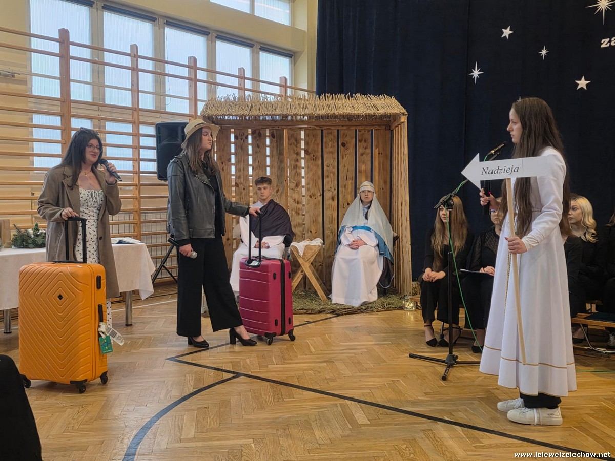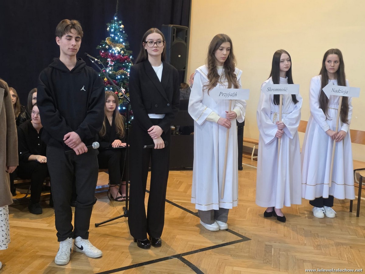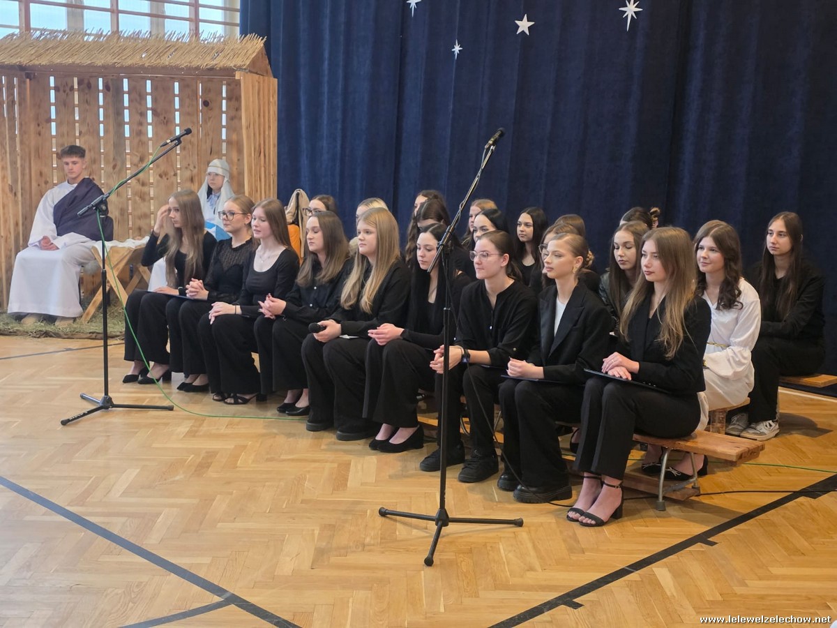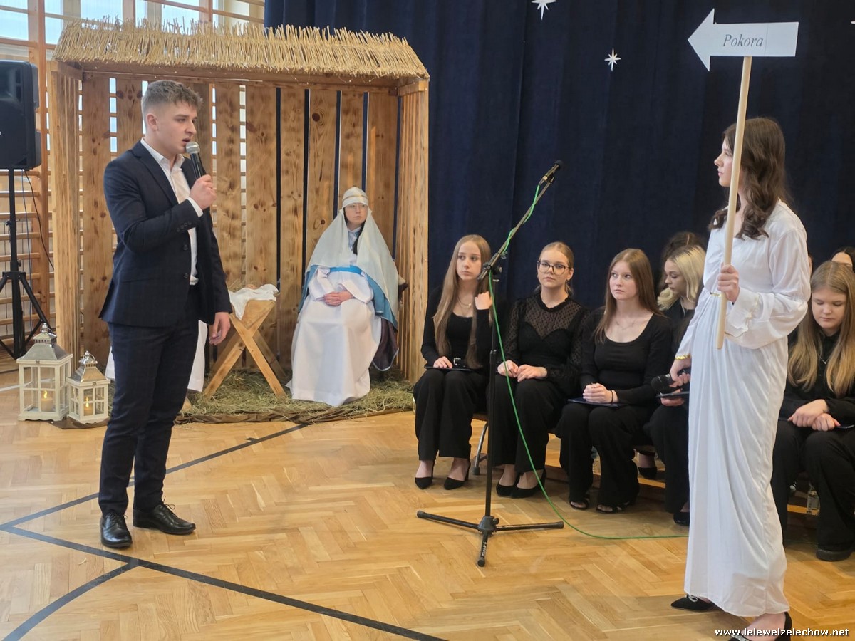 W tym roku jasełkom przyświecało hasło "W drodze do Betlejem". Uczniowie klas drugich w kilku scenkach uświadomili nam, że w świętach najważniejsze jest spotkanie z Bogiem i drugim człowiekiem, a Boże Narodzenie zaczyna się w naszych sercach. Solistki i chórek klas drugich przy wsparciu starszych koleżanek pięknie zaśpiewali kolędy. Po jasełkach goście, pani dyrektor Sylwia Tomaszek, przedstawiciele Samorządu Uczniowskiego złożyli życzenia, następnie ksiądz Mariusz Rompa odczytał fragment Pisma Świętego, po czym podzieliliśmy się opłatkiem.