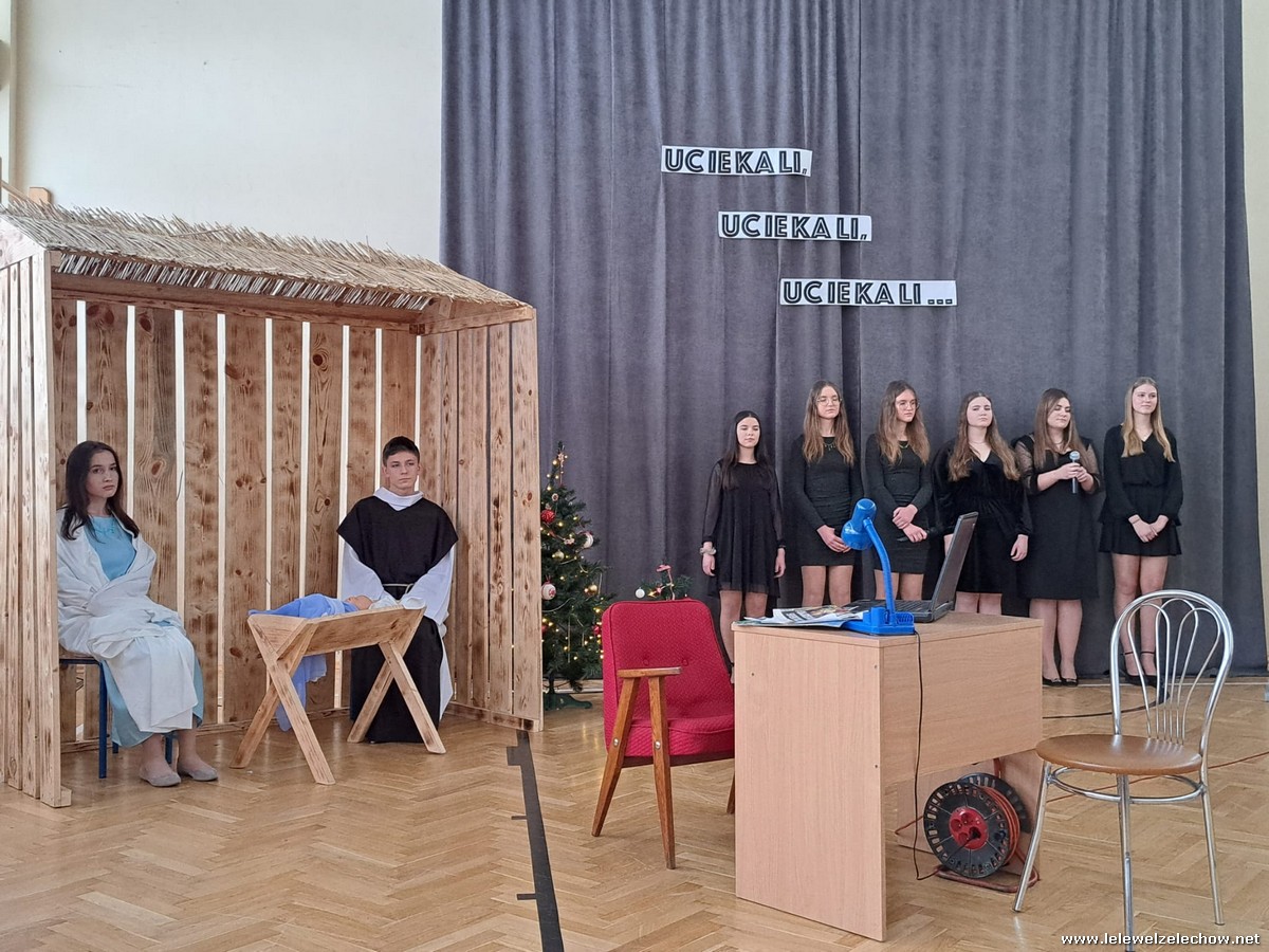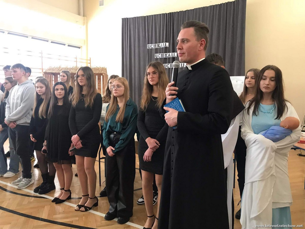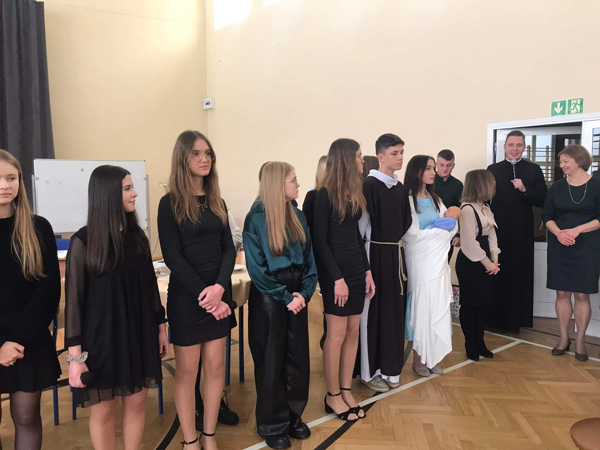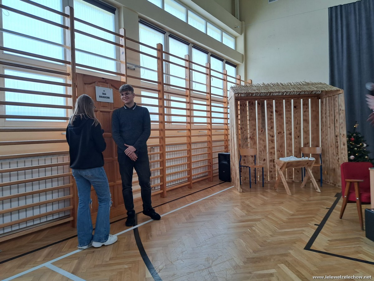W tygodniu poprzedzającym Święta Bożego Narodzenia w naszej szkole odbyła się niejedna wigilia. Każda z klas spotkała się przy wspólnym stole, podzieliła się opłatkiem, życząc sobie dobra i piękna. To wyjątkowy, magiczny czas, który wprowadza nas w te najbardziej wyczekiwane święta w roku. I mimo tego, że zarówno w szkole, jak i w domu obowiązków nie brakowało, to dało się odczuć radość i atmosferę oczekiwania. Szczególnie doświadczyliśmy tego podczas Szkolnej Wigilii, która była okazją do spotkania sią całej społeczności szkolnej. Mogliśmy podczas niej wejść głębiej w tajemnice Bożego Narodzenia i zastanowić się, co ten czas dla nas znaczy. Umożliwili nam to uczniowie, którzy pod opieką księdza Mariusza Rompy i pani Anny Majewskiej przygotowali piękny i pełen głębokich treści program artystyczny. Każdy z uczestników wigilii, o ile uważnie oglądał i słuchał, mógł odnaleźć w tym przedstawieniu siebie. Poszczególne scenki przeplatane kolędami były okazją do refleksji nad własnym życiem. Dziękujemy wszystkim uczestnikom programu za tak wiele mądrych myśli i wzruszeń, za piękny śpiew i akompaniament, za wymowną scenkę spotkania przy stajence. Podczas spotkania nie zabrakło też kolęd i życzeń, które składaliśmy sobie nawzajem. Do całej społeczności szkolnej zwrócili się: Pani Dyrektor, Ksiądz prałat Eugeniusz Filipiuk, Ksiądz Mariusz Rompa, Samorząd Uczniowski. Niech święta Bożego Narodzenia napełnią nas nadzieją, dobrem, życzliwością i abyśmy potrafili dzielić się tym wszystkim z drugim człowiekiem.