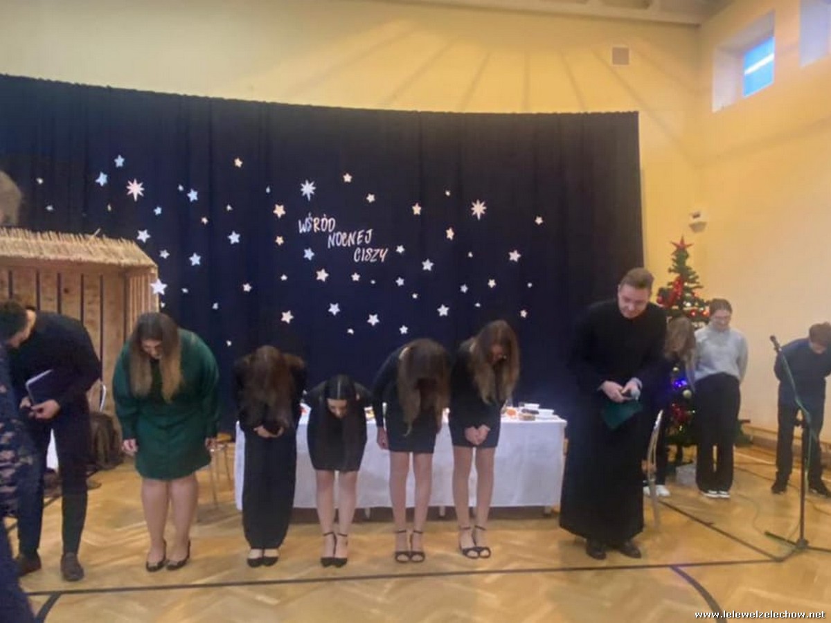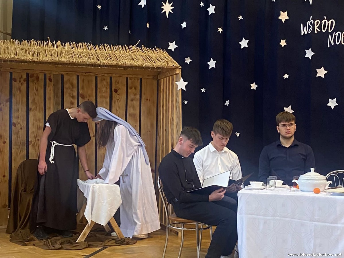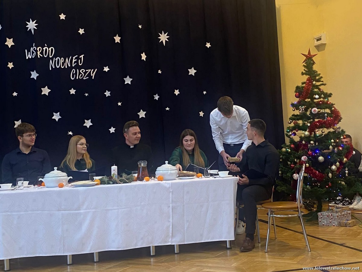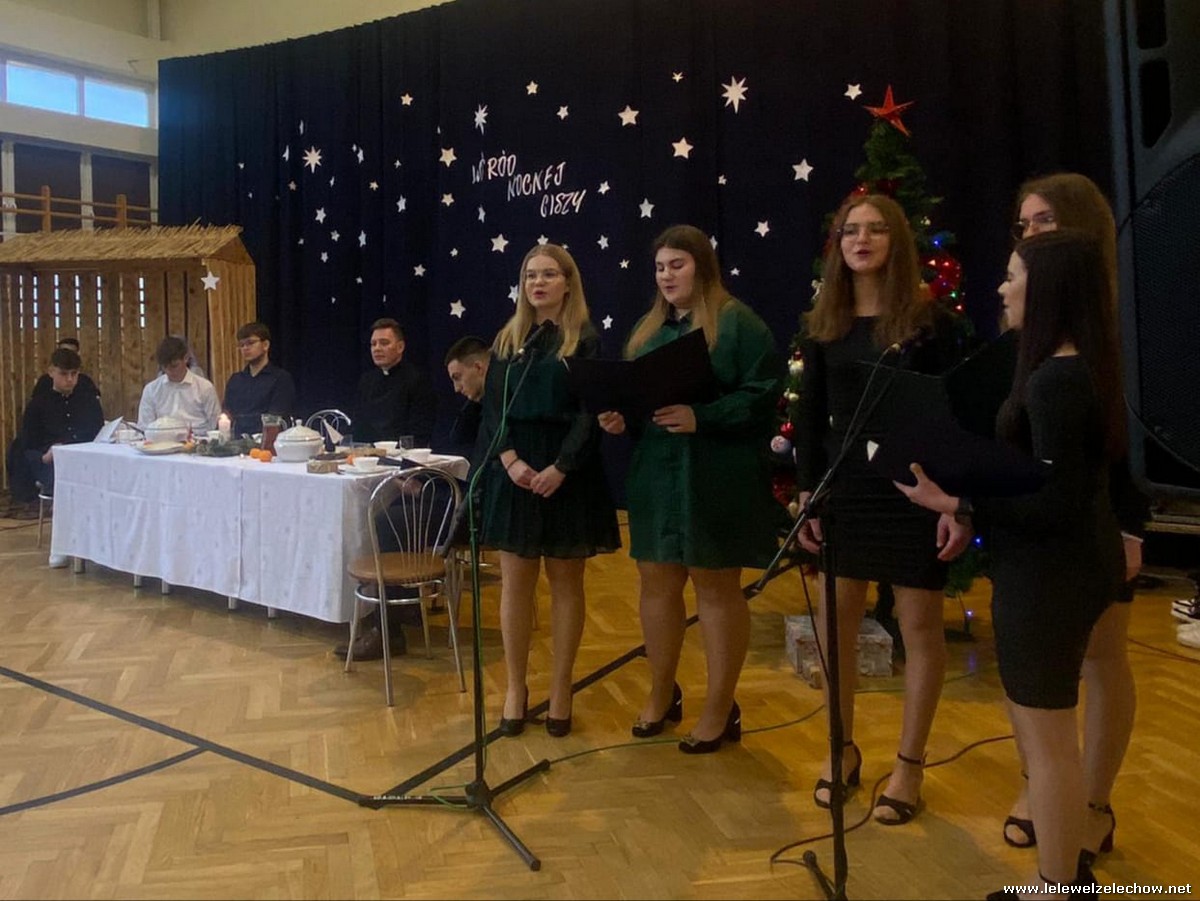 Tak było i tym razem. Piękny śpiew kolęd i pastorałek wprowadził nas w świąteczny nastrój, a ksiądz Mariusz z uczniami klas III przypomniał nam świąteczne tradycje, np. dlaczego na święta ubiera się choinkę, skąd wziął się zwyczaj obdarowywania innych prezentami i jaką symbolikę niesie ze sobą pusty talerz na wigilijnym stole. Przygotowany program i życzenia, które złożyli: obecny na uroczystości pan Łukasz Bogusz – burmistrz Żelechowa, pani dyrektor, ksiądz Mariusz, samorząd szkolny zachęcały do tego, aby nie koncentrować się na tym, co zewnętrzne, ale spojrzeć głębiej – w siebie, w drugiego człowieka. I – tak jak to było śpiewane podczas spotkania - „choć tyle żalu w nas i gniew uśpiony trwa, przekażmy sobie znak pokoju, przekażmy sobie znak”. Może właśnie po to jest Wigilia.